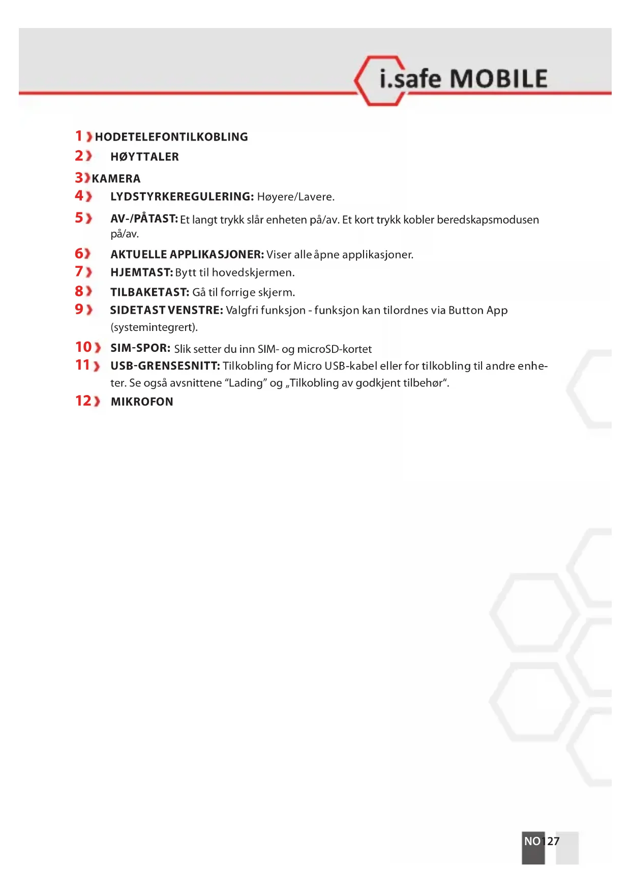 Når enheten slås på første gang, må du følge instruksjonene på skjermen. Mer informasjon om drift av enheten nner du på www.isafe-mobile.com/en/support/service under menyelementet „FAQ“. Detaljert informasjon om betjening av Android-operativsystemet nner du på: https://support.google.com/android MERK Mikrofonen er plassert på bunnen av enheten. Sørg for at mikrofonen ikke er tildekket for optimal kommunikasjon.NO 133