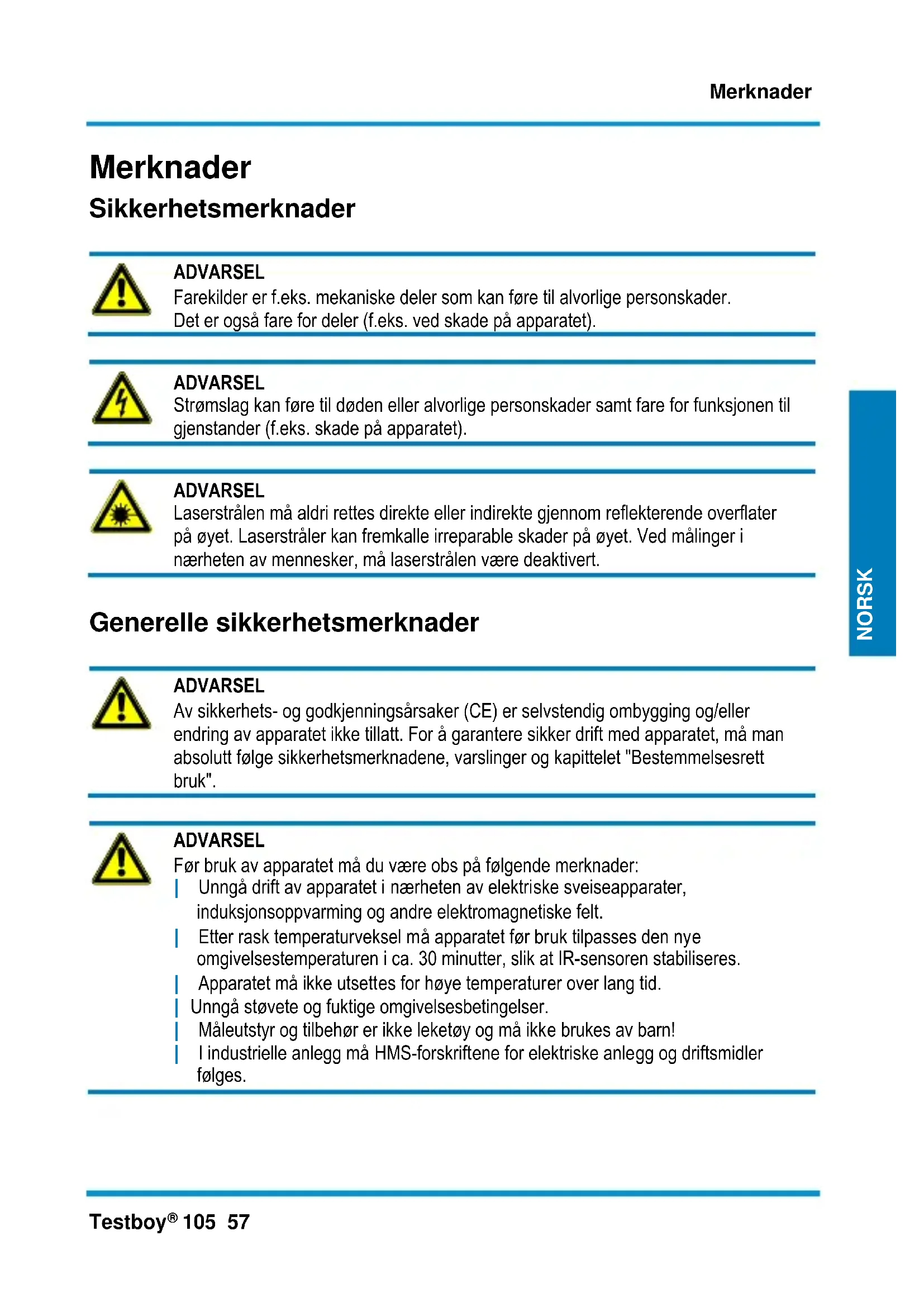 ADVARSEL Før bruk av apparatet må du være obs på følgende merknader: | Unngå drift av apparatet i nærheten av elektriske sveiseapparater, induksjonsoppvarming og andre elektromagnetiske felt. | Etter rask temperaturveksel må apparatet før bruk tilpasses den nye omgivelsestemperaturen i ca. 30 minutter, slik at IR-sensoren stabiliseres. | Apparatet må ikke utsettes for høye temperaturer over lang tid. | Unngå støvete og fuktige omgivelsesbetingelser. | Måleutstyr og tilbehør er ikke leketøy og må ikke brukes av barn! | I industrielle anlegg må HMS-forskriftene for elektriske anlegg og driftsmidler følges.Merknader 58 Testboy