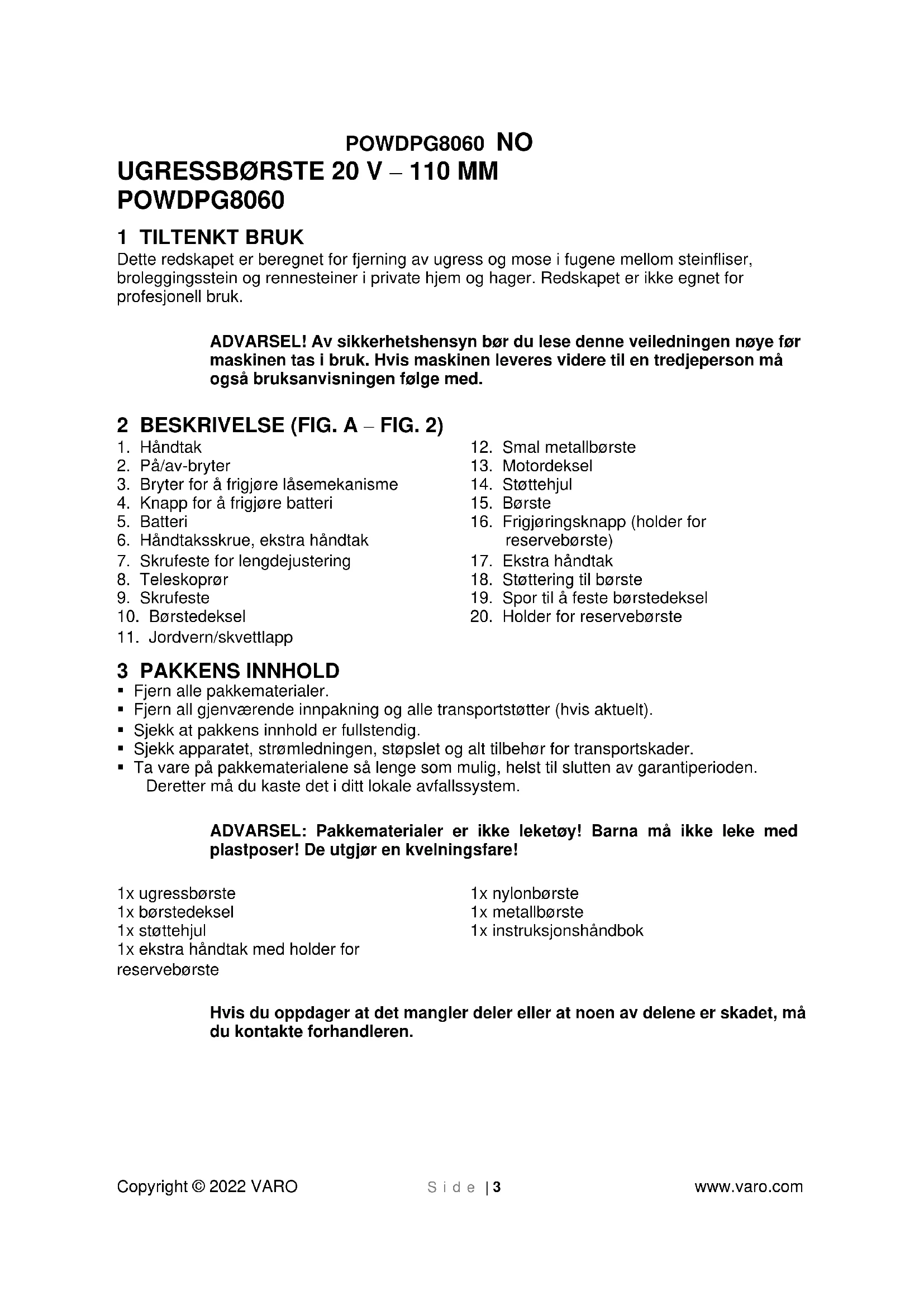 - Inspiser alltid børsten før du starter redskapet. Bruk aldri skadede børster. Skift ut skadede eller slitte børster. 12 TEKNISKE DATA Type POWDPG8060 Spenning 20 V Børstestørrelse 110 mm Hastighet uten last 1400 /min 13 STØY Støyemisjonsverdier målt i samsvar med relevant standard. (K=3) Lydtrykknivå LpA 69 dB(A) Lydeffektnivå LwA 86 dB(A) VIKTIG! Bruk hørselsvern når lydtrykket er over 85 dB(A). aw (Vibrasjon) Maks. 0,6 m/s² K = 1,5 m/s²POWDPG8060 NO Copyright © 2022 VARO S i d e | 11 www.varo.com 14 GARANTI