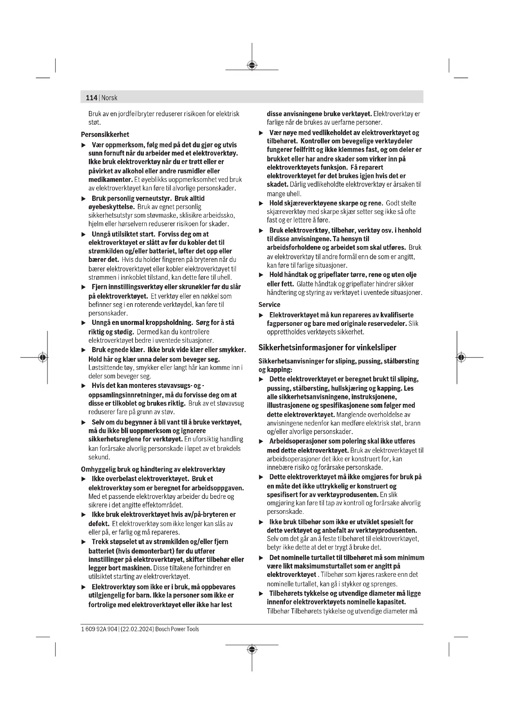 For å demontere (se bildeB) trykker du på knappen på festebøylen (➊) og svinger den tilbake (➋). Trekk beskyttelsen(9) fra vernedekselet (7) (➌). Deksel for kapping av plast Sett beskyttelsen for kapping(9) av plast på vernedekselet for sliping(7) (se bildeC). Beskyttelsen(9) festes hørbart på vernedekselet(7). For å demontere (se bildeD) løsner du beskyttelsen(9) på vernedekselet(7) (➊) til venstre eller høyre og trekker beskyttelsen av (➋). Støvavsugsdeksel for kapping med styreskinner Avsugshetten for kapping med føringsslisse(30) monteres som vernedekselet for sliping. Ekstrahåndtaket(5)/(4) festes av bøylen på vernedekselet, helt til girkassehuset, slik at elektroverktøyet blir fast forbundet med vernedekselet. En egnet støvsuger fra Bosch kan kobles til støvavsugsdekselet med føringsslisse(30). Du setter da støvsugerslangen med støvsugeradapteren i den beregnede festestussen på støvavsugsdekselet. Merknad: Friksjonen som oppstår av støvet i sugeslangen og tilbehøret under arbeidet forårsaker en elektrostatisk oppladning som brukeren kan oppleve som statisk utladning (avhengig av omgivelsesfaktorer og brukerens fysiologiske tilstand). Bosch anbefaler generelt å bruke en antistatisk sugeslange (tilbehør) til fjerning av fint støv og tørre materialer. Håndbeskyttelse u Monter alltid håndbeskyttelsen når du skal arbeide med gummislipeskiven (23) eller koppbørsten / skivebørsten / den koniske børsten / diamantborekronen (22). Fest håndbeskyttelsen(22) med ekstrahåndtaket(5)/(4). Standard ekstrahåndtak / vibrasjonsdempende ekstrahåndtak Skru fast ekstrahåndtaket(5)/(4) til høyre eller venstre på girhodet, avhengig av hvordan du arbeider. u Bruk ikke elektroverktøyet uten ekstrahåndtaket (5)/ (4). u Du må ikke fortsette å bruke elektroverktøyet hvis ekstrahåndtaket (5)/(4) er skadet. Du må ikke foreta noen endringer på ekstrahåndtaket(5)/(4). Det vibrasjonsdempende ekstrahåndtaket(4) gir mulighet til sikrere og mer komfortabelt arbeid med lite vibrasjoner. Montere slipeverktøy u Før alle arbeider på elektroverktøyet utføres må støpselet trekkes ut av stikkontakten. u Ikke berør slipe- og kappeskiver før de er avkjølt. Skivene blir svært varme under arbeidet. Rengjør slipespindelen (21) og alle delene som skal monteres. Trykk på spindellåseknappen (2) for å låse slipespindelen når du skal spenne fast og løsne slipeverktøyet. u Trykk på spindellåseknappen bare når slipespindelen er stanset. Elektroverktøyet kan ta skade hvis det velter. Slipe-/kappeskive Montering med spennmutter(17) og hurtigspennmutter(18) Vær oppmerksom på målene til slipeverktøyet. Hulldiameteren må passe til festeflensen. Bruk ikke adaptere eller reduksjonsstykker. Ved bruk av diamantkappeskiver må du passe på at rotasjonsretningspilen på diamantkappeskiven og elektroverktøyets rotasjonsretning (se rotasjonsretningspil på girhodet) stemmer overens. Monteringsrekkefølgen vises på siden med illustrasjoner. For å feste slipe-/kappeskiven skrur du på spennmutteren (17) og strammer den med tohullsnøkkelen (se „ Hurtigspennmutter “, Side121). En plastdel (o-ring) er satt inn rundt sentreringskragen i festeflensen (10). Hvis o-ringen mangler eller er skadet, må festeflensen (10) skiftes ut før videre bruk. 1 609 92A 904 | (22.02.2024) Bosch Power ToolsNorsk | 121 u Etter montering av slipeverktøyet og før innkoblingen må du sjekke om slipeverktøyet er korrekt montert og kan dreies fritt. Pass på at slipeverktøyet ikke kommer borti vernedekselet eller andre deler. Hurtigspennmutter For enkelt skifte av slipeverktøy uten bruk av andre verktøy kan du istedenfor spennmutteren (17) bruke hurtigspennmutteren (18). u Hurtigspennmutteren (18) må kun brukes til slipe- eller kappeskiver. Bruk bare en feilfri, uskadet hurtigspennmutter (18). Når du skrur den på, må du passe på at siden med tekst på hurtigspennmutteren (18) ikke vender mot slipeskiven. Pilen må peke mot indeksmerket (34). (34) Trykk på spindellåseknappen (2) for å låse slipespindelen. For å låse hurtigspennmutteren dreier du slipeskiven hardt med urviseren. En hurtigspennmutter som er festet riktig og er uskadet, kan løsnes ved at du dreier den riflede ringen for hånd mot urviseren. En hurtigspennmutter som sitter fast, må aldri løsnes med en tang. Bruk tohullsnøkkelen. Sett tohullsnøkkelen som vist på bildet. Tillatte slipeverktøy Du kan bruke alt slipeverktøy som er nevnt i denne bruksanvisningen. Det benyttede slipeverktøyets tillatte turtall [o/min] eller periferihastighet [m/s] må være i samsvar med angivelsene i tabellen nedenfor. Du må derfor kontrollere tillatt turtall eller periferihastighet på etiketten til slipeverktøyet. Maks. [mm] [mm] D b s d α [o/ min] [m/s] 125 7 – 22,2 – 11 000 80 125 3 – 22,2 – 11 000 80 125 – – – – 11 000 80 75 30 – – – 11 000 45 Maks. [mm] [mm] D b s d α [o/ min] [m/s]