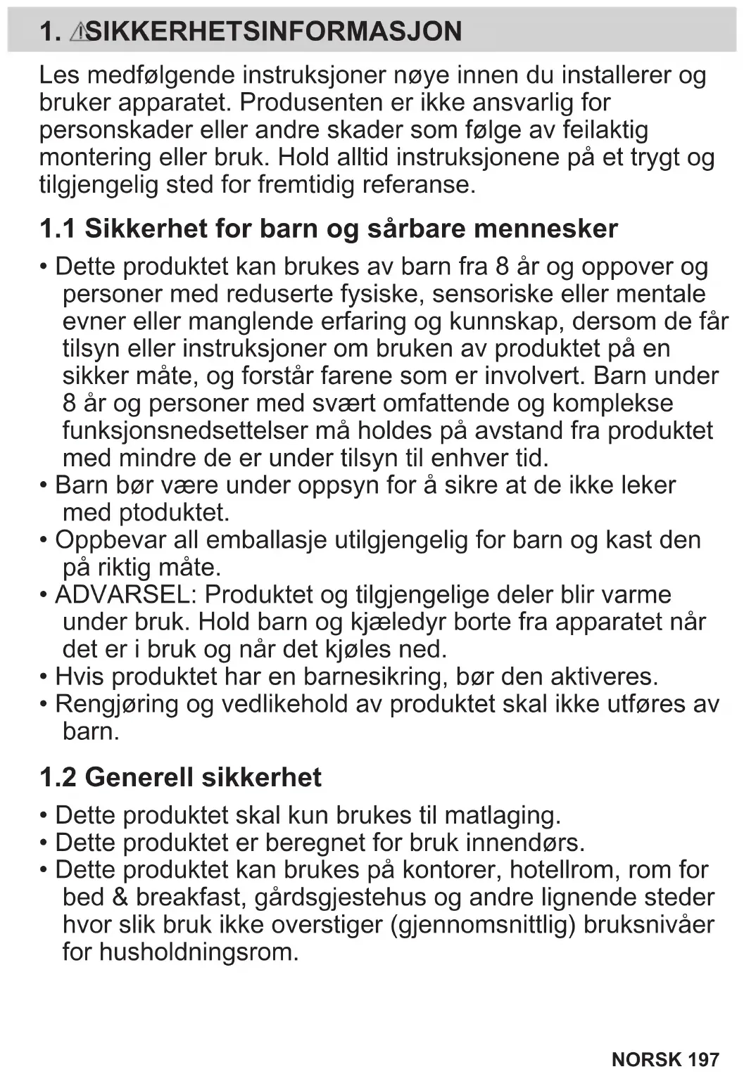 - Dette produktet kan brukes av barn fra 8 år og oppover og personer med reduserte fysiske, sensoriske eller mentale evner eller manglende erfaring og kunnskap, dersom de får tilsyn eller instruksjoner om bruken av produktet på en sikker måte, og forstår farene som er involvert. Barn under 8 år og personer med svært omfattende og komplekse funksjonsnedsettelser må holdes på avstand fra produktet med mindre de er under tilsyn til enhver tid.