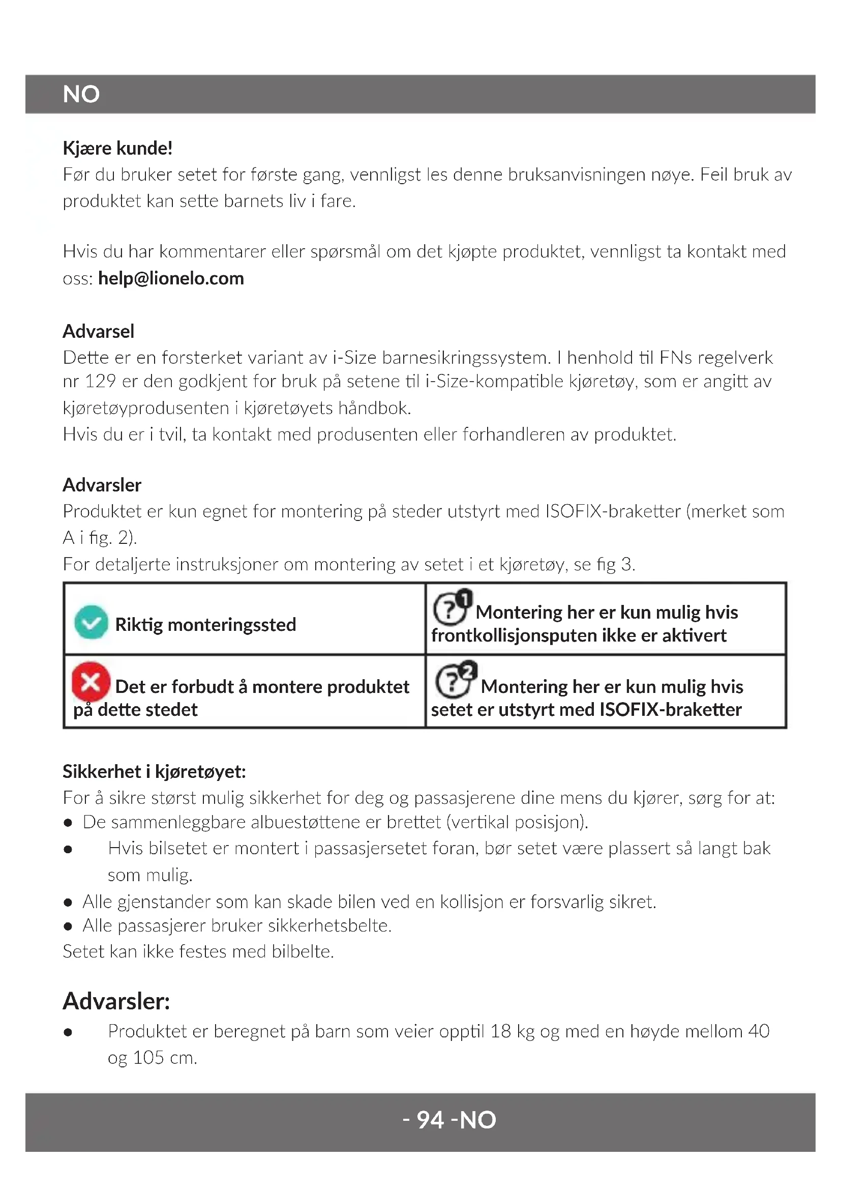 Produktet er beregnet på barn som veier oppl 18 kg og med en høyde mellom 40 og 105 cm. NO‑ 95 ‑ NO