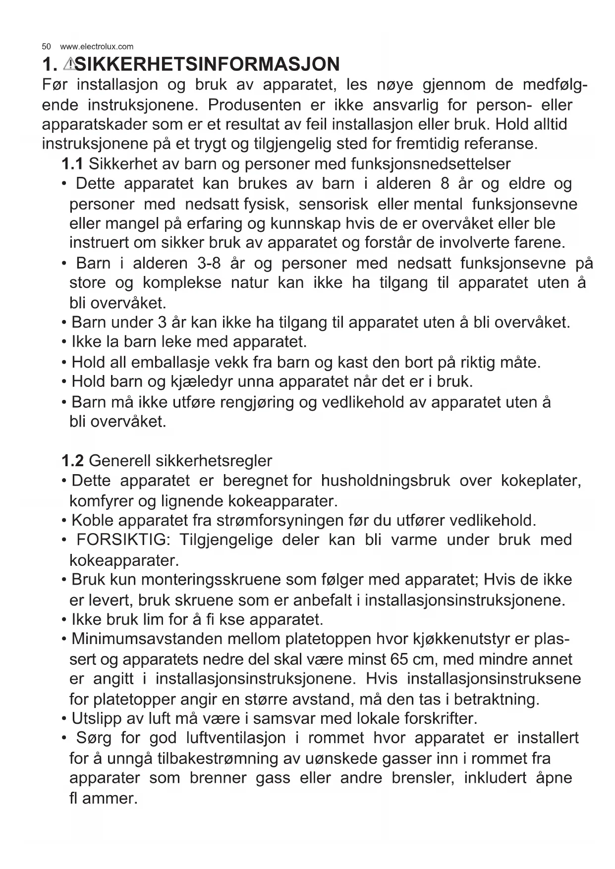 - Sørg for god luftventilasjon i rommet hvor apparatet er installert for å unngå tilbakestrømning av uønskede gasser inn i rommet fra apparater som brenner gass eller andre brensler, inkludert åpne fl ammer.51 NORSK