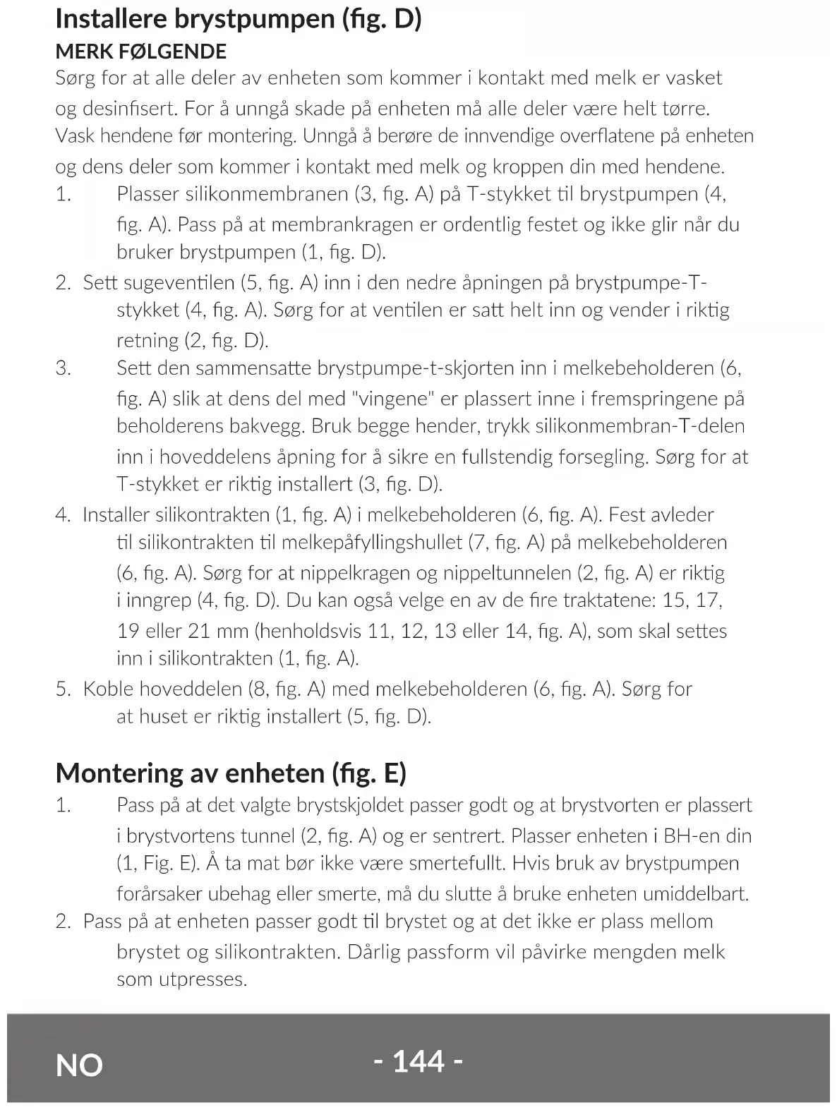 Sørg for at alle deler av enheten som kommer i kontakt med melk er vasket og desinsert. For å unngå skade på enheten må alle deler være helt tørre. Vask hendene før montering. Unngå å berøre de innvendige overatene på enheten og dens deler som kommer i kontakt med melk og kroppen din med hendene.
