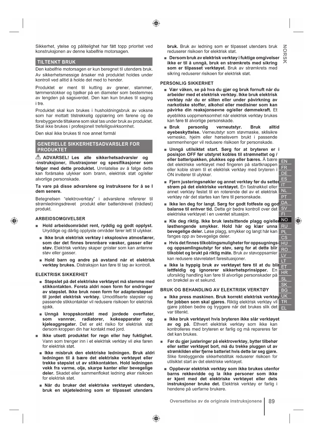 MOTORSAG ■ Hold alle kroppsdelene unna kjedesagen når kjedesagen er i gang. Før du starter kjedesagen, påse at sagen ikke er i kontakt med noe. Et øyeblikk med uoppmerksomhet når du bruker kjedesagen kan føre til at klærne eller kroppen blir klemt inn i sagens kjede. ■ Hold kjedesagen alltid med høyre hånd på bakhåndtaket og venstre hånd på fremre håndtak. Hvis man holder kjedesagen omvendt, øker risikoen for personskade og det bør derfor aldri gjøres. ■ Motorsagen skal bare holdes i de isolerte grepsoverflatene, ettersom sagkjeden kan komme i kontakt med skjulte kabler eller sin egen ledning. Sagkjeder som kommer i kontakt med en strømførende ledning kan gjøre eksponerte metalldeler på motorsagen strømførende og gi operatøren et elektrisk støt. ■ Bruk øyebeskyttelse Det anbefales ytterligere verneutstyr for hørsel, hode hender, ben og føtter. Egnet verneutstyr vil redusere personskade på grunn av flyvende avfall eller utilsiktet kontakt med sagkjeden. ■ Motorsagen skal ikke brukes i et tre, på en stige, fra et hustak eller en eventuell ustabil støtte. Drift av en motorsag på denne måte kan føre til alvorlige personskader. ■ Stå alltid stødig og bruk kjedesagen kun når du står på en fast, sikker og jevn overflate. Glatte eller ustabile overflater kan forårsake tap av balanse eller kontroll over motorsagen. ■ Når du kutter en gren som er under spenning, vær oppmerksom på at det kan sprette tilbake. Når spenningen i trefibrene slippes, kan den fjærbelastede grenen sprette tilbake på operatøren og/eller slenge kjedesagen ut av kontroll. ■ Vær ekstremt forsiktig når du kutter busker og skudd. Slikt tynt materiale kan hekte seg fast i kjede og bli slengt mot deg eller dra deg ut av balanse. ■ Bær kjedesagen ved å holde i fronthåndtaket ved at kjedesagen er skrudd av og alltid unna kroppen. Når du skal transportere eller lagre kjedesagen, sett alltid på dekselet. Riktig håndtering av kjedesagen vil redusere sannsynligheten for utilsiktet kontakt med kjedesagen som er i bevegelse. ■ Følg anvisningene for smøring, kjedestramming og utskiftning av stang og kjede. Et feilstrammet eller feilsmurt kjede kan sprekke eller øke faren for kickback. ■ Kun til trekutting. Ikke bruk kjedesagen for annet enn tilsiktet bruk. For eksempel: ikke bruk motorsagen til å kappe metall, plast, murverk eller byggmaterialer som ikke er av tre. Bruk av kjedesagen for arbeider som avviker fra de tilsiktede, kan føre til farlige situasjoner. ■ Ikke gjør forsøk på å felle et tre inntil du har en forståelse over risikoene og hvordan du unngår disse. Det kan oppstå alvorlige personskader på operatøren eller tilstedeværende ved felling av et tre. ■ Følg alle instruksjoner ved fjerning av fastkjørt materiale, oppbevaring eller service på motorsagen. Se til at bryteren er av og at batteripakken er fjernet. Uventet aktivering av motorsagen under fjerning av fastkjørt materiale eller service kan føre til alvorlig personskade.NORSK