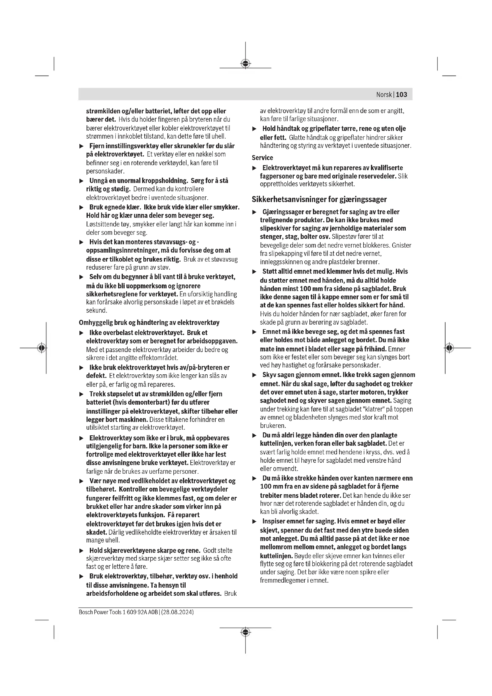 kg 14,1 14,1 Kapslingsgrad /II /II Egnede sagbladmål Sagbladdiameter mm 216 216 Stambladtykkelse mm 1,3−1,8 1,3−1,8 Maks. sagebredde mm 3,3 3,3 Boringsdiameter mm 30 30 A) Vekt uten strømkabel og uten nettstøpsel Angivelsene gjelder for merkespenning [U] på 230 V. Ved avvikende spenning og på utførelser for bestemte land kan disse angivelsene variere. Tillatte emnemål (se „Godkjente emnemål“, Side109) Verdiene kan variere avhengig av produktet, bruksområdet og miljøforholdene. Du finner mer informasjon på www.bosch-professional.com/wac. Informasjon om støy Støyemisjon målt i henhold til EN62841-3-9. 3601M190..: Vanlig A-støynivå for elektroverktøyet: lydtrykknivå91dB(A); lydeffektnivå104dB(A). UsikkerhetK=3dB. Bruk hørselvern! 3601M1906.: Vanlig A-støynivå for elektroverktøyet: lydtrykknivå90dB(A); lydeffektnivå103dB(A). UsikkerhetK=3dB. Bruk hørselvern! Støyutslippsverdien som er angitt i disse anvisningene er målt iht. en standardisert målemetode og kan brukes til sammenligning av elektroverktøy med hverandre. Den egner seg også til en foreløpig estimering av støyutslippet. Den angitte støyutslippsverdien representerer de hovedsakelige bruksområdene til elektroverktøyet. Men hvis elektroverktøyet brukes til andre formål, med andre innsatsverktøy eller utilstrekkelig vedlikehold, kan støyutslippet avvike fra det som er angitt. Dette kan føre til en betydelig økning av støyutslippet for hele arbeidstidsrommet. For en nøyaktig vurdering av støyutslippet skal det også tas hensyn til de tidene maskinen er slått av, eller går, men ikke faktisk er i bruk. Dette kan redusere støyutslippet for hele arbeidstidsrommet betraktelig. Montering u Unngå en uvilkårlig starting av elektroverktøyet. I løpet av monteringen og ved alle arbeider på elektroverktøyet må støpselet ikke være tilkoblet strømtilførselen. Leveranseomfang Se illustrasjonen av leveransen i begynnelsen av bruksanvisningen. Kontroller før første gangs bruk av elektroverktøyet om alle delene som er oppført nedenfor fulgte med: – Kapp- og gjærsag med montert sagblad – Skrutvinge (7) – Sagbordforlenger (3) med festesett (2 klemskruer (2), 2 stjerneskruer som beskyttelse mot uttrekking) – Unbrakonøkkel/stjerneskrutrekker (35) Merknad: Undersøk om elektroverktøyet er skadet. Før videre bruk av elektroverktøyet må beskyttelsesinnretninger eller lett skadede deler kontrolleres nøye med hensyn til feilfri og forskriftsmessig funksjon. Kontroller om de bevegelige delene fungerer feilfritt og ikke blokkeres, og at ingen deler er skadet. Samtlige deler må være riktig montert og oppfylle alle betingelser for å sikre en feilfri drift. Skadede beskyttelsesinnretninger og deler må repareres eller skiftes ut på en sakkyndig måte av et godkjent fagverksted. Montere sagbordforlengerne (sebildeA) Sagbordet kan utvides på venstre eller høyre side ved bruk av sagbordforlengerne (3). – Skyv sagbordforlengerne (3) gjennom hullene på sagbordet til de stopper. 1 609 92A A0B | (28.08.2024) Bosch Power ToolsNorsk | 107 – Sett elektroverktøyet skrått, slik at du kan montere de to stjerneskruene som fulgte med, som beskyttelse mot uttrekking. Skru stjerneskruene inn i gjengene for disse på sagbordforlengerne (3), og stram dem med stjerneskrutrekkeren (35). – Vipp elektroverktøyet tilbake, og skru klemskruene (2) som holder sagbordforlengerne (3) på plass, i gjengene for disse på sagbordet (22). Stasjonær eller fleksibel montering u Til en sikker bruk må du montere elektroverktøyet før bruk på et jevn og stabil arbeidsflate (f.eks. arbeidsbenk). Montere på en arbeidsflate (se bilde B1) – Fest elektroverktøyet på arbeidsflaten med en egnet skruforbindelse. Bruk borehullene (1). Montering på et Bosch-arbeidsbord GTA-arbeidsbordene fra Bosch har høydejusterbare ben, slik at elektroverktøyet holdes sikkert på plass uansett underlag. Arbeidsbordenes emneholdere fungerer som støtte for lange emner. u Les gjennom alle advarsler og instrukser som fulgte med arbeidsbenken. Feil ved overholdelsen av advarslene og instruksene kan medføre elektriske støt, brann og/eller alvorlige skader. u Sett arbeidsbenken korrekt opp før du monterer elektroverktøyet. En feilfri oppbygging er viktig for å forhindre at benken bryter sammen. – Monter elektroverktøyet i transportstilling på arbeidsbenken. Fleksibel oppstilling (anbefales ikke!) (se bilde B2) Hvis det i unntakstilfeller ikke er mulig å montere elektroverktøyet på en plan og stabil arbeidsflate, kan du plassere det med veltebeskyttelse som hjelp. u Uten veltebeskyttelsen står ikke elektroverktøyet stabilt, og det kan velte, spesielt ved saging av maksimale horisontale og/eller vertikale gjæringsvinkler. – Drei veltebeskyttelsen (27) bakover eller utover til elektroverktøyet står rett på arbeidsflaten. Støv-/sponavsuging Støv fra materialer som blyholdig maling, noen tresorter, mineraler og metall kan være helsefarlige. Berøring eller innånding av støv kan utløse allergiske reaksjoner og/eller åndedrettssykdommer hos brukeren eller personer som befinner seg i nærheten. Visse typer støv som eike- eller bøkestøv gjelder som kreftfremkallende, spesielt i kombinasjon med tilsetningsstoffer til trebearbeidelse (kromat, trebeskyttelsesmidler). Asbestholdig materiale må kun bearbeides av fagfolk. – Bruk helst et støvavsug som er egnet for dette materialet. – Sørg for god ventilasjon av arbeidsplassen. – Det anbefales å bruke en støvmaske med filterklasse P2. Følg ditt lands gyldige forskrifter for de materialene som skal bearbeides. u Unngå støv på arbeidsplassen. Støv kan lett antennes. Støv-/sponavsuget kan blokkeres av støv, spon eller avbrukne deler på arbeidsstykket. – Slå av elektroverktøyet, og trekk støpselet ut av stikkontakten. – Vent til sagbladet er helt stanset. – Finn årsaken til blokkeringen og fjern denne. Eksternt avsug For støvavsug kan