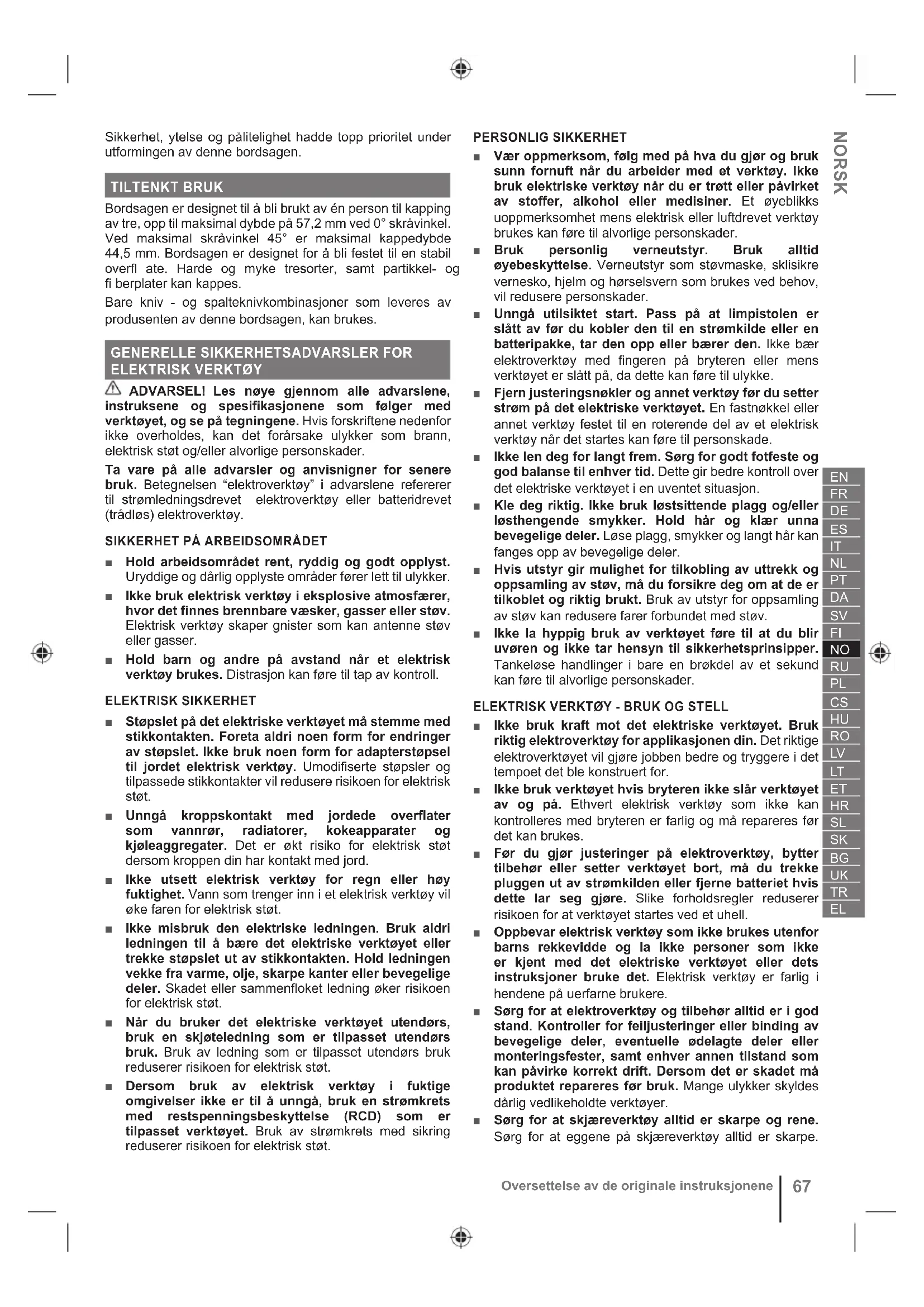 KUTTEBLAD ■ Les bruksanvisningen og instruksjonene nøye før du bruker sagbladet og elektroverktøyet. ■ Elektroverktøyet må være i god stand, og spindelen må være uten deformasjoner eller vibrasjoner. ■ Sørg for at operatøren har fått tilstrekkelig opplært i forholdsregler, justeringer og drift av det elektriske verktøyet. ■ Bruk alltid vernebriller og hørselvern når du bruker verktøyet. Det anbefales å bruke arbeidshansker, faste og sklisikre sko og forkle. ■ Før det benyttes noen form for tilbehør, se brukermanualen. Feil bruk av tilbehør kan føre til skader og øke risikoen for personskade. ■ Hold bladet rent. Dette inkluderer sagstøv, sagmugg og spesielt klebrige stoffer som treharpiks. Et rent blad skjærer mer presist og sikkert. ■ Bruk bare sagblader som er spesifisert i denne manualen og er i henhold til EN 847-1. ■ Observer maksimumshastigheten som er angitt på sagbladet. Påse at hastigheten som er merket av på sagbladet er minst lik hastigheten merket av på selve sagen. ■ Bruk alltid et blad som har en størrelse og en form som passer til spindelens diameter. Et blad som ikke passer til spindelen som det skal monteres på vil ikke gå rundt riktig og kan få deg til å miste kontroll over verktøyet. ■ Ikke bruk sagblader med tykkelse som er større enn eller med en bredde på kuttesporet (ende) som er mindre enn tykkelsen på spaltekniven. ■ Ikke bruk blader med større eller mindre diameter enn anbefalt. Ikke bruk avstandsholdere eller skiver for å feste bladet til akselen. ■ Kontroller at tuppene på sagbladet ikke er skadet eller ser unormale ut før hver bruk. Spisser som er skadet eller løse kan bli forvandlet til flygende objekter ved bruk og øke faren for personskade. ■ Sagblad som har sprekker eller som har endret form må ikke brukes! Ikke bruk sageblader som er skadet eller deformerte. ■ Kast sagbladet hvis det er skadet, deformert, forvridd eller har sprekker. Det skal ikke repareres. ■ Ikke bruk HSS-blader. ■ Sørg for at sagbladet er korrekt montert, og stram akselmutteren godt til før bruk. ■ Festeskruen og mutterne må strammes til med korrekt skiftenøkkel osv. ■ Det er ikke tillatt å bruke forlenger på skiftenøkkelen eller å stramme ved hjelp av hammerslag. ■ Påse at bladet og flensene er rene og at de forsenkede sidene av kragen er mot sagbladet. ■ Sørg for at bladet roterer i riktig retning og ikke kommer i kontakt med noen del av maskinen eller vernesystemet. ■ Før arbeidet kan du utføre et prøvekutt uten at motoren er slått på, slik at kniven, betjeningen av vernene med hensyn til andre maskindeler og arbeidsstykket kan kontrolleres. ■ Etterlat aldri det elektriske verktøyet uten tilsyn. ■ Ikke påfør smøremidler på sagbladet mens det er i bevegelse. ■ Forsøk aldri å stoppe det elektriske verktøyet ved å kjøre et verktøy eller andre midler mot bladet, da det utilsiktet kan forårsake alvorlige ulykker. ■ Koble strømforsyningen fra det elektriske verktøyet før du skifter blader eller utfører vedlikehold. ■ Vær oppmerksom på tetting og utpakking av bladet. Det er fort gjort å skade seg på de skarpe knivspissene. ■ Bruk en bladholder eller ha på deg hansker når du håndterer et sagblad. Husk at bladet vil være varmt etter kapping. ■ Oppbevar bladet i originalemballasjen eller annen egnet emballasje, hold det tørt og på god avstand fra kjemikalier som kan skade bladet.