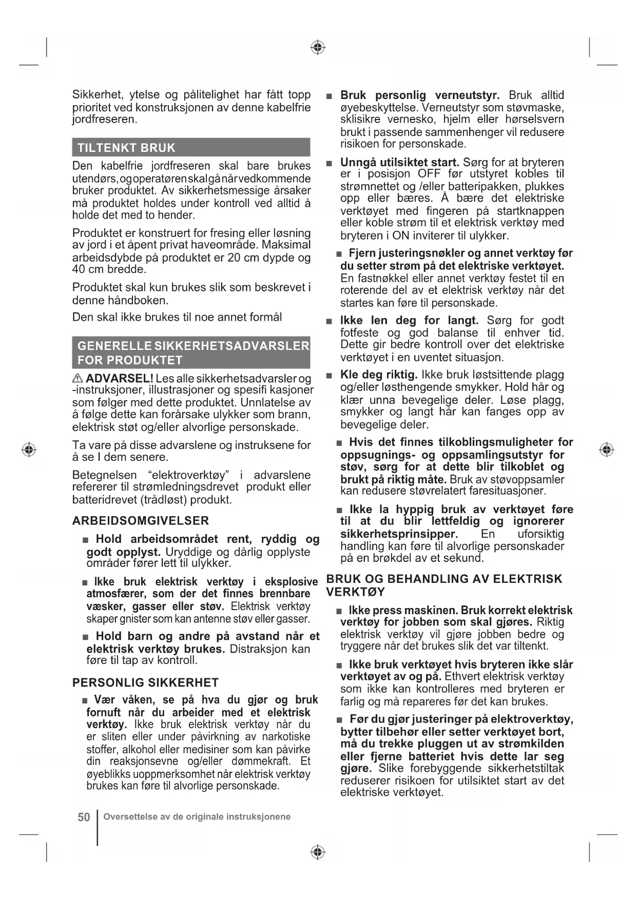 Osat ja lisävarusteet on hankittava erikseen Huom Varoitus50 Oversettelse av de originale instruksjonene Sikkerhet, ytelse og pålitelighet har fått topp prioritet ved konstruksjonen av denne kabelfrie jordfreseren. TILTENKT BRUK Den kabelfrie jordfreseren skal bare brukes utendørs, og operatøren skal gå når vedkommende bruker produktet. Av sikkerhetsmessige årsaker må produktet holdes under kontroll ved alltid å holde det med to hender. Produktet er konstruert for fresing eller løsning av jord i et åpent privat haveområde. Maksimal arbeidsdybde på produktet er 20 cm dypde og 40 cm bredde. Produktet skal kun brukes slik som beskrevet i denne håndboken. Den skal ikke brukes til noe annet formål GENERELLE SIKKERHETSADVARSLER FOR PRODUKTET ADVARSEL! Les alle sikkerhetsadvarsler og -instruksjoner, illustrasjoner og spesifi kasjoner som følger med dette produktet. Unnlatelse av å følge dette kan forårsake ulykker som brann, elektrisk støt og/eller alvorlige personskade. Ta vare på disse advarslene og instruksene for å se I dem senere. Betegnelsen “elektroverktøy” i advarslene refererer til strømledningsdrevet produkt eller batteridrevet (trådløst) produkt. ARBEIDSOMGIVELSER ■ Hold arbeidsområdet rent, ryddig og godt opplyst. Uryddige og dårlig opplyste områder fører lett til ulykker. ■ Ikke bruk elektrisk verktøy i eksplosive atmosfærer, som der det finnes brennbare væsker, gasser eller støv. Elektrisk verktøy skaper gnister som kan antenne støv eller gasser. ■ Hold barn og andre på avstand når et elektrisk verktøy brukes. Distraksjon kan føre til tap av kontroll. PERSONLIG SIKKERHET ■ Vær våken, se på hva du gjør og bruk fornuft når du arbeider med et elektrisk verktøy. Ikke bruk elektrisk verktøy når du er sliten eller under påvirkning av narkotiske stoffer, alkohol eller medisiner som kan påvirke din reaksjonsevne og/eller dømmekraft. Et øyeblikks uoppmerksomhet når elektrisk verktøy brukes kan føre til alvorlige personskade. ■ Bruk personlig verneutstyr. Bruk alltid øyebeskyttelse. Verneutstyr som støvmaske, sklisikre vernesko, hjelm eller hørselsvern brukt i passende sammenhenger vil redusere risikoen for personskade. ■ Unngå utilsiktet start. Sørg for at bryteren er i posisjon OFF før utstyret kobles til strømnettet og /eller batteripakken, plukkes opp eller bæres. Å bære det elektriske verktøyet med fingeren på startknappen eller koble strøm til et elektrisk verktøy med bryteren i ON inviterer til ulykker. ■ Fjern justeringsnøkler og annet verktøy før du setter strøm på det elektriske verktøyet. En fastnøkkel eller annet verktøy festet til en roterende del av et elektrisk verktøy når det startes kan føre til personskade. ■ Ikke len deg for langt. Sørg for godt fotfeste og god balanse til enhver tid. Dette gir bedre kontroll over det elektriske verktøyet i en uventet situasjon. ■ Kle deg riktig. Ikke bruk løstsittende plagg og/eller løsthengende smykker. Hold hår og klær unna bevegelige deler. Løse plagg, smykker og langt hår kan fanges opp av bevegelige deler. ■ Hvis det finnes tilkoblingsmuligheter for oppsugnings- og oppsamlingsutstyr for støv, sørg for at dette blir tilkoblet og brukt på riktig måte. Bruk av støvoppsamler kan redusere støvrelatert faresituasjoner. ■ Ikke la hyppig bruk av verktøyet føre til at du blir lettfeldig og ignorerer sikkerhetsprinsipper. En uforsiktig handling kan føre til alvorlige personskader på en brøkdel av et sekund.
