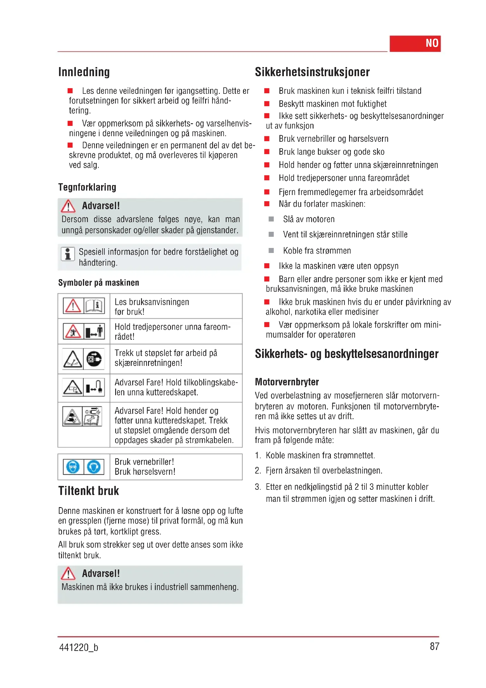 Innledning Les denne veiledningen før igangsetting. Dette er forutsetningen for sikkert arbeid og feilfri hånd- tering. Vær oppmerksom på sikkerhets- og varselhenvis- ningene i denne veiledningen og på maskinen. Denne veiledningen er en permanent del av det be- skrevne produktet, og må overleveres til kjøperen ved salg. Tegnforklaring Advarsel! Dersom disse advarslene følges nøye, kan man unngå personskader og/eller skader på gjenstander. Spesiell informasjon for bedre forståelighet og håndtering. Symboler på maskinen Les bruksanvisningen før bruk! Hold tredjepersoner unna fareom- rådet! Trekk ut støpslet før arbeid på skjæreinnretningen! Advarsel Fare! Hold tilkoblingskabe- len unna kutteredskapet. Advarsel Fare! Hold hender og føtter unna kutteredskapet. Trekk ut støpslet omgående dersom det oppdages skader på strømkabelen. Bruk vernebriller! Bruk hørselsvern! Tiltenkt bruk Denne maskinen er konstruert for å løsne opp og lufte en gressplen (fjerne mose) til privat formål, og må kun brukes på tørt, kortklipt gress. All bruk som strekker seg ut over dette anses som ikke tiltenkt bruk. Advarsel! Maskinen må ikke brukes i industriell sammenheng. Sikkerhetsinstruksjoner Bruk maskinen kun i teknisk feilfri tilstand Beskytt maskinen mot fuktighet Ikke sett sikkerhets- og beskyttelsesanordninger ut av funksjon Bruk vernebriller og hørselsvern Bruk lange bukser og gode sko Hold hender og føtter unna skjæreinnretningen Hold tredjepersoner unna fareområdet Fjern fremmedlegemer fra arbeidsområdet Når du forlater maskinen: Slå av motoren Vent til skjæreinnretningen står stille Koble fra strømmen Ikke la maskinen være uten oppsyn Barn eller andre personer som ikke er kjent med bruksanvisningen, må ikke bruke maskinen Ikke bruk maskinen hvis du er under påvirkning av alkohol, narkotika eller medisiner Vær oppmerksom på lokale forskrifter om mini- mumsalder for operatøren Sikkerhets- og beskyttelsesanordninger Motorvernbryter Ved overbelastning av mosefjerneren slår motorvern- bryteren av motoren. Funksjonen til motorvernbryte- ren må ikke settes ut av drift. Hvis motorvernbryteren har slått av maskinen, går du fram på følgende måte: