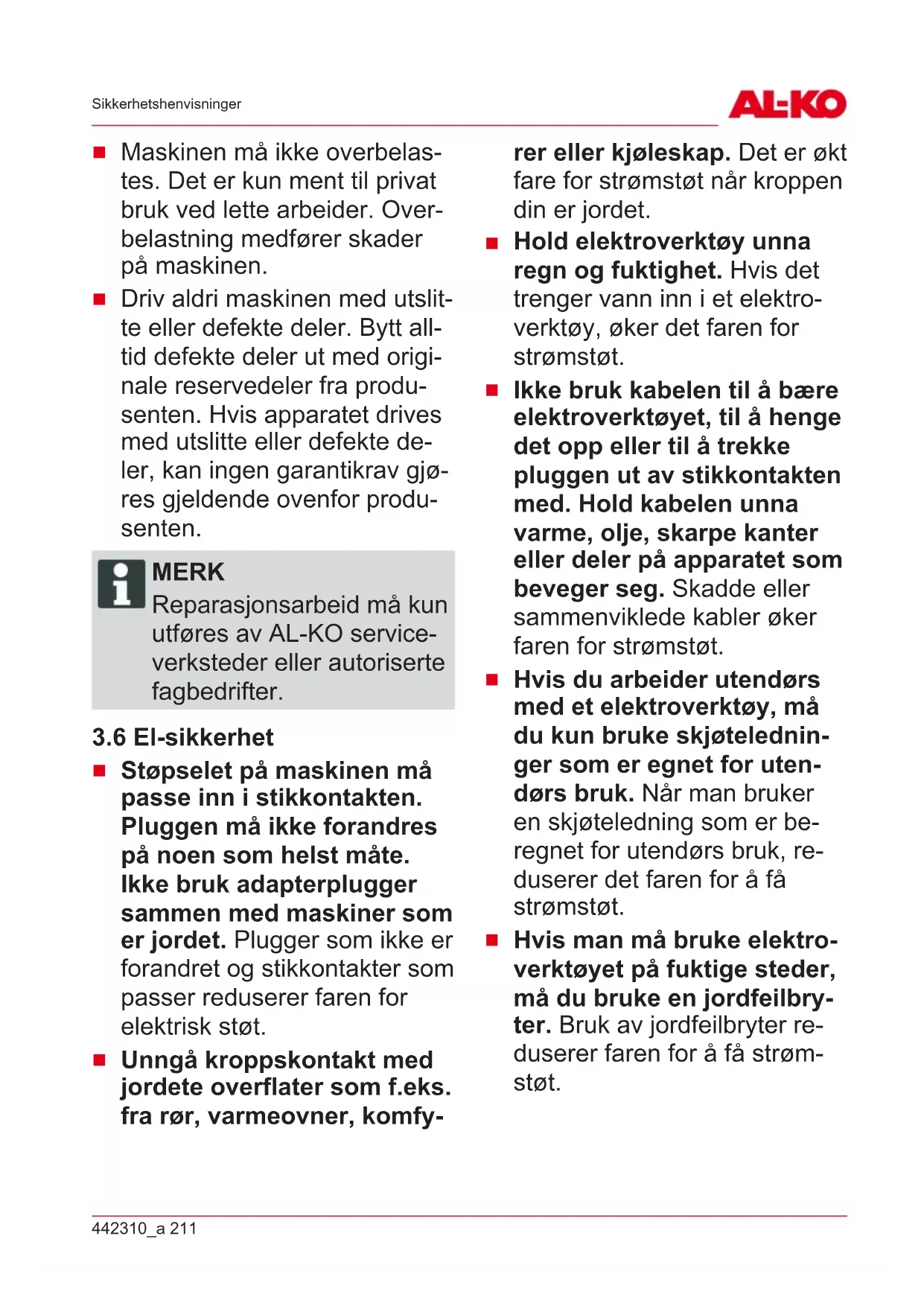 Driv aldri maskinen med utslit- te eller defekte deler. Bytt all- tid defekte deler ut med origi- nale reservedeler fra produ- senten. Hvis apparatet drives med utslitte eller defekte de- ler, kan ingen garantikrav gjø- res gjeldende ovenfor produ- senten. MERK Reparasjonsarbeid må kun utføres av AL-KO service- verksteder eller autoriserte fagbedrifter.