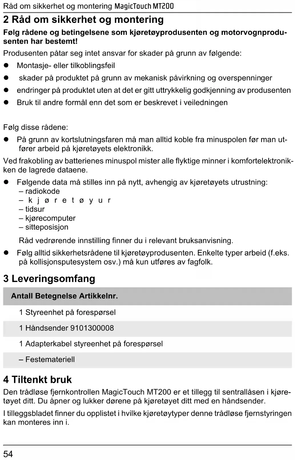2 Råd om sikkerhet og montering Følg rådene og betingelsene som kjøretøyprodusenten og motorvognprodu- senten har bestemt! Produsenten påtar seg intet ansvar for skader på grunn av følgende: z Montasje- eller tilkoblingsfeil z skader på produktet på grunn av mekanisk påvirkning og overspenninger z endringer på produktet uten at det er gitt uttrykkelig godkjenning av produsenten z Bruk til andre formål enn det som er beskrevet i veiledningen Følg disse rådene: z På grunn av kortslutningsfaren må man alltid koble fra minuspolen før man ut- fører arbeid på kjøretøyets elektronikk. Ved frakobling av batterienes minuspol mister alle flyktige minner i komfortelektronik- ken de lagrede dataene. z Følgende data må stilles inn på nytt, avhengig av kjøretøyets utrustning: – radiokode –kjøretøyur – tidsur – kjørecomputer – sitteposisjon Råd vedrørende innstilling finner du i relevant bruksanvisning. z Følg alltid sikkerhetsrådene til kjøretøyprodusenten. Enkelte typer arbeid (f.eks. på kollisjonsputesystem osv.) må kun utføres av fagfolk. 3 Leveringsomfang 4 Tiltenkt bruk Den trådløse fjernkontrollen MagicTouch MT200 er et tillegg til sentrallåsen i kjøre- tøyet ditt. Du åpner og lukker dørene på kjøretøyet ditt med en håndsender. I tilleggsbladet finner du opplistet i hvilke kjøretøytyper denne trådløse fjernstyringen kan monteres inn i. Antall Betegnelse Artikkelnr. 1 Styreenhet på forespørsel 1 Håndsender 9101300008 1 Adapterkabel styreenhet på forespørsel – Festemateriell _MT200.book Seite 54 Freitag, 8. April 2011 3:14 15MagicTouch MT200 Betjeningselementer håndsender
