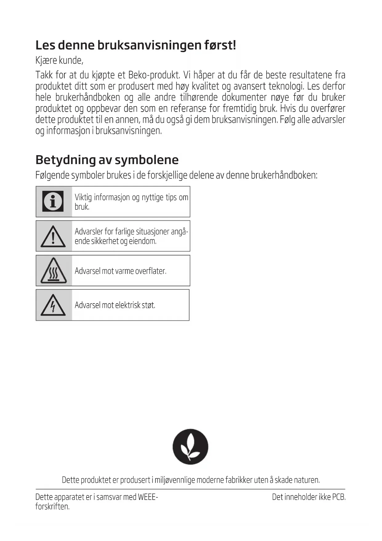 Advarsel mot elektrisk støt. Dette produktet er produsert mljøvennlge moderne fabrkker uten å skade naturen. Dette apparatet er samsvar med WEEE- forskrften. Det nneholder kke PCB.289 / NO Mikrobølgeovn / Brukerhåndbok 1 Vktge skkerhets- og mljø nstrukser Viktige sikkerhetsin- struksjoner Les nøye og oppbevare for fremtidig henvisning