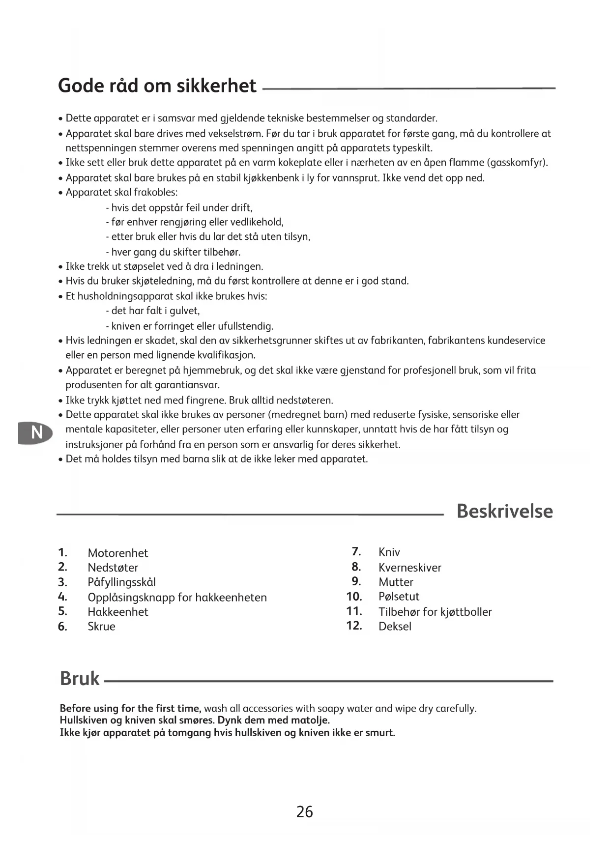 - Det må holdes tilsyn med barna slik at de ikke leker med apparatet. Beskrivelse N27 I tilfelle tilstopping: