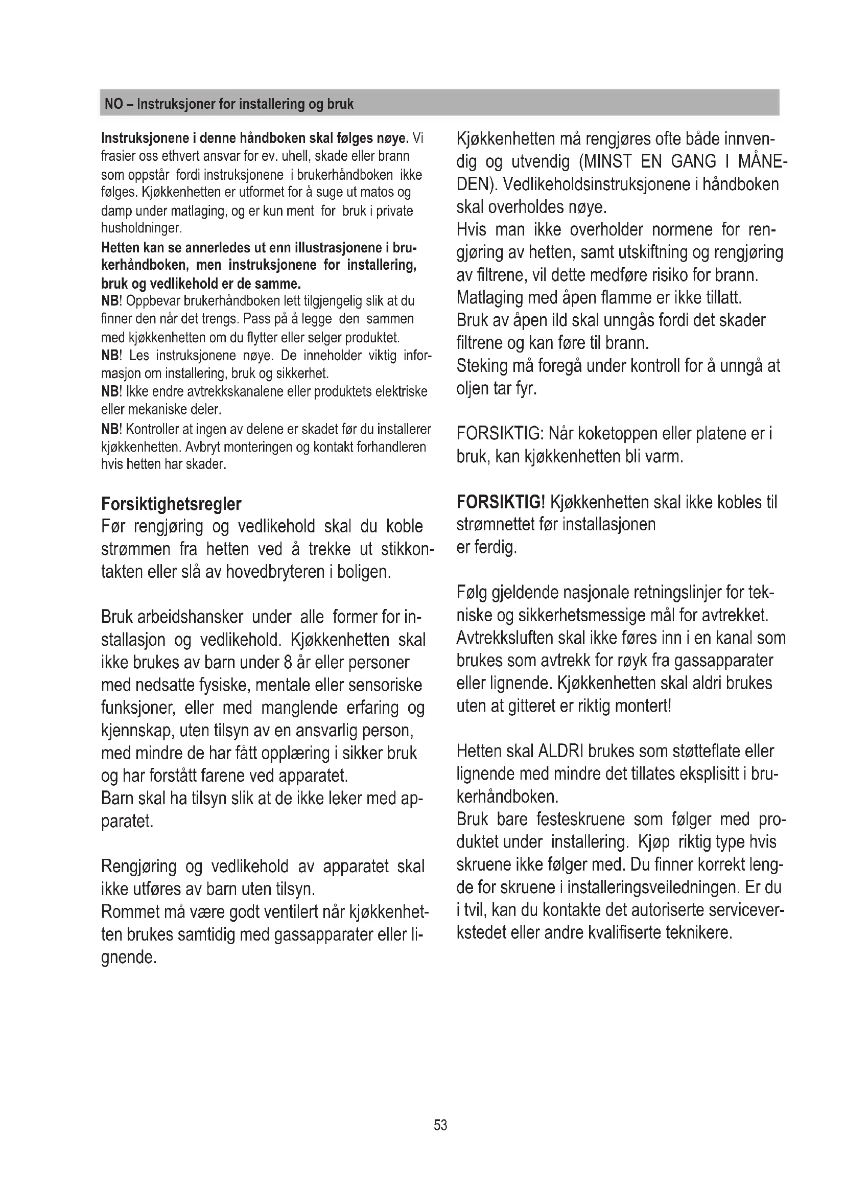 - Dersom instruksjonene ovenfor ikke overhol- des, frafaller garantien, og leverandører frasier seg ethvert ansvar for støy eller redusert effekt. Før du lager hullet, må du kontrollere at det ikke er hindringer i skapet hvor kjøkkenhetten skal plasseres slik at hetten ikke kan installeres på riktig måte. Kontroller at størrelsen på hetten og koketoppen passer til skapet slik at installasjo- nen kan gjennomføres.
