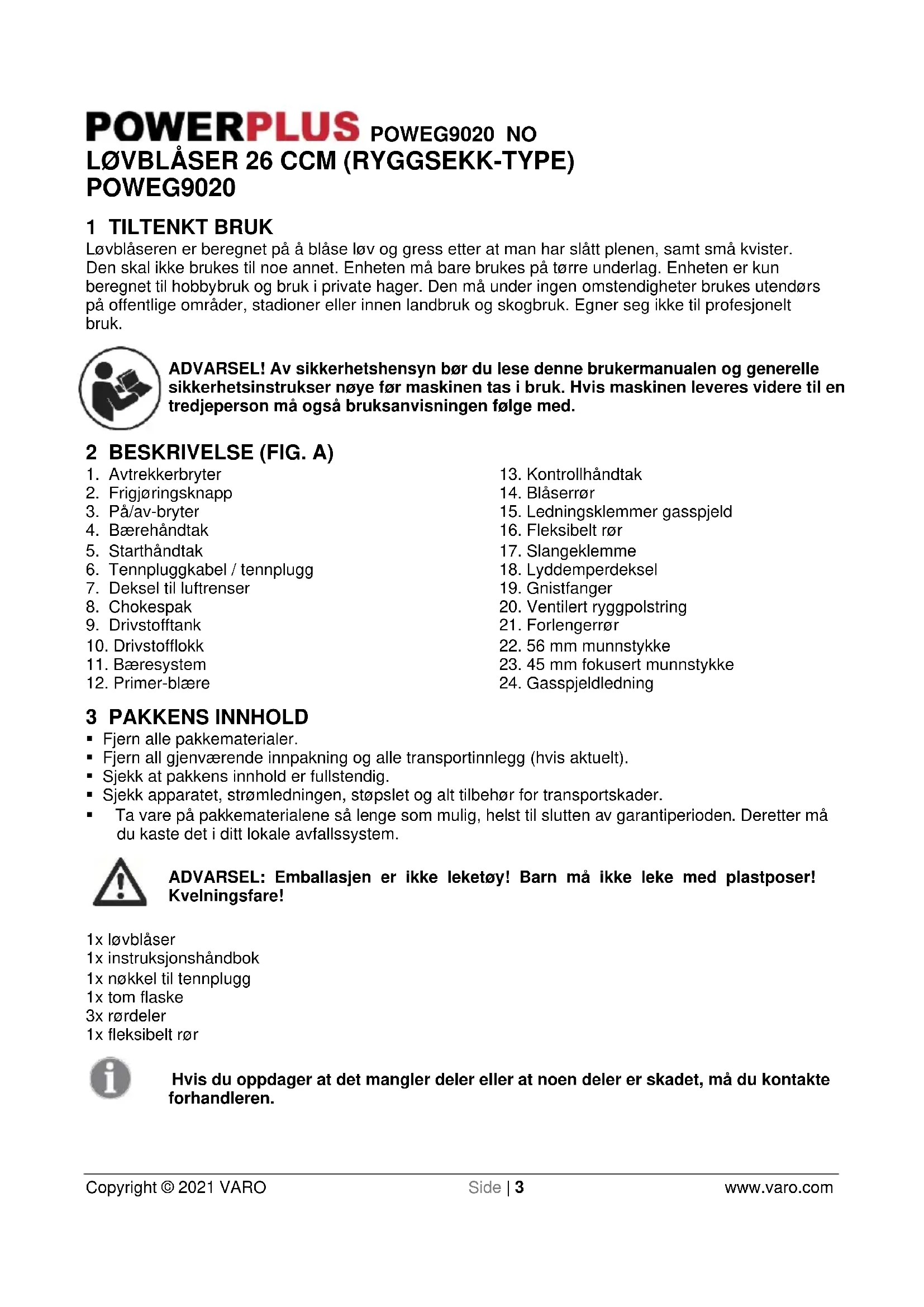 Copyright © 2021 VARO Side | 3 www.varo.com LØVBLÅSER 26 CCM (RYGGSEKK-TYPE) POWEG9020 1 TILTENKT BRUK Løvblåseren er beregnet på å blåse løv og gress etter at man har slått plenen, samt små kvister. Den skal ikke brukes til noe annet. Enheten må bare brukes på tørre underlag. Enheten er kun beregnet til hobbybruk og bruk i private hager. Den må under ingen omstendigheter brukes utendørs på offentlige områder, stadioner eller innen landbruk og skogbruk. Egner seg ikke til profesjonelt bruk. ADVARSEL! Av sikkerhetshensyn bør du lese denne brukermanualen og generelle sikkerhetsinstrukser nøye før maskinen tas i bruk. Hvis maskinen leveres videre til en tredjeperson må også bruksanvisningen følge med. 2 BESKRIVELSE (FIG. A)