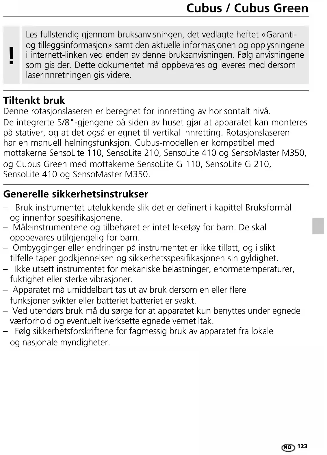 – Bruk instrumentet utelukkende slik det er denert i kapittel Bruksformål og innenfor spesikasjonene. – Måleinstrumentene og tilbehøret er intet leketøy for barn. De skal oppbevares utilgjengelig for barn. – Ombygginger eller endringer på instrumentet er ikke tillatt, og i slikt tilfelle taper godkjennelsen og sikkerhetsspesikasjonen sin gyldighet. – Ikke utsett instrumentet for mekaniske belastninger, enormetemperaturer, fuktighet eller sterke vibrasjoner. – Apparatet må umiddelbart tas ut av bruk dersom en eller ere funksjoner svikter eller batteriet batteriet er svakt. – Ved utendørs bruk må du sørge for at apparatet kun benyttes under egnede værforhold og eventuelt iverksette egnede vernetiltak. – Følg sikkerhetsforskriftene for fagmessig bruk av apparatet fra lokale og nasjonale myndigheter. Generelle sikkerhetsinstrukser Tiltenkt bruk Denne rotasjonslaseren er beregnet for innretting av horisontalt nivå. De integrerte 5/8"-gjengene på siden av huset gjør at apparatet kan monteres på stativer, og at det også er egnet til vertikal innretting. Rotasjonslaseren har en manuell helningsfunksjon. Cubus-modellen er kompatibel med mottakerne SensoLite 110, SensoLite 210, SensoLite 410 og SensoMaster M350, og Cubus Green med mottakerne SensoLite G 110, SensoLite G 210, SensoLite 410 og SensoMaster M350. Les fullstendig gjennom bruksanvisningen, det vedlagte heftet «Garanti- og tilleggsinformasjon» samt den aktuelle informasjonen og opplysningene i internett-linken ved enden av denne bruksanvisningen. Følg anvisningene som gis der. Dette dokumentet må oppbevares og leveres med dersom laserinnretningen gis videre.