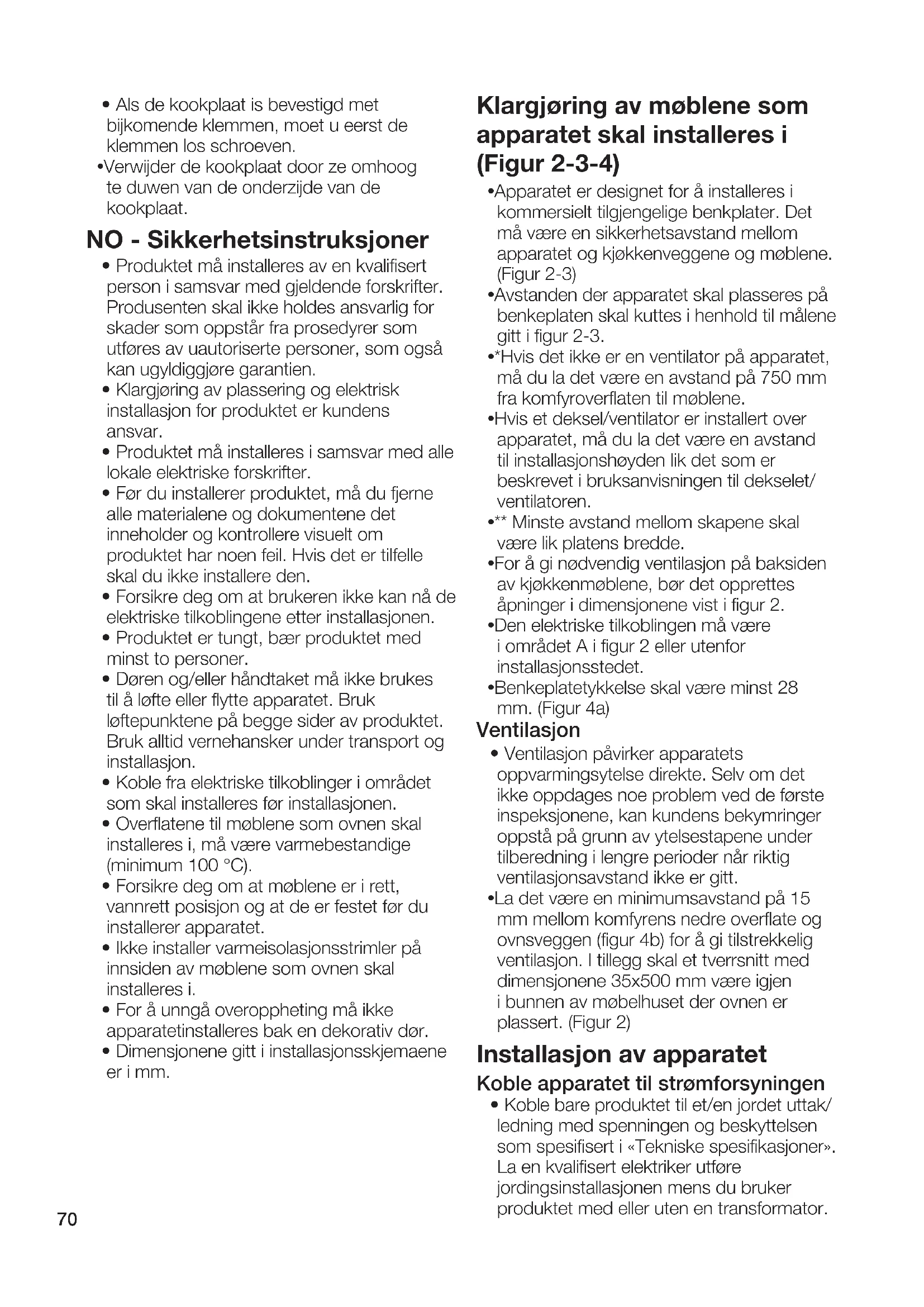 - La det være en minimumsavstand på 15 mm mellom komfyrens nedre overflate og ovnsveggen (figur 4b) for å gi tilstrekkelig ventilasjon. I tillegg skal et tverrsnitt med dimensjonene 35x500 mm være igjen i bunnen av møbelhuset der ovnen er plassert. (Figur 2) Installasjon av apparatet Koble apparatet til strømforsyningen