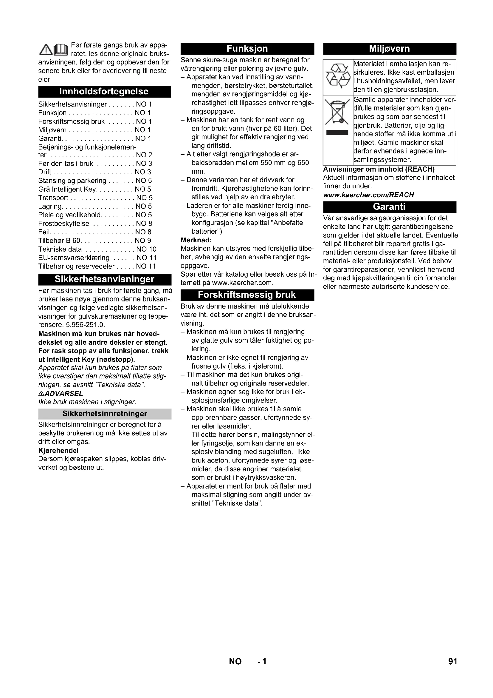 Tilbehør og reservedele Chairman of the Board of Management Director Regulatory Affairs & Certification 90 DA- 1 Før første gangs bruk av appa- ratet, les denne originale bruks- anvisningen, følg den og oppbevar den for senere bruk eller for overlevering til neste eier. Før maskinen tas i bruk for første gang, må bruker lese nøye gjennom denne bruksan- visningen og følge vedlagte sikkerhetsan- visninger for gulvskuremaskiner og teppe- rensere, 5.956-251.0. Maskinen må kun brukes når hoved- dekslet og alle andre deksler er stengt. For rask stopp av alle funksjoner, trekk ut Intelligent Key (nødstopp). Apparatet skal kun brukes på flater som ikke overstiger den maksimalt tillatte stig- ningen, se avsnitt "Tekniske data". 몇 ADVARSEL Ikke bruk maskinen i stigninger. Sikkerhetsinnretninger er beregnet for å beskytte brukeren og må ikke settes ut av drift eller omgås. Kjørehendel Dersom kjørespaken slippes, kobles driv- verket og bøstene ut. Senne skure-suge maskin er beregnet for våtrengjøring eller polering av jevne gulv. – Apparatet kan ved innstilling av vann- mengden, børstetrykket, børsteturtallet, mengden av rengjøringsmiddel og kjø- rehastighet lett tilpasses enhver rengjø- ringsoppgave. – Maskinen har en tank for rent vann og en for brukt vann (hver på 60 liter). Det gir mulighet for effektiv rengjøring ved lang driftstid. – Alt etter valgt rengjøringshode er ar- beidsbredden mellom 550 mm og 650 mm. – Denne varianten har et drivverk for fremdrift. Kjørehastighetene kan forinn- stilles ved hjelp av en dreiebryter. – Laderen er for alle maskiner ferdig inne- bygd. Batteriene kan velges alt etter konfigurasjon (se kapittel "Anbefalte batterier") Merknad: Maskinen kan utstyres med forskjellig tilbe- hør, avhengig av den enkelte rengjørings- oppgave. Spør etter vår katalog eller besøk oss på In- ternett på www.kaercher.com. Bruk av denne maskinen må utelukkende være iht. det som er angitt i denne bruksan- visning. – Maskinen må kun brukes til rengjøring av glatte gulv som tåler fuktighet og po- lering. – Maskinen er ikke egnet til rengjøring av frosne gulv (f.eks. i kjølerom). – Til maskinen må det kun brukes origi- nalt tilbehør og originale reservedeler. – Maskinen egner seg ikke for bruk i ek- splosjonsfarlige omgivelser. – Maskinen skal ikke brukes til å samle opp brennbare gasser, ufortynnede sy- rer eller løsemidler. Til dette hører bensin, malingstynner el- ler fyringsolje, som kan danne en ek- splosiv blanding med sugeluften. Ikke bruk aceton, ufortynnede syrer og løse- midler, da disse angriper materialet som er brukt i høytrykksvaskeren. – Apparatet er ment for bruk på flater med maksimal stigning som angitt under av- snittet "Tekniske data". Anvisninger om innhold (REACH) Aktuell informasjon om stoffene i innholdet finner du under: www.kaercher.com/REACH Vår ansvarlige salgsorganisasjon for det enkelte land har utgitt garantibetingelsene som gjelder i det aktuelle landet. Eventuelle feil på tilbehøret blir reparert gratis i ga- rantitiden dersom disse kan føres tilbake til material- eller produksjonsfeil. Ved behov for garantireparasjoner, vennligst henvend deg med kjøpskvitteringen til din forhandler eller nærmeste autoriserte kundeservice. Innholdsfortegnelse Sikkerhetsanvisninger . . . . . . . NO 1 Funksjon . . . . . . . . . . . . . . . . . NO 1 Forskriftsmessig bruk . . . . . . . NO 1 Miljøvern . . . . . . . . . . . . . . . . . NO 1 Garanti. . . . . . . . . . . . . . . . . . . NO 1 Betjenings- og funksjonelemen- ter . . . . . . . . . . . . . . . . . . . . . . NO 2 Før den tas i bruk . . . . . . . . . . NO 3 Drift . . . . . . . . . . . . . . . . . . . . . NO 3 Stansing og parkering . . . . . . . NO 5 Grå Intelligent Key. . . . . . . . . . NO 5 Transport . . . . . . . . . . . . . . . . . NO 5 Lagring. . . . . . . . . . . . . . . . . . . NO 5 Pleie og vedlikehold. . . . . . . . . NO 5 Frostbeskyttelse . . . . . . . . . . . NO 8 Feil. . . . . . . . . . . . . . . . . . . . . . NO 8 Tilbehør B 60. . . . . . . . . . . . . . NO 9 Tekniske data . . . . . . . . . . . . . NO 10 EU-samsvarserklæring . . . . . . NO 11 Tilbehør og reservedeler . . . . . NO 11 Sikkerhetsanvisninger Sikkerhetsinnretninger Funksjon Forskriftsmessig bruk Miljøvern Materialet i emballasjen kan re- sirkuleres. Ikke kast emballasjen i husholdningsavfallet, men lever den til en gjenbruksstasjon. Gamlle apparater inneholder ver- difulle materialer som kan gjen- brukes og som bør sendest til gjenbruk. Batterier, olje og lig- nende stoffer må ikke komme ut i miljøet. Gamle maskiner skal derfor avhendes i egnede inn- samlingssystemer. Garanti 91NO- 2 1 Hendel for senking av sugebommen 2 Deksel spillvanntank 3 Holdeskinne for Homebase 4 Turbinbeskyttelsesil (under flottøren) 5 Bruktvannstank spylesystem (tilleggs- utstyr) 6 Fleksibel lås spylesystem (tilleggsut- styr) 7 Låsing bruktvannstank 8 Flottør 9 Skyvebøyle 10 Grovsmussil 11 Spillvanntank 12 Påfyllingsåpning rentvannstank 13 Sugeslange rengjøringsmiddelflaske (kun Dose-varianter) 14 Rengjøringsmiddelflaske (kun DOSE- varianter) 15 Lås rentvannstank med filter 16 Holder rengjøringsmiddelflaske 17 Rentvannstank 18 Feste for tank 19 Rengjøringshode (symbolsk illustra- sjon) * 20 Børstevalse (BRvarianter), skivebør- ster (BDvarianter)* 21 Grovsmussbeholder (kun BR) 22 Batteriepolsikring 23 Batteri * 24 Nivåanvisning rentvann 25 Pedal for heving/senking av rengjø- ringshodet 26 Hendel for regulering av børstetrykk 27 Dreiehåndtak for justering av vinkel på sugebom 28 Vingemuttere for festing av sugebom 29 Sugeslange 30 Sugebom* 31 Tilkoblingskabel for lader 32 Fylleautomatikk rentvannstank (opsjon) 33 Reguleringsknapp for vannmengden 34 Kjørehendel 35 Betjeningspanel 36 Plasseringsflate for rengjøringssett "Homebase Box" 37 Kabelkroker 38 Tappeslange bruktvann med dose- ringsinnretning