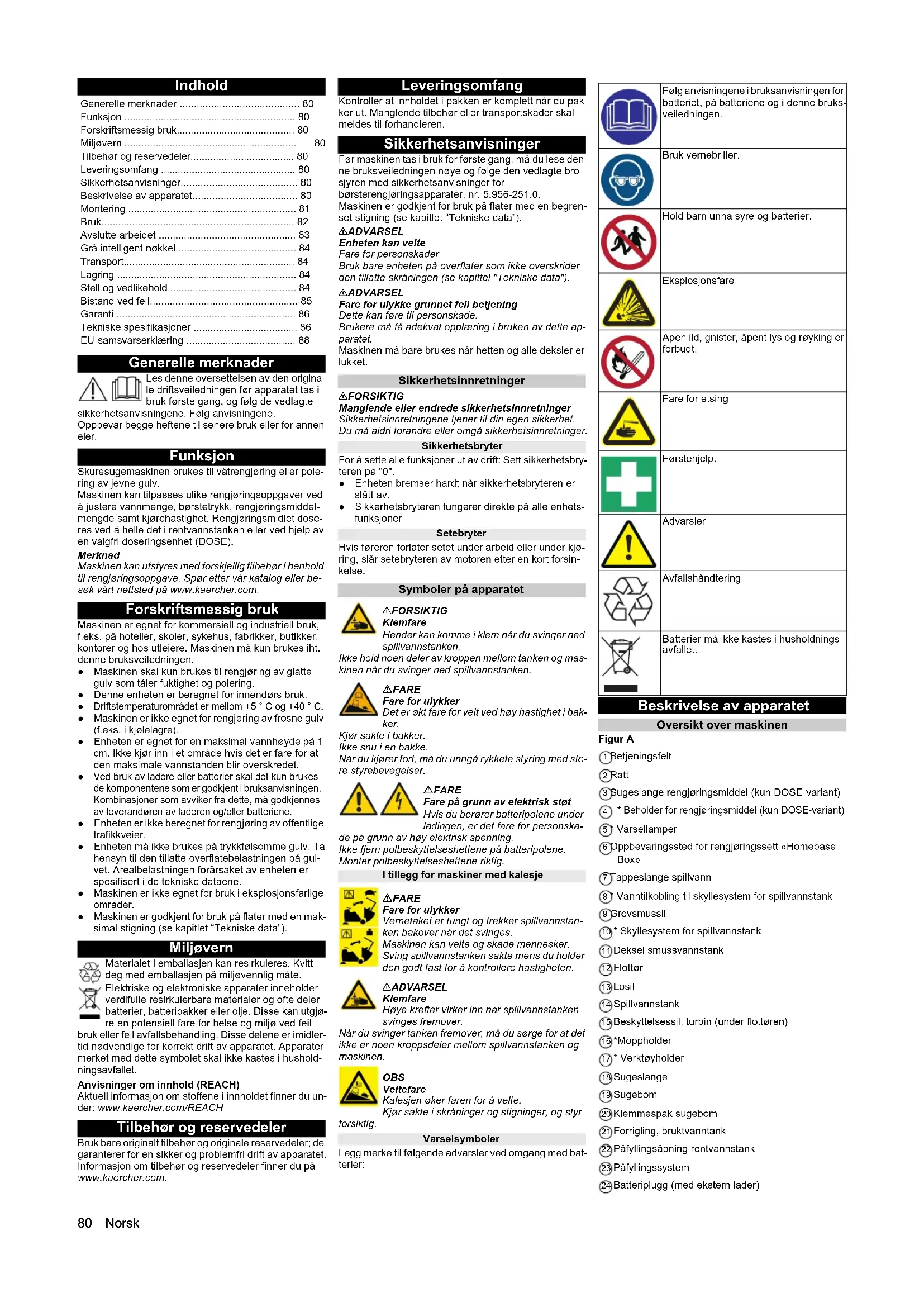 Ved bruk av ladere eller batterier skal det kun brukes de komponentene som er godkjent i bruksanvisningen. Kombinasjoner som avviker fra dette, må godkjennes av leverandøren av laderen og/eller batteriene. ● Enheten er ikke beregnet for rengjøring av offentlige trafikkveier. ● Enheten må ikke brukes på trykkfølsomme gulv. Ta hensyn til den tillatte overflatebelastningen på gul- vet. Arealbelastningen forårsaket av enheten er spesifisert i de tekniske dataene. ● Maskinen er ikke egnet for bruk i eksplosjonsfarlige områder. ● Maskinen er godkjent for bruk på flater med en mak- simal stigning (se kapitlet “Tekniske data”). Miljøvern Materialet i emballasjen kan resirkuleres. Kvitt deg med emballasjen på miljøvennlig måte. Elektriske og elektroniske apparater inneholder verdifulle resirkulerbare materialer og ofte deler batterier, batteripakker eller olje. Disse kan utgjø- re en potensiell fare for helse og miljø ved feil bruk eller feil avfallsbehandling. Disse delene er imidler- tid nødvendige for korrekt drift av apparatet. Apparater merket med dette symbolet skal ikke kastes i hushold- ningsavfallet. Anvisninger om innhold (REACH) Aktuell informasjon om stoffene i innholdet finner du un- der: www.kaercher.com/REACH Tilbehør og reservedeler Bruk bare originalt tilbehør og originale reservedeler; de garanterer for en sikker og problemfri drift av apparatet. Informasjon om tilbehør og reservedeler finner du på www.kaercher.com. Leveringsomfang Kontroller at innholdet i pakken er komplett når du pak- ker ut. Manglende tilbehør eller transportskader skal meldes til forhandleren. Sikkerhetsanvisninger Før maskinen tas i bruk for første gang, må du lese den- ne bruksveiledningen nøye og følge den vedlagte bro- sjyren med sikkerhetsanvisninger for børsterengjøringsapparater, nr. 5.956-251.0. Maskinen er godkjent for bruk på flater med en begren- set stigning (se kapitlet “Tekniske data”). 몇 ADVARSEL Enheten kan velte Fare for personskader Bruk bare enheten på overflater som ikke overskrider den tillatte skråningen (se kapittel "Tekniske data"). 몇 ADVARSEL Fare for ulykke grunnet feil betjening Dette kan føre til personskade. Brukere må få adekvat opplæring i bruken av dette ap- paratet. Maskinen må bare brukes når hetten og alle deksler er lukket. Sikkerhetsinnretninger 몇 FORSIKTIG Manglende eller endrede sikkerhetsinnretninger Sikkerhetsinnretningene tjener til din egen sikkerhet. Du må aldri forandre eller omgå sikkerhetsinnretninger. Sikkerhetsbryter For å sette alle funksjoner ut av drift: Sett sikkerhetsbry- teren på "0". ● Enheten bremser hardt når sikkerhetsbryteren er slått av. ● Sikkerhetsbryteren fungerer direkte på alle enhets- funksjoner Setebryter Hvis føreren forlater setet under arbeid eller under kjø- ring, slår setebryteren av motoren etter en kort forsin- kelse. Symboler på apparatet 몇FORSIKTIG Klemfare Hender kan komme i klem når du svinger ned spillvannstanken. Ikke hold noen deler av kroppen mellom tanken og mas- kinen når du svinger ned spillvannstanken. FARE Fare for ulykker Det er økt fare for velt ved høy hastighet i bak- ker. Kjør sakte i bakker. Ikke snu i en bakke. Når du kjører fort, må du unngå rykkete styring med sto- re styrebevegelser. FARE Fare på grunn av elektrisk støt Hvis du berører batteripolene under ladingen, er det fare for personska- de på grunn av høy elektrisk spenning. Ikke fjern polbeskyttelseshettene på batteripolene. Monter polbeskyttelseshettene riktig. I tillegg for maskiner med kalesje FARE Fare for ulykker Vernetaket er tungt og trekker spillvannstan- ken bakover når det svinges. Maskinen kan velte og skade mennesker. Sving spillvannstanken sakte mens du holder den godt fast for å kontrollere hastigheten. 몇ADVARSEL Klemfare Høye krefter virker inn når spillvannstanken svinges fremover. Når du svinger tanken fremover, må du sørge for at det ikke er noen kroppsdeler mellom spillvannstanken og maskinen. OBS Veltefare Kalesjen øker faren for å velte. Kjør sakte i skråninger og stigninger, og styr forsiktig. Varselsymboler Legg merke til følgende advarsler ved omgang med bat- terier: Beskrivelse av apparatet Oversikt over maskinen Figur A 1 Betjeningsfelt 2 Ratt 3 Sugeslange rengjøringsmiddel (kun DOSE-variant)
