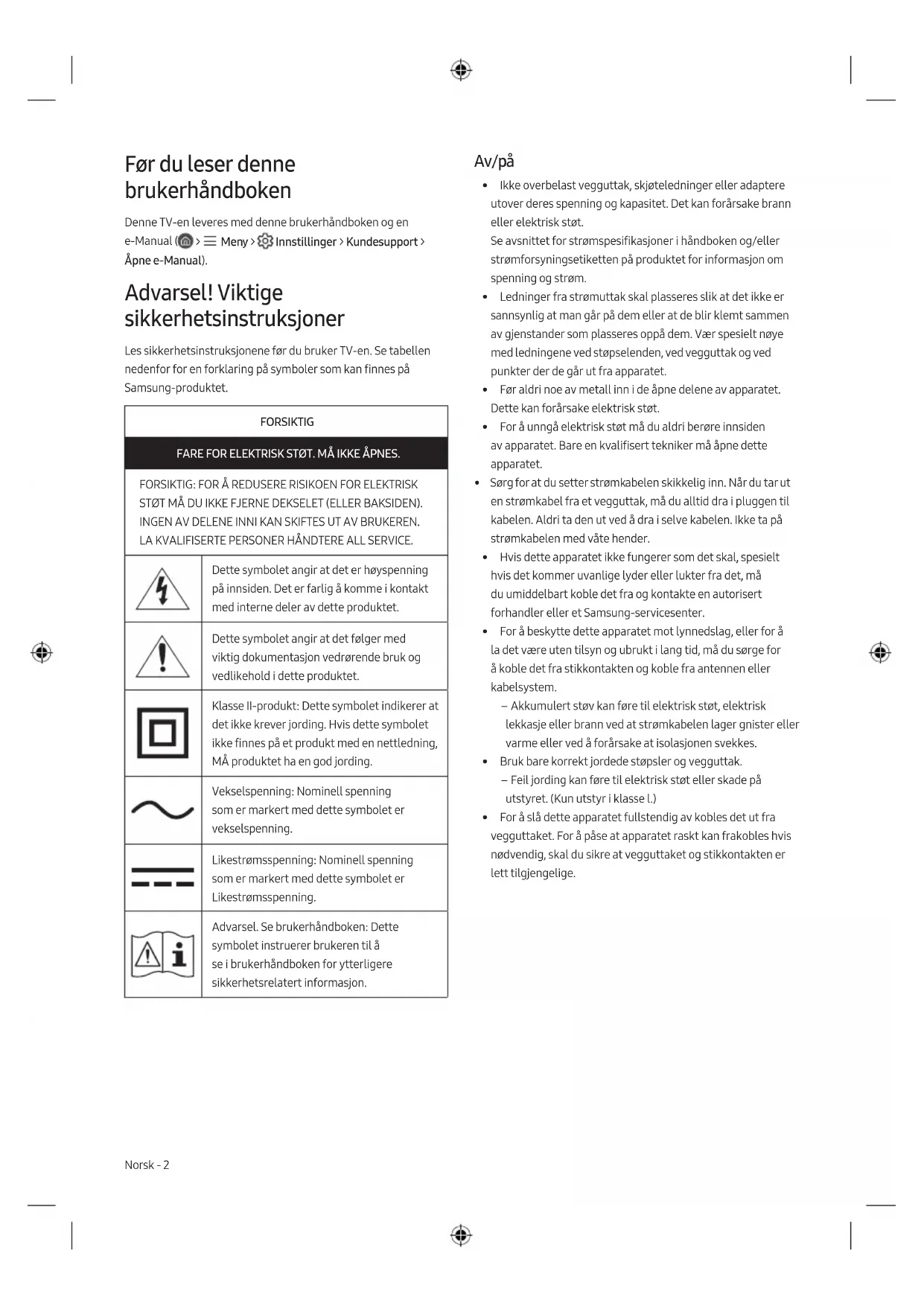 STØT MÅ DU IKKE FJERNE DEKSELET (ELLER BAKSIDEN). INGEN AV DELENE INNI KAN SKIFTES UT AV BRUKEREN. LA KVALIFISERTE PERSONER HÅNDTERE ALL SERVICE. Dette symbolet angir at det er høyspenning på innsiden. Det er farlig å komme i kontakt med interne deler av dette produktet. Dette symbolet angir at det følger med viktig dokumentasjon vedrørende bruk og vedlikehold i dette produktet. Klasse II-produkt: Dette symbolet indikerer at det ikke krever jording. Hvis dette symbolet ikke finnes på et produkt med en nettledning, MÅ produktet ha en god jording. Vekselspenning: Nominell spenning som er markert med dette symbolet er vekselspenning. Likestrømsspenning: Nominell spenning som er markert med dette symbolet er Likestrømsspenning. Advarsel. Se brukerhåndboken: Dette symbolet instruerer brukeren til å se i brukerhåndboken for ytterligere sikkerhetsrelatert informasjon. Av/på