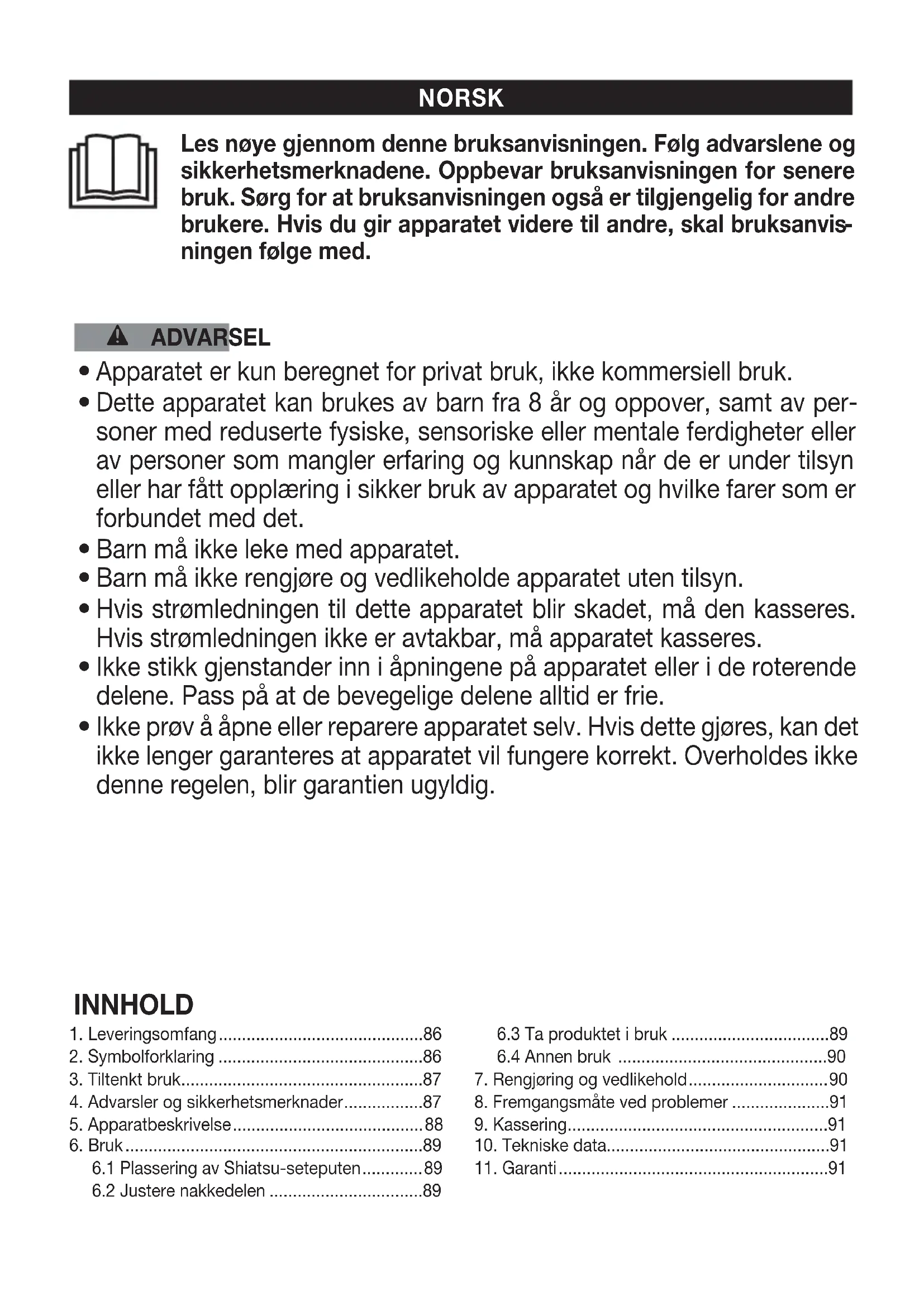 Ikke prøv å åpne eller reparere apparatet selv. Hvis dette gjøres, kan det ikke lenger garanteres at apparatet vil fungere korrekt. Overholdes ikke denne regelen, blir garantien ugyldig. INNHOLD86