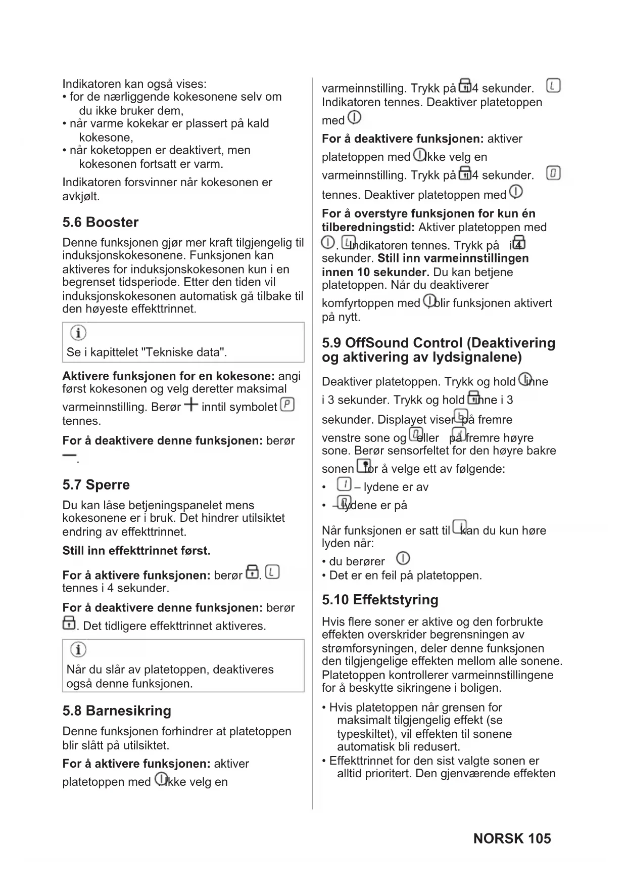 Denne funksjonen gjør mer kraft tilgjengelig til induksjonskokesonene. Funksjonen kan aktiveres for induksjonskokesonen kun i en begrenset tidsperiode. Etter den tiden vil induksjonskokesonen automatisk gå tilbake til den høyeste effekttrinnet. Se i kapittelet "Tekniske data". Aktivere funksjonen for en kokesone: angi først kokesonen og velg deretter maksimal varmeinnstilling. Berør inntil symbolet tennes. For å deaktivere denne funksjonen: berør