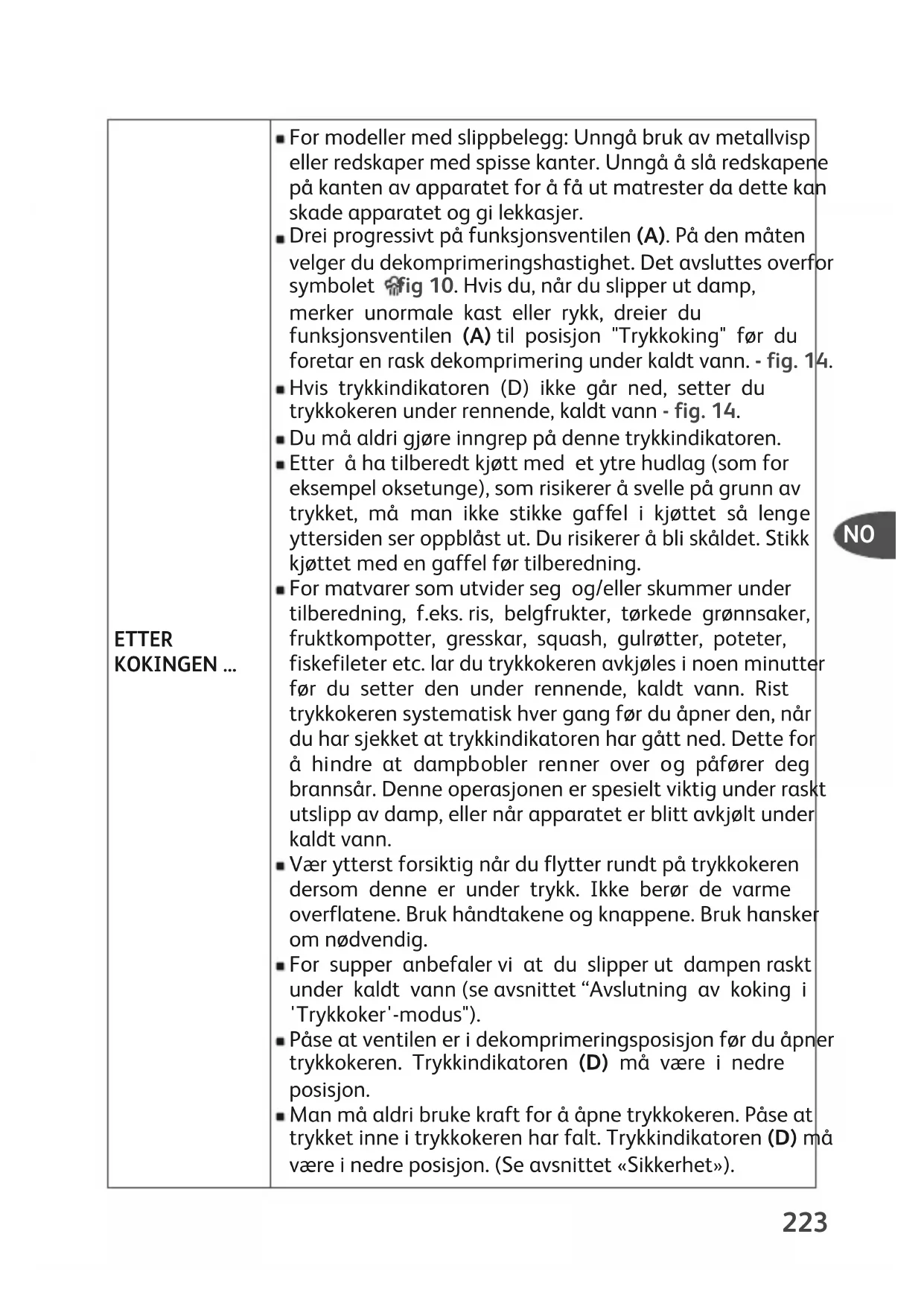 KOKINGEN Barn må holdes utenfor rekkevidde når trykkokeren er i bruk. Trykkokeren koker under trykk. Skålding kan oppstå ved feil bruk. Påse at trykkokeren er forsvarlig lukket før du tar den i bruk. (Se avsnittet «Lukking»). Påse at ventilen alltid avgir blåselyden under koking. Hvis ikke nok damp slipper ut, dekomprimer kjelen og sjekk at det er nok væske til stede. Sjekk også at dampkanalen ikke er tilstoppet. Hvis det fremdeles ikke kommer damp ut etter dette, øk varmen forsiktig. Ikke kok matvarer som kan tilstoppe sikkerhetsfunksjonene: - tyttebær - perlegryn - havregryn - gule erter - nudler, makaroni, spagetti - rabarbra - rips Aldri tilbered retter basert på melk i trykkokeren. Når du har en trykkoker med en kjele i rustfritt stål, ikke ha grovt salt i trykkokeren. Tilsett fint salt helt på slutten. Du unngår på den måten små «stikk» som kan endre bunnen på trykkokeren. Aldri bruk trykkokeren til å steke med olje under trykk. Trykkokeren skal ikke brukes til andre formål enn det den er beregnet på. Trykkokeren må aldri settes i en varm ovn. Aldri ha aluminiumsfolie som ikke er i en form, i trykkokeren. Aldri ha plastfilm i trykkokeren. Alkoholdamp kan ta fyr. Kok opp i ca. 2 minutter før du setter på lokket. Følg godt med på apparatet dersom du tilbereder oppskrifter med alkohol. Bruk kompatible varmekilder som er i samsvar med bruksanvisningen.ETTER KOKINGEN ... For modeller med slippbelegg: Unngå bruk av metallvisp eller redskaper med spisse kanter. Unngå å slå redskapene på kanten av apparatet for å få ut matrester da dette kan skade apparatet og gi lekkasjer. Drei progressivt på funksjonsventilen (A). På den måten velger du dekomprimeringshastighet. Det avsluttes overfor symbolet - fig 10. Hvis du, når du slipper ut damp, merker unormale kast eller rykk, dreier du funksjonsventilen (A) til posisjon "Trykkoking" før du foretar en rask dekomprimering under kaldt vann. - fig. 14. Hvis trykkindikatoren (D) ikke går ned, setter du trykkokeren under rennende, kaldt vann - fig. 14. Du må aldri gjøre inngrep på denne trykkindikatoren. Etter å ha tilberedt kjøtt med et ytre hudlag (som for eksempel oksetunge), som risikerer å svelle på grunn av trykket, må man ikke stikke gaffel i kjøttet så lenge yttersiden ser oppblåst ut. Du risikerer å bli skåldet. Stikk kjøttet med en gaffel før tilberedning. For matvarer som utvider seg og/eller skummer under tilberedning, f.eks. ris, belgfrukter, tørkede grønnsaker, fruktkompotter, gresskar, squash, gulrøtter, poteter, fiskefileter etc. lar du trykkokeren avkjøles i noen minutter før du setter den under rennende, kaldt vann. Rist trykkokeren systematisk hver gang før du åpner den, når du har sjekket at trykkindikatoren har gått ned. Dette for å hindre at dampbobler renner over og påfører deg brannsår. Denne operasjonen er spesielt viktig under raskt utslipp av damp, eller når apparatet er blitt avkjølt under kaldt vann. Vær ytterst forsiktig når du flytter rundt på trykkokeren dersom denne er under trykk. Ikke berør de varme overflatene. Bruk håndtakene og knappene. Bruk hansker om nødvendig. For supper anbefaler vi at du slipper ut dampen raskt under kaldt vann (se avsnittet “Avslutning av koking i 'Trykkoker'-modus"). Påse at ventilen er i dekomprimeringsposisjon før du åpner trykkokeren. Trykkindikatoren (D) må være i nedre posisjon. Man må aldri bruke kraft for å åpne trykkokeren. Påse at trykket inne i trykkokeren har falt. Trykkindikatoren (D) må være i nedre posisjon. (Se avsnittet «Sikkerhet»).