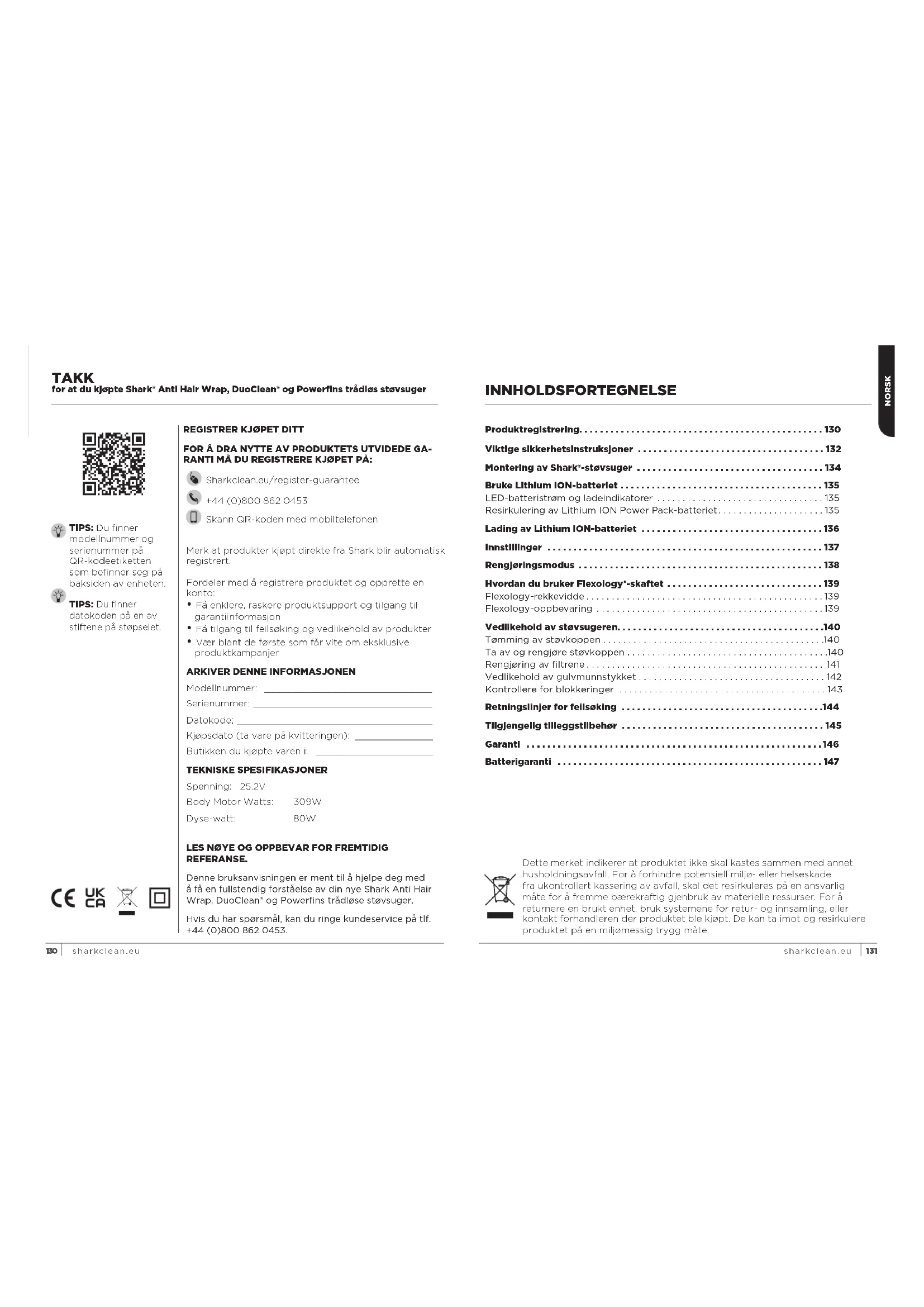 - Hvis de 2 øverste eller de 2 nederste LED-lysene blinker (fig C, fig D), må du ringe kundeservice på +44 (0)800 862 0453 Fig A Fig CFig B Fig D MERK: Hvis støvsugeren fremdeles ikke fungerer som den skal, kan du kontakte kundeservice på +44 (0)800 862 0453147sharkclean.eu146 sharkclean.eu NORSK Når forbrukere kjøper et produkt i Europa nyter de godt av lovmessige rettigheter relatert til produktets kvalitet (dine «lovfestede rettigheter») Du kan håndheve disse rettighetene hos forhandleren din Men hos Shark har vi stor tro på kvaliteten på produktene våre og vi gir derfor produkteieren en ekstra produsentgaranti på inntil fem år (2 år som standard pluss 3 år når du registrerer deg) Disse vilkårene og betingelsene gjelder kun for produsentgarantien vår – dine lovfestede rettigheter påvirkes ikke Betingelsene nedenfor beskriver forutsetningene for og omfanget av garantien vår De påvirker ikke dine lovfestede rettigheter eller forhandlerens forpliktelser og din kontrakt med dem Litium ION power pack-batteriet er ikke dekket av 5-års garantien (se batterigaranti på neste side) Shark®-garantier Et husholdningsapparat som en støvsuger utgjør en betydelig investering Din nye maskin må fungere riktig så lenge som mulig Garantien den kommer med er en viktig faktor – og viser hvor stor tillit produsenten har til produktet sitt og sin produksjonskvalitet Hver Shark-maskin leveres med en garanti på kostnadsfrie deler og reparasjonsarbeid Vår kundeservice-telefon (0800 862 0453) er åpen fra kl 900 til 1800, mandag-fredag Det er gratis å ringe, og du vil bli satt rett over til en Shark-representant Du finner også nettstøtte på www.Sharkclean.eu Hvordan registrerer jeg min utvidede Shark®-garanti? Du kan registrere garantien din på nettet innen 28 dager etter kjøpet For å spare tid trenger du følgende informasjon om maskinen: