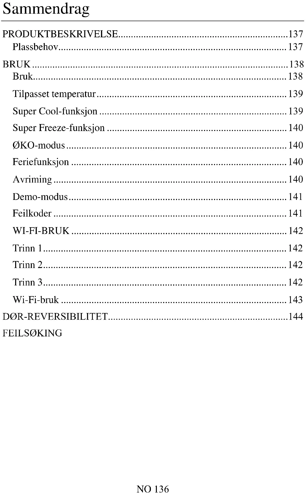 3NO 138 BRUK A. AV/PÅ-tasten, brukes til å slå apparatet av/på. B. Wi-Fi-nøkkel, brukes til å slå av/på Wi-Fi-nøkkelen C. Mode-tasten, brukes til å velge ønsket funksjon D. TEMP-tasten, brukes til å velge kjøle- og frysetemperaturen a. Kjøleskap/fryser-områdeikon, viser hvilket rom av apparatet som er valgt b. Super Freeze-ikonet viser om super frysing-funksjonen er aktivert c. Frysertemperaturnivåer viser den valgte temperaturen i fryseren d. Super Cool-ikon viser om super kjøling-funksjonen er aktivert. e. Kjøleskaptemperaturnivåer, viser den valgte temperaturen f. Tilpasset temperatur-ikon viser om temperaturen er valgt av appen g. Øko-modusikon viser om økomodus er aktivert h. Feriefunksjon-ikon viser om feriefunksjonen er aktivert