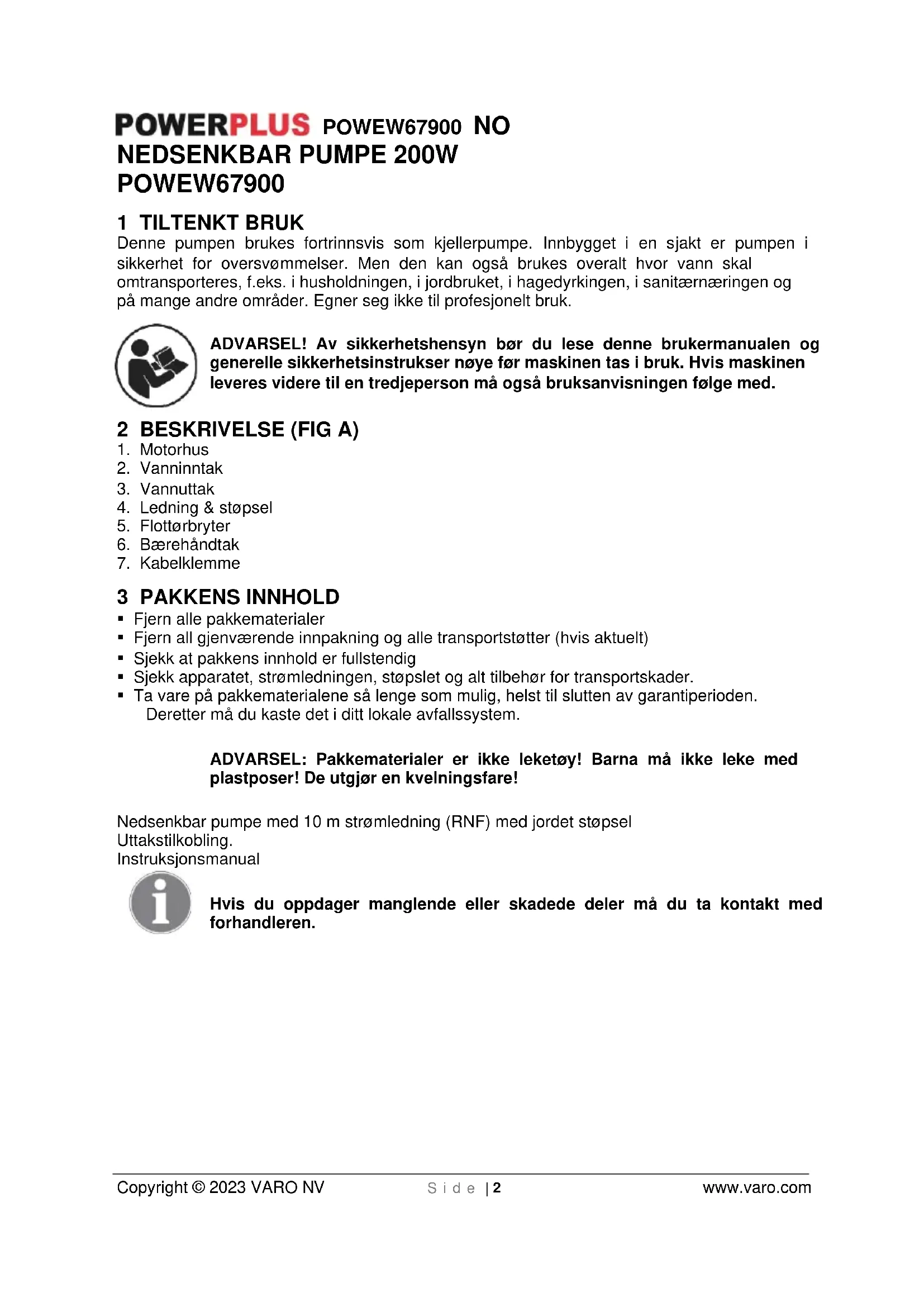 - Pass på når du innstiller flottørbryteren at denne ikke berører bunnen før pumpen kobles ut. Obs.: Risiko for at pumpen går tørr. Dette apparatet kan ikke brukes av barn eller personer med fysiske, mentale eller utviklingsmessige svekkelser, eller av personer som mangler kunnskap eller erfaring, bortsett fra hvis disse personene blir instruert av en person som har ansvar for deres sikkerhet, en arbeidsleder eller ved å studere ovenstående instrukser før apparatet brukes.POWEW67900 NO Copyright © 2023 VARO NV S i d e | 5 www.varo.com