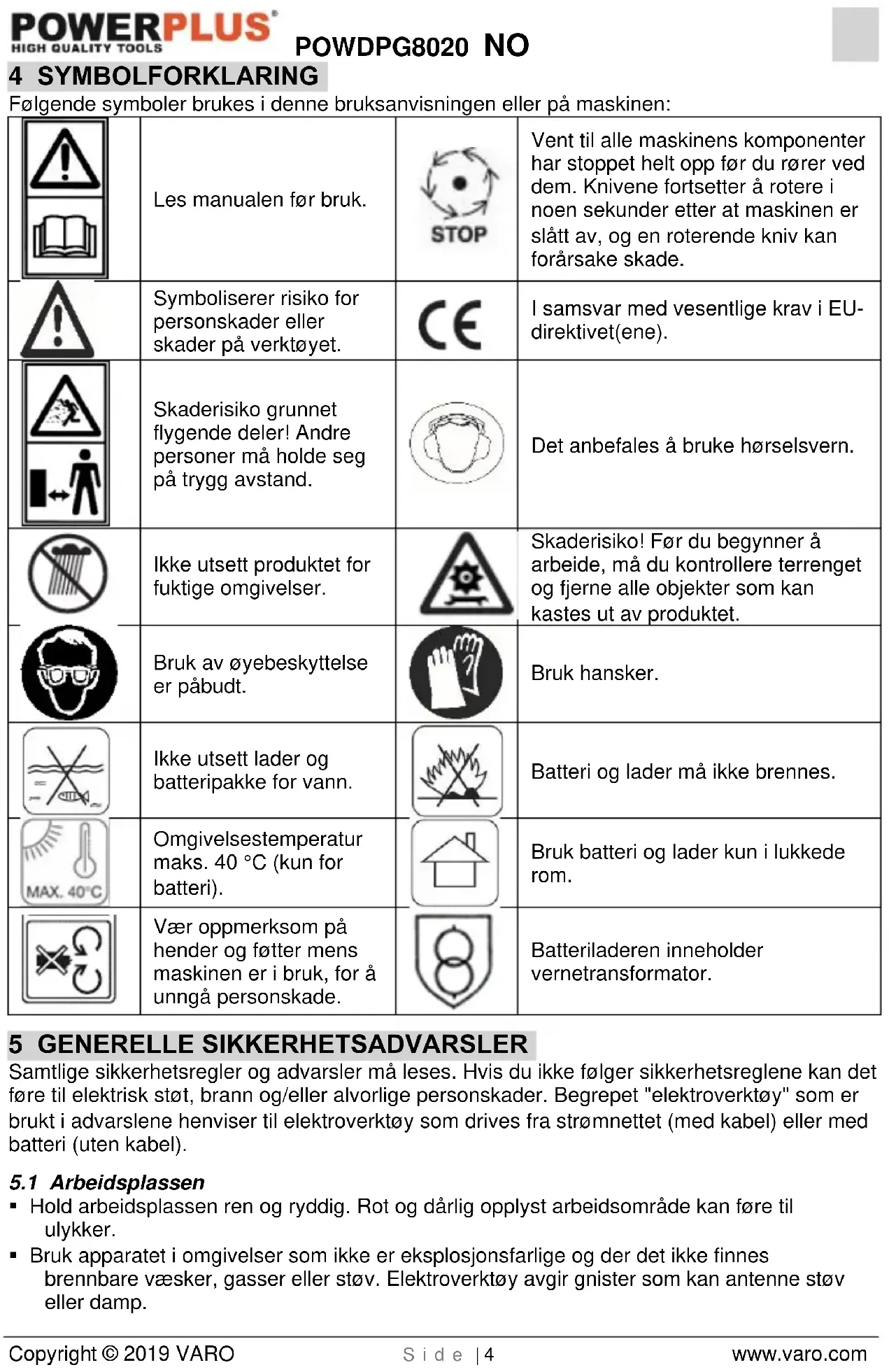 - Trekk støpslet ut av stikkontakten før du gjør justeringer, skifter tilbehør eller setter bort verktøyet. Disse forholdsreglene forhindrer at apparatet startes utilsiktet.POWDPG8020 NO Copyright © 2019 VARO S i d e | 6 www.varo.com