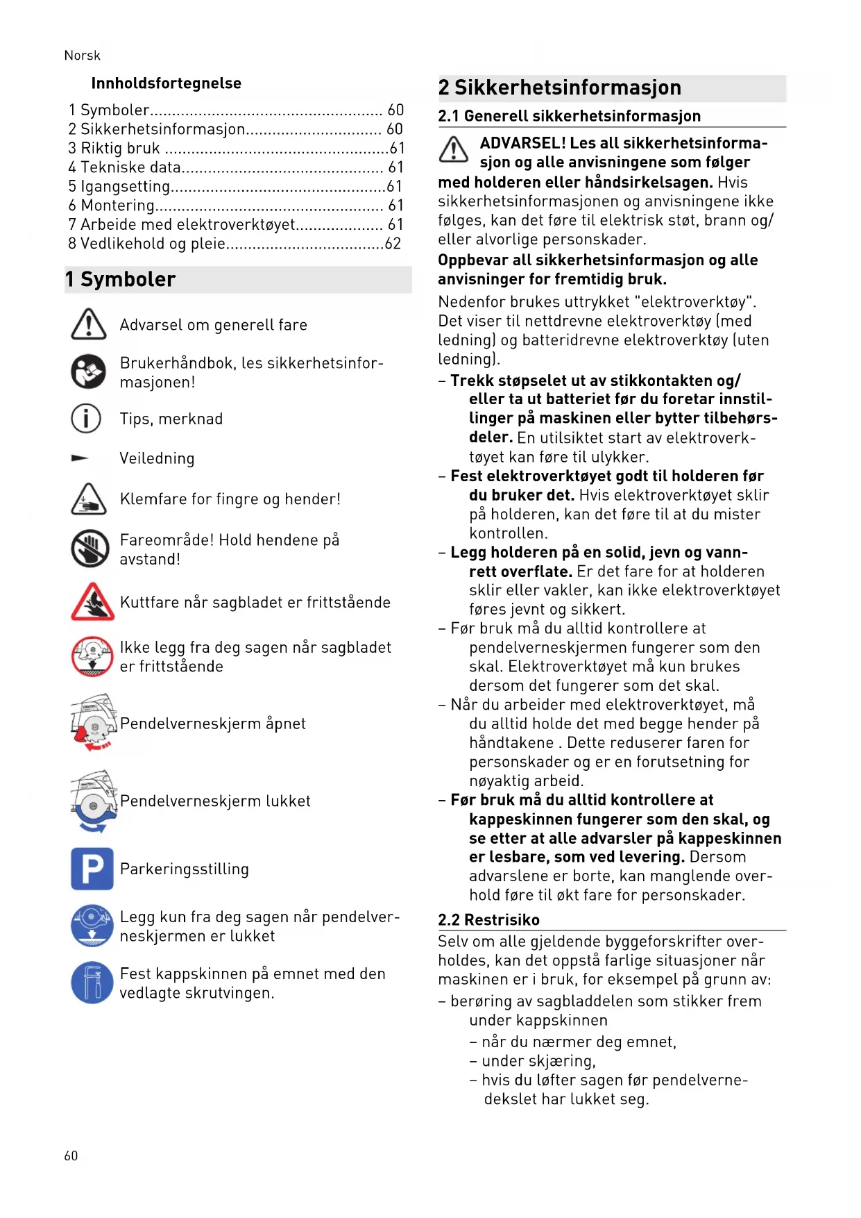 ADVARSEL! Les all sikkerhetsinforma sjon og alle anvisningene som følger med holderen eller håndsirkelsagen. Hvis sikkerhetsinformasjonen og anvisningene ikke følges, kan det føre til elektrisk støt, brann og/ eller alvorlige personskader. Oppbevar all sikkerhetsinformasjon og alle anvisninger for fremtidig bruk. Nedenfor brukes uttrykket "elektroverktøy". Det viser til nettdrevne elektroverktøy (med ledning) og batteridrevne elektroverktøy (uten ledning). – Trekk støpselet ut av stikkontakten og/ eller ta ut batteriet før du foretar innstil linger på maskinen eller bytter tilbehørs deler. En utilsiktet start av elektroverk tøyet kan føre til ulykker. – Fest elektroverktøyet godt til holderen før du bruker det. Hvis elektroverktøyet sklir på holderen, kan det føre til at du mister kontrollen. – Legg holderen på en solid, jevn og vann rett overflate. Er det fare for at holderen sklir eller vakler, kan ikke elektroverktøyet føres jevnt og sikkert. – Før bruk må du alltid kontrollere at pendelverneskjermen fungerer som den skal. Elektroverktøyet må kun brukes dersom det fungerer som det skal. – Når du arbeider med elektroverktøyet, må du alltid holde det med begge hender på håndtakene . Dette reduserer faren for personskader og er en forutsetning for nøyaktig arbeid. – Før bruk må du alltid kontrollere at kappeskinnen fungerer som den skal, og se etter at alle advarsler på kappeskinnen er lesbare, som ved levering. Dersom advarslene er borte, kan manglende over hold føre til økt fare for personskader.