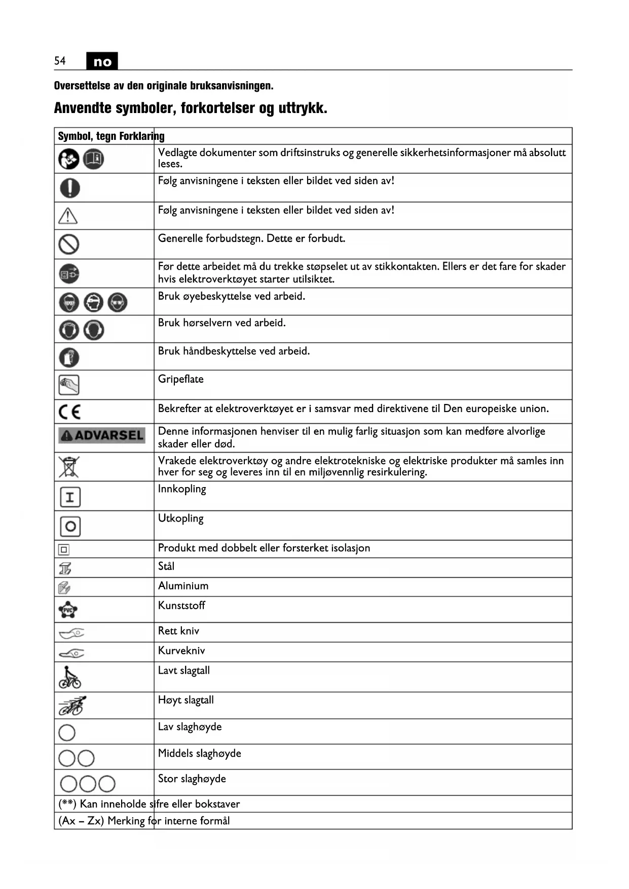 Oversettelse av den originale bruksanvisningen. Anvendte symboler, forkortelser og uttrykk. Symbol, tegn Forklaring Vedlagte dokumenter som driftsinstruks og generelle sikkerhetsinformasjoner må absolutt leses. Følg anvisningene i teksten eller bildet ved siden av! Følg anvisningene i teksten eller bildet ved siden av! Generelle forbudstegn. Dette er forbudt. Før dette arbeidet må du trekke støpselet ut av stikkontakten. Ellers er det fare for skader hvis elektroverktøyet starter utilsiktet. Bruk øyebeskyttelse ved arbeid. Bruk hørselvern ved arbeid. Bruk håndbeskyttelse ved arbeid. Gripeflate Bekrefter at elektroverktøyet er i samsvar med direktivene til Den europeiske union. Denne informasjonen henviser til en mulig farlig situasjon som kan medføre alvorlige skader eller død. Vrakede elektroverktøy og andre elektrotekniske og elektriske produkter må samles inn hver for seg og leveres inn til en miljøvennlig resirkulering. Innkopling Utkopling Produkt med dobbelt eller forsterket isolasjon Stål Aluminium Kunststoff Rett kniv Kurvekniv Lavt slagtall Høyt slagtall Lav slaghøyde Middels slaghøyde Stor slaghøyde (**) Kan inneholde sifre eller bokstaver (Ax – Zx) Merking for interne formål55