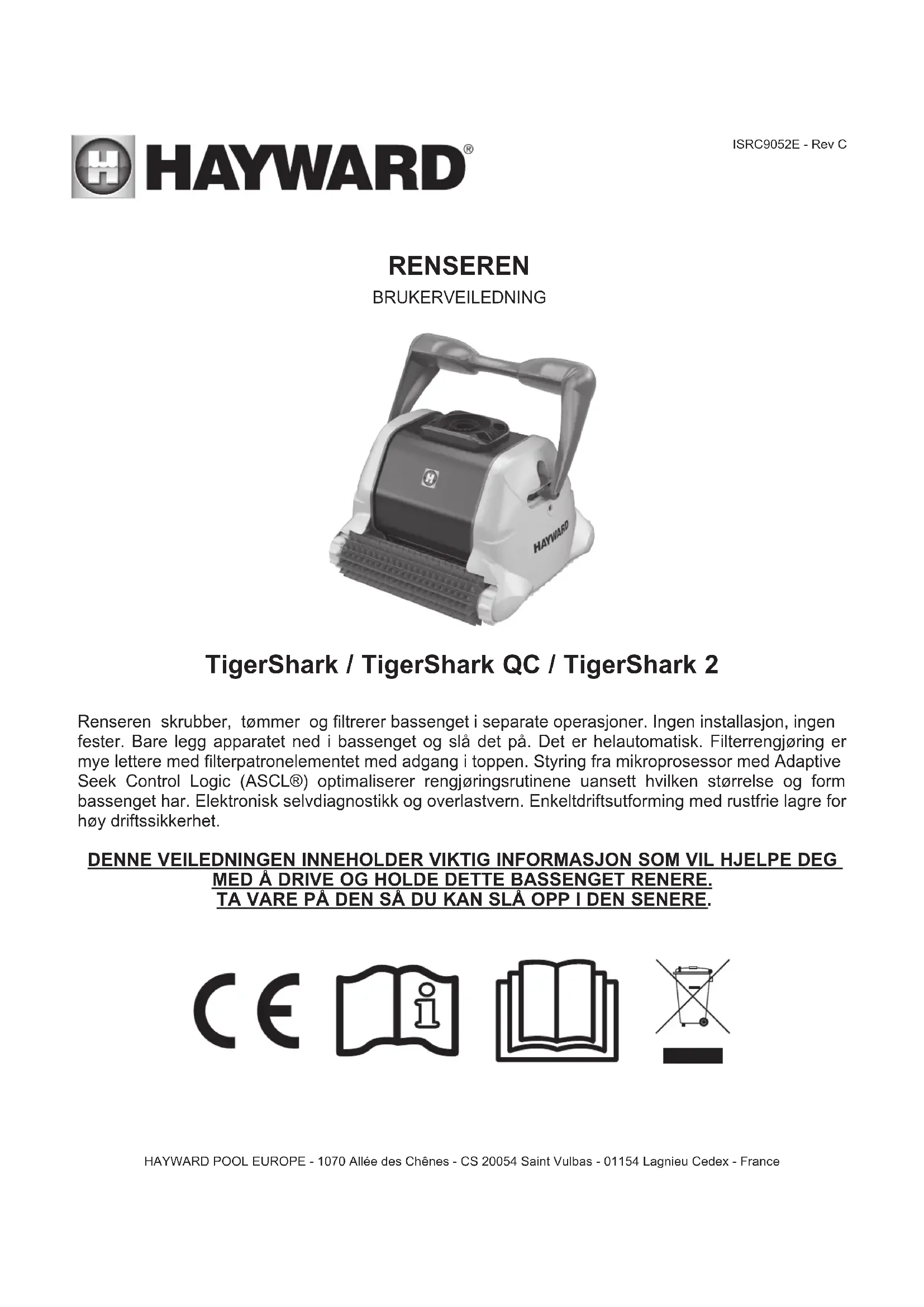 LUX 384-7.702 S2 SK STN 33 2000-7-702 NL NEN 1010-7-702 SLO SIST HD 384-7-702.S2 P RSIUEE TR TS IEC 60364-7-702BARE TIL BRUK EKTE HAYWARD RESERVEDELER Page 14 sur 14 TigerShark / TigerShark QC / TigerShark 2 Rev. C Gratulerer med kjøpet av den datastyrte, helautomatiske bassengrenseren. Hayward er markedets høyeste standard når det gjelder utforming, ytelser og kvalitet. Denne veiledningen inneholder viktig informasjon om bruk og vedlikehold av renseren. REGISTRERE PRODUKTET I VÅR DATABASE : www.hayward.fr (section Services)