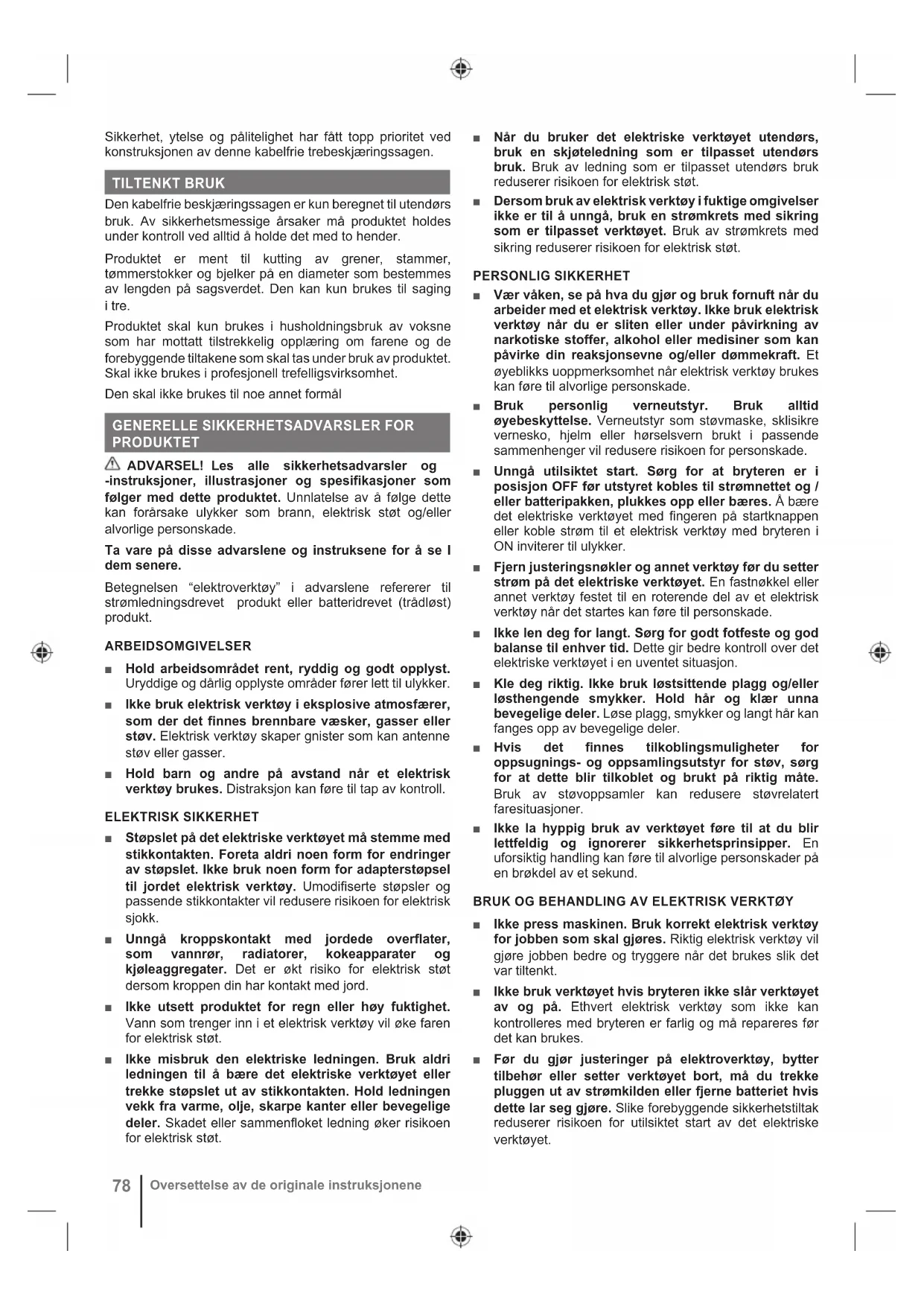 Paina liipaisimen vapautinta ja purista liipaisinkytkintä. HUOMAUTUS: Pysäytä tuote vapauttamalla liipaisinkytkin.78 Oversettelse av de originale instruksjonene Sikkerhet, ytelse og pålitelighet har fått topp prioritet ved konstruksjonen av denne kabelfrie trebeskjæringssagen. TILTENKT BRUK Den kabelfrie beskjæringssagen er kun beregnet til utendørs bruk. Av sikkerhetsmessige årsaker må produktet holdes under kontroll ved alltid å holde det med to hender. Produktet er ment til kutting av grener, stammer, tømmerstokker og bjelker på en diameter som bestemmes av lengden på sagsverdet. Den kan kun brukes til saging i tre. Produktet skal kun brukes i husholdningsbruk av voksne som har mottatt tilstrekkelig opplæring om farene og de forebyggende tiltakene som skal tas under bruk av produktet. Skal ikke brukes i profesjonell trefelligsvirksomhet. Den skal ikke brukes til noe annet formål