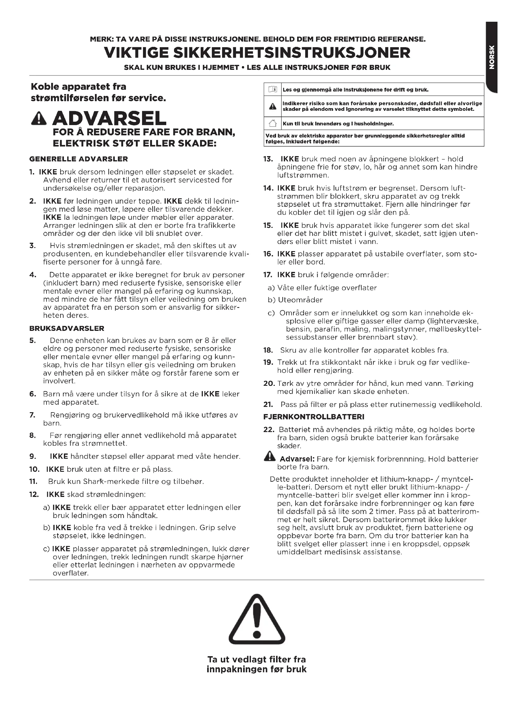 fra barn, siden også brukte batterier kan forårsake skader. Advarsel: Fare for kjemisk forbrennning. Hold batterier borte fra barn. Dette produktet inneholder et lithium-knapp- / myntcel- le-batteri. Dersom et nytt eller brukt lithium-knapp- / myntcelle-batteri blir svelget eller kommer inn i krop- pen, kan det forårsake indre forbrenninger og kan føre til dødsfall på så lite som 2 timer. Pass på at batterirom- met er helt sikret. Dersom batterirommet ikke lukker seg helt, avslutt bruk av produktet, fjern batteriene og oppbevar borte fra barn. Om du tror batterier kan ha blitt svelget eller plassert inne i en kroppsdel, oppsøk umiddelbart medisinsk assistanse. Koble apparatet fra strømtilførselen før service. ADVARSEL FOR Å REDUSERE FARE FOR BRANN, ELEKTRISK STØT ELLER SKADE: Ta ut vedlagt filter fra innpakningen før bruk Les og gjennomgå alle instruksjonene for drift og bruk. Indikerer risiko som kan forårsake personskader, dødsfall eller alvorlige skader på eiendom ved ignorering av varselet tilknyttet dette symbolet.Kun til bruk innendørs og i husholdninger. Ved bruk av elektriske apparater bør grunnleggende sikkerhetsregler alltid følges, inkludert følgende:NORSK