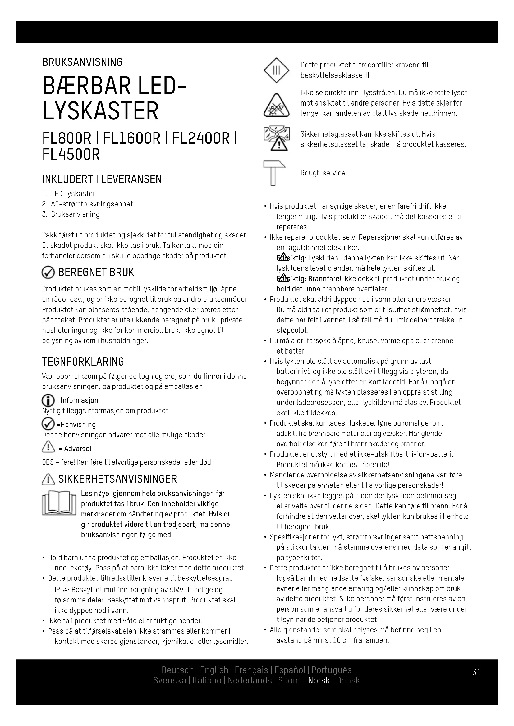 Pakk først ut produktet og sjekk det for fullstendighet og skader. Et skadet produkt skal ikke tas i bruk. Ta kontakt med din forhandler dersom du skulle oppdage skader på produktet. BEREGNET BRUK Produktet brukes som en mobil lyskilde for arbeidsmiljø, åpne områder osv., og er ikke beregnet til bruk på andre bruksområder. Produktet kan plasseres stående, hengende eller bæres etter håndtaket. Produktet er utelukkende beregnet på bruk i private husholdninger og ikke for kommersiell bruk. Ikke egnet til belysning av rom i husholdninger. TEGNFORKLARING Vær oppmerksom på følgende tegn og ord, som du finner i denne bruksanvisningen, på produktet og på emballasjen. =Informasjon Nyttig tilleggsinformasjon om produktet =Henvisning Denne henvisningen advarer mot alle mulige skader = Advarsel OBS – fare! Kan føre til alvorlige personskader eller død SIKKERHETSANVISNINGER Les nøye igjennom hele bruksanvisningen før produktet tas i bruk. Den inneholder viktige merknader om håndtering av produktet. Hvis du gir produktet videre til en tredjepart, må denne bruksanvisningen følge med.