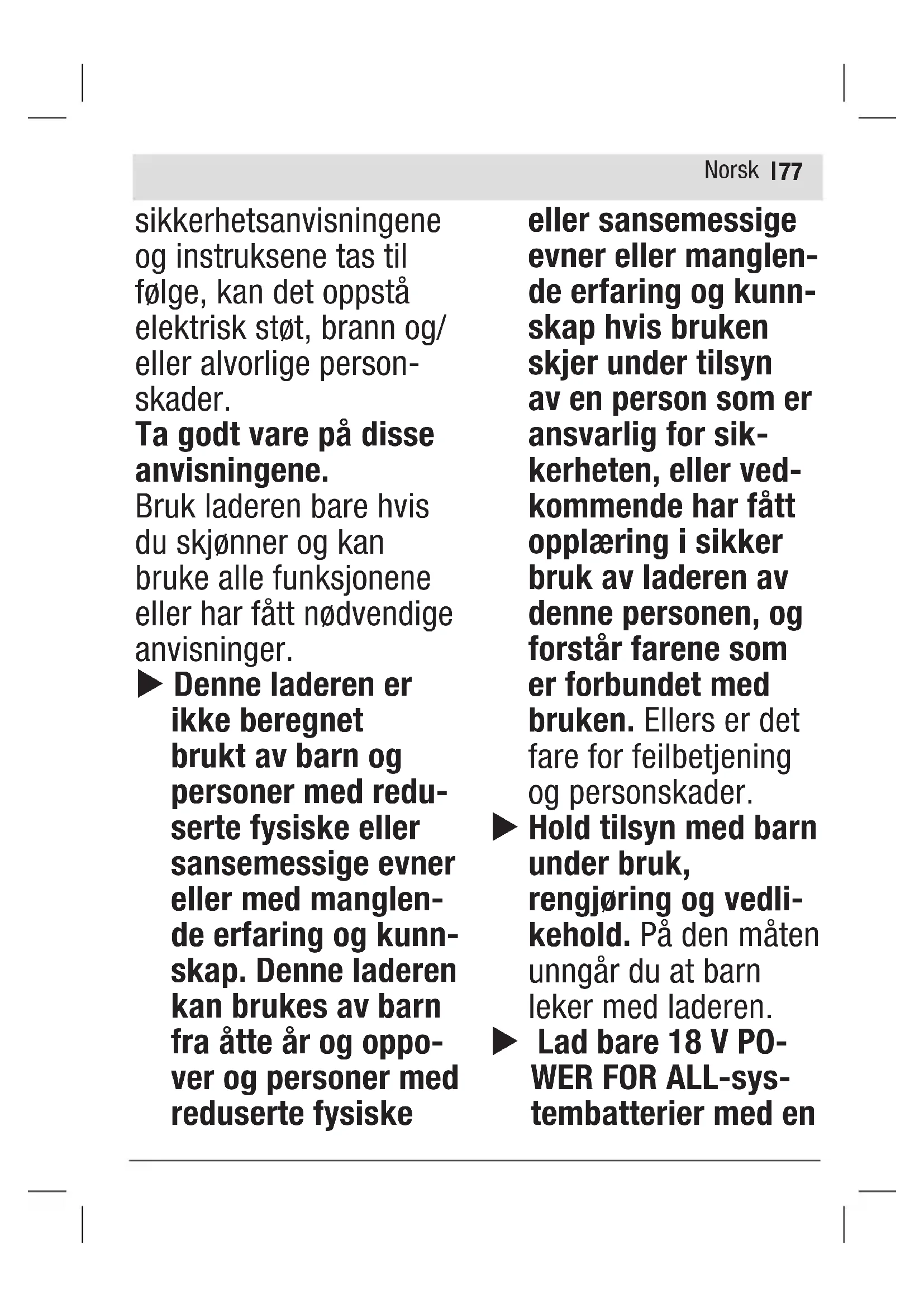 Avhengig av temperatur og batteritype Lading u Ta hensyn til nettspennin- gen! Spenningen til strømkilden må stemme overens med angi- velsene på typeskiltet til ladeapparatet. Kontroller at det ikke finnes grovt smuss på ladeholderen (3) og batterikontaktene. Kontroller at batteriet er satt helt inn. Ladingen starter så snart støpse- let til laderen er satt inn i stikkontakten og batteriet settes i ladeholderen (3). Lading er bare mulig når temperaturen til batteriet er innenfor det tillatte ladetemperaturområdet (0–45 °C). Med den intelligente lademetoden registreres batteriets ladenivå automatisk, og ladingen skjer med optimal ladestrøm avhengig av batteritemperatur og -spen- ning. Dermed skånes batteriet, og det er alltid fulladet under oppbevaring i laderen. En vesentlig kortere driftstid etter oppladingen er et tegn på at batteriet er oppbrukt og må skiftes ut. Ved kontinuerlige ladesykluser eller flere ladesykluser etter hverandre uten avbrudd kan Norsk| 81 laderen bli varm. Dette er imidlertid ikke farlig og betyr ikke at det er en teknisk feil på laderen. Ladetid Tabellen nedenfor viser omtrent hvor mange minutter det tar før ønsket ladenivå er nådd, avhengig av batteritypen. Ladetiden avhenger av batterity- pen og temperaturen. P4A 18-C70 Oppladbare 18