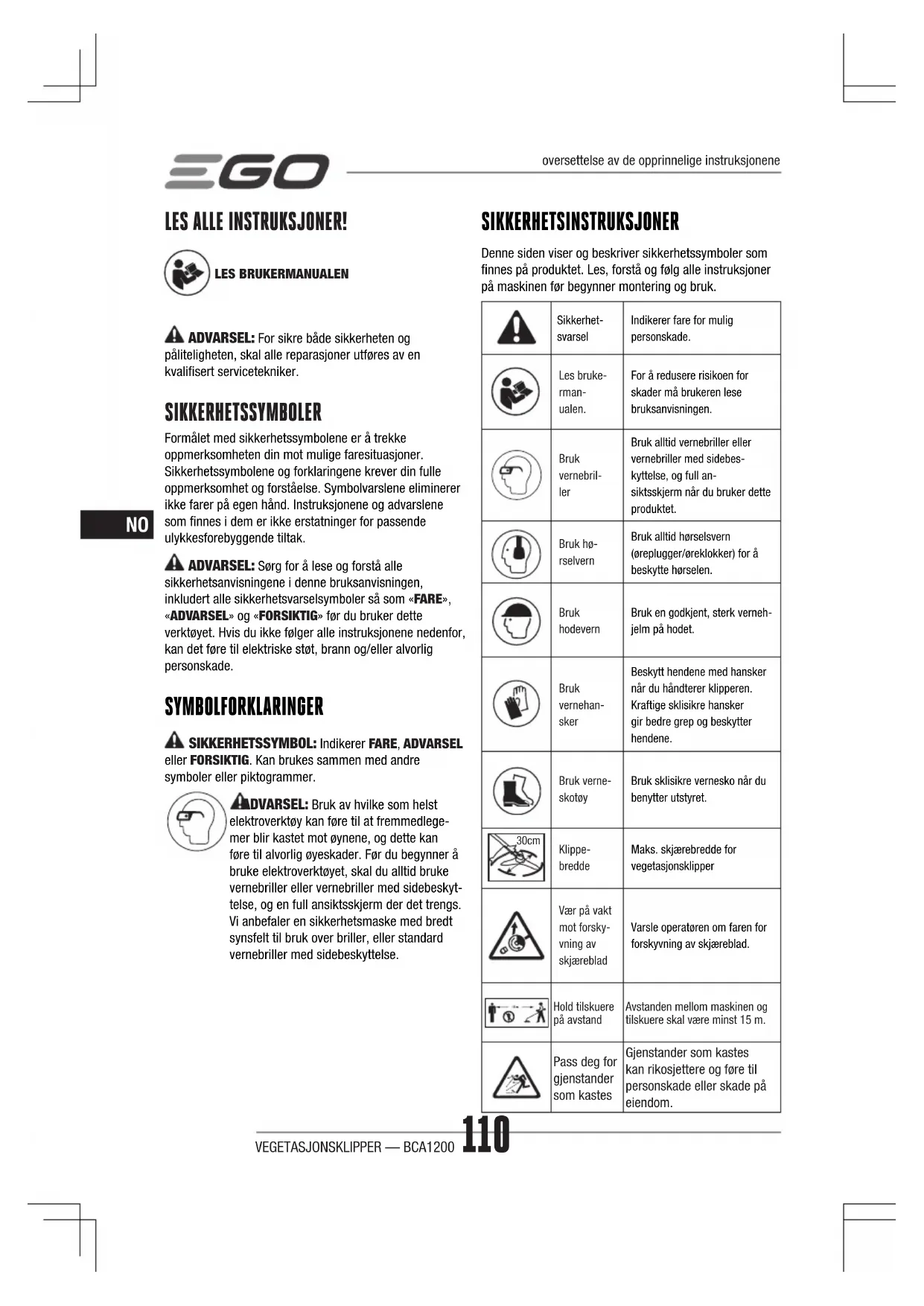 LES ALLE INSTRUKSJONER! LES BRUKERMANUALEN ADVARSEL: For sikre både sikkerheten og påliteligheten, skal alle reparasjoner utføres av en kvalisert servicetekniker. SIKKERHETSSYMBOLER Formålet med sikkerhetssymbolene er å trekke oppmerksomheten din mot mulige faresituasjoner. Sikkerhetssymbolene og forklaringene krever din fulle oppmerksomhet og forståelse. Symbolvarslene eliminerer ikke farer på egen hånd. Instruksjonene og advarslene som nnes i dem er ikke erstatninger for passende ulykkesforebyggende tiltak. ADVARSEL: Sørg for å lese og forstå alle sikkerhetsanvisningene i denne bruksanvisningen, inkludert alle sikkerhetsvarselsymboler så som «FARE», «ADVARSEL» og «FORSIKTIG» før du bruker dette verktøyet. Hvis du ikke følger alle instruksjonene nedenfor, kan det føre til elektriske støt, brann og/eller alvorlig personskade. SYMBOLFORKLARINGER SIKKERHETSSYMBOL: Indikerer FARE, ADVARSEL eller FORSIKTIG. Kan brukes sammen med andre symboler eller piktogrammer. ADVARSEL: Bruk av hvilke som helst elektroverktøy kan føre til at fremmedlege- mer blir kastet mot øynene, og dette kan føre til alvorlig øyeskader. Før du begynner å bruke elektroverktøyet, skal du alltid bruke vernebriller eller vernebriller med sidebeskyt- telse, og en full ansiktsskjerm der det trengs. Vi anbefaler en sikkerhetsmaske med bredt synsfelt til bruk over briller, eller standard vernebriller med sidebeskyttelse. SIKKERHETSINSTRUKSJONER Denne siden viser og beskriver sikkerhetssymboler som nnes på produktet. Les, forstå og følg alle instruksjoner på maskinen før begynner montering og bruk. Sikkerhet- svarselIndikerer fare for mulig personskade.Les bruke- rman- ualen.For å redusere risikoen for skader må brukeren lese bruksanvisningen.Bruk vernebril- ler Bruk alltid vernebriller eller vernebriller med sidebes- kyttelse, og full an- siktsskjerm når du bruker dette produktet.Bruk hø- rselvernBruk alltid hørselsvern (øreplugger/øreklokker) for å beskytte hørselen.Bruk hodevernBruk en godkjent, sterk verneh-jelm på hodet.Bruk vernehan- sker Beskytt hendene med hansker når du håndterer klipperen. Kraftige sklisikre hansker gir bedre grep og beskytter hendene.Bruk verne- skotøyBruk sklisikre vernesko når du benytter utstyret. 30cm Klippe- breddeMaks. skjærebredde for vegetasjonsklipperVær på vakt mot forsky- vning av skjærebladVarsle operatøren om faren for forskyvning av skjæreblad. Hold tilskuere på avstandAvstanden mellom maskinen og tilskuere skal være minst 15 m. Pass deg for gjenstander som kastes Gjenstander som kastes kan rikosjettere og føre til personskade eller skade på eiendom. oversettelse av de opprinnelige instruksjoneneVEGETASJONSKLIPPER — BCA1200 111