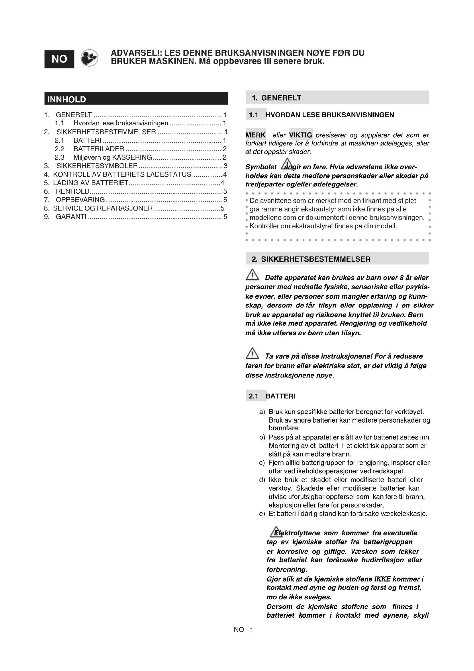 a) Bruk kun spesikke batterier beregnet for verktøyet. Bruk av andre batterier kan medføre personskader og brannfare. b) Pass på at apparatet er slått av før batteriet settes inn. Montering av et batteri i et elektrisk apparat som er slått på kan medføre brann. c) Fjern alltid batterigruppen før rengjøring, inspiser eller utfør vedlikeholdsoperasjoner ved redskapet. d) Ikke bruk et skadet eller modiserte batteri eller verktøy. Skadede eller modiserte batterier kan utvise uforutsigbar oppførsel som kan føre til brann, eksplosjon eller fare for personskader. e) Et batteri i dårlig stand kan forårsake væskelekkasje. Elektrolyttene som kommer fra eventuelle tap av kjemiske stoer fra batterigruppen er korrosive og giftige. Væsken som lekker fra batteriet kan forårsake hudirritasjon eller forbrenning. Gjør slik at de kjemiske stoene IKKE kommer i kontakt med øyne og huden og først og fremst, mo de ikke svelges. Dersom de kjemiske stoene som nnes i batteriet kommer i kontakt med øynene, skyll ADVARSEL!: LES DENNE BRUKSANVISNINGEN NØYE FØR DU BRUKER MASKINEN. Må oppbevares til senere bruk.