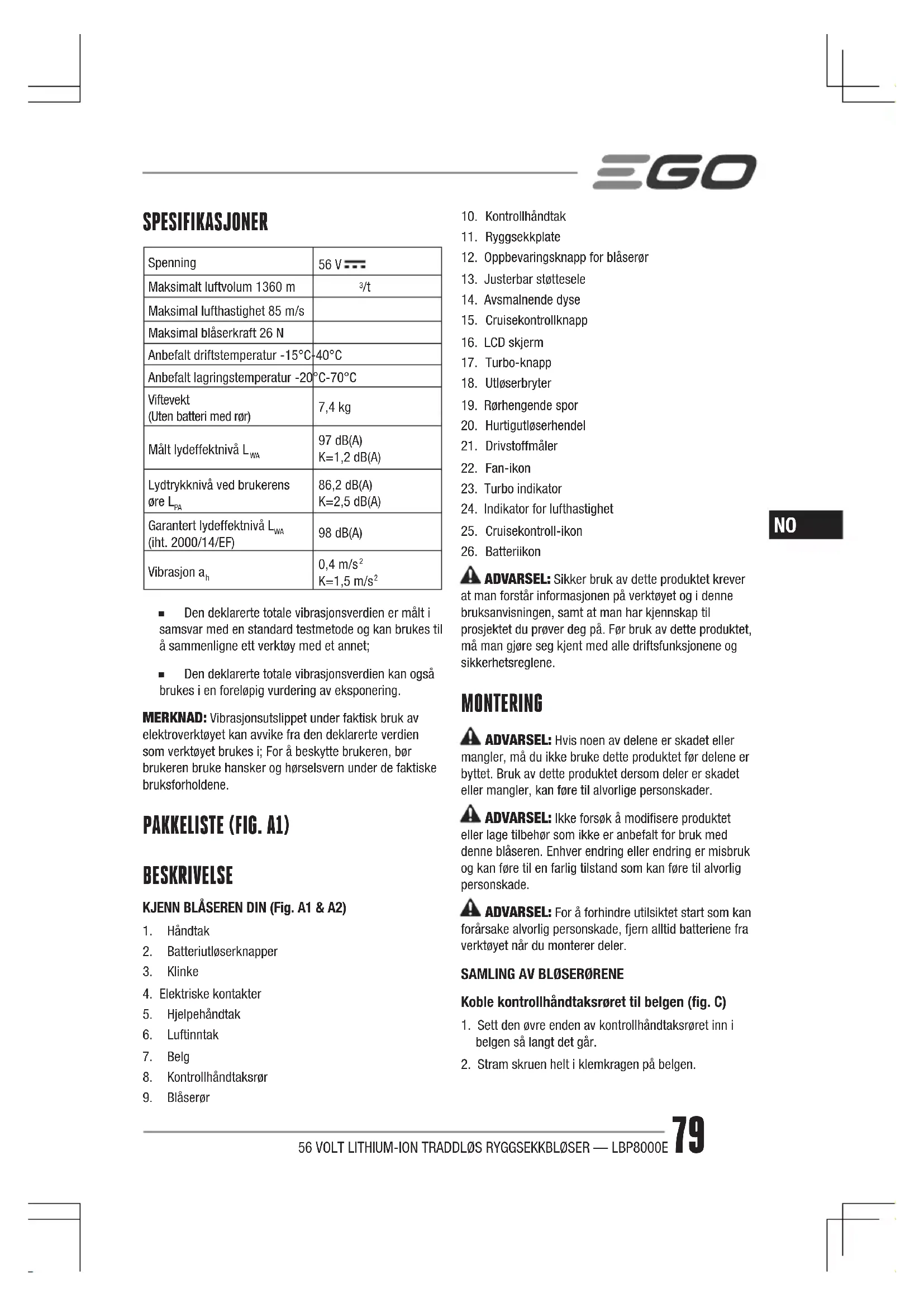 FEILSØKING PROBLEM ÅRSAK LØSNINGBlåseren virker ikke. ◾ Ingen elektrisk kontakt mellom blåseren og batteriene. ◾ Ta ut batteriet, sjekk kontaktene og sett inn batteriet igjen. ◾ Batteriene er utladet. ◾ Lad batteriene. ◾ Batteriene eller blåseren er for varm. ◾ Avkjøl batteriene og blåser til temperaturen synker under 67°C. Lufthastigheten er betydelig redusert. ◾ Luftinntaket er blokkert av smuss. ◾ Ta ut batteriene, fjern rusk. ◾ Motorviften er utslitt. ◾ Kontakt EGO servicesenter for reparasjon. LCD-skjermfeil. ◾ LCD -enheten er ødelagt eller dårlig ledningstilkobling til LCD -enheten. ◾ Kontakt EGO servicesenter for reparasjon. GARANTI EGO GARANTIPOLITIKK Besøk nettstedet egopowerplus.com for fullstendige vilkår og betingelser for EGO-garantipolicyen.БЕСПРОВОДНАЯ РАНЦЕВАЯ ВОЗДУХОДУВКА С ЛИТИЙ-ИОННЫМ АККУМУЛЯТОРОМ 56 В — LBP8000E84