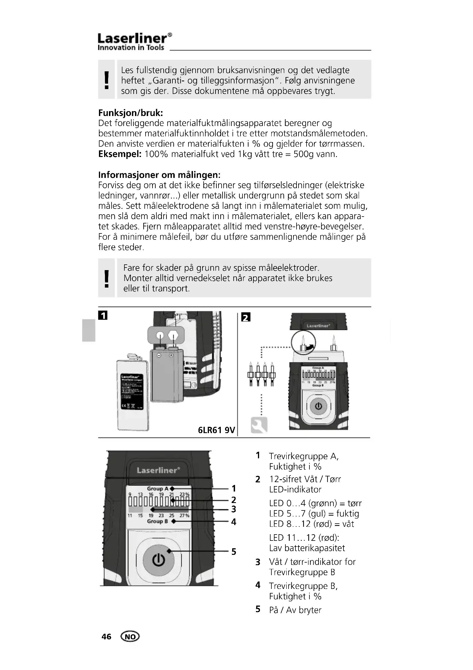 EU-krav og kassering Apparatet oppfyller alle nødvendige normer for fri samhandel innenfor EU. Dette produktet er et elektroapparat og må kildesorteres og avfallsbehandles tilsvarende ifølge det europeiske direktivet for avfall av elektrisk og elektronisk utstyr. Ytterligere sikkerhetsinstrukser og tilleggsinformasjon på: www.laserliner.com/info Resistiv måling av materialfuktig-het via integrerte elektroder2 Trevirke-skalaer9% … 23%11% … 27% ± 2% 22 °C0 °C…40 °C-10 °C…70 °C 85% 1 x 6LR61 9Vca. 40 hMåleprinsipp MaterialMåleområde trevirkegruppe AMåleområde trevirkegruppe BNøyaktighetNominell temperaturTillatt arbeidstemp.Tillatt lagertemperaturTillatt maks. rel. luftfuktighetSpenningstilførselBatterienes brukstid Tekniske data Det tas forbehold om tekniske endringer. 01.15. Funksjonen og driftssikkerheten er kun sikret når måleapparatet brukes under de angitte klimatiske betingelsene og kun til de formål det ble konstruert for. Bedømmelsen av måleresultatene og de tilsvarende tiltakene er brukerens eget ansvar, avhengig av den respektive arbeidsoppgaven.