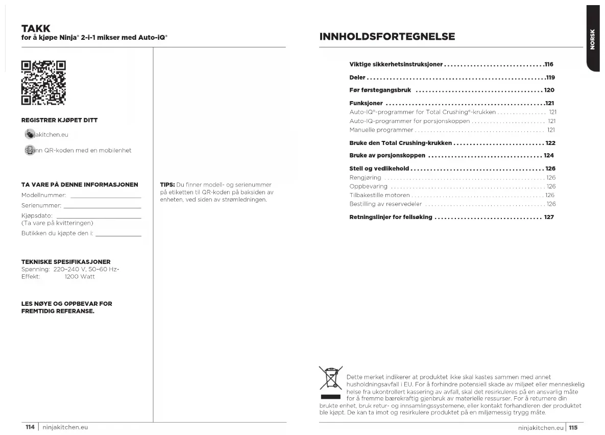 ninjakitchen.eu Skann QR-koden med en mobilenhet Dette merket indikerer at produktet ikke skal kastes sammen med annet husholdningsavfall i EU. For å forhindre potensiell skade av miljøet eller menneskelig helse fra ukontrollert kassering av avfall, skal det resirkuleres på en ansvarlig måte for å fremme bærekraftig gjenbruk av materielle ressurser. For å returnere din brukte enhet, bruk retur- og innsamlingssystemene, eller kontakt forhandleren der produktet ble kjøpt. De kan ta imot og resirkulere produktet på en miljømessig trygg måte. NORSK