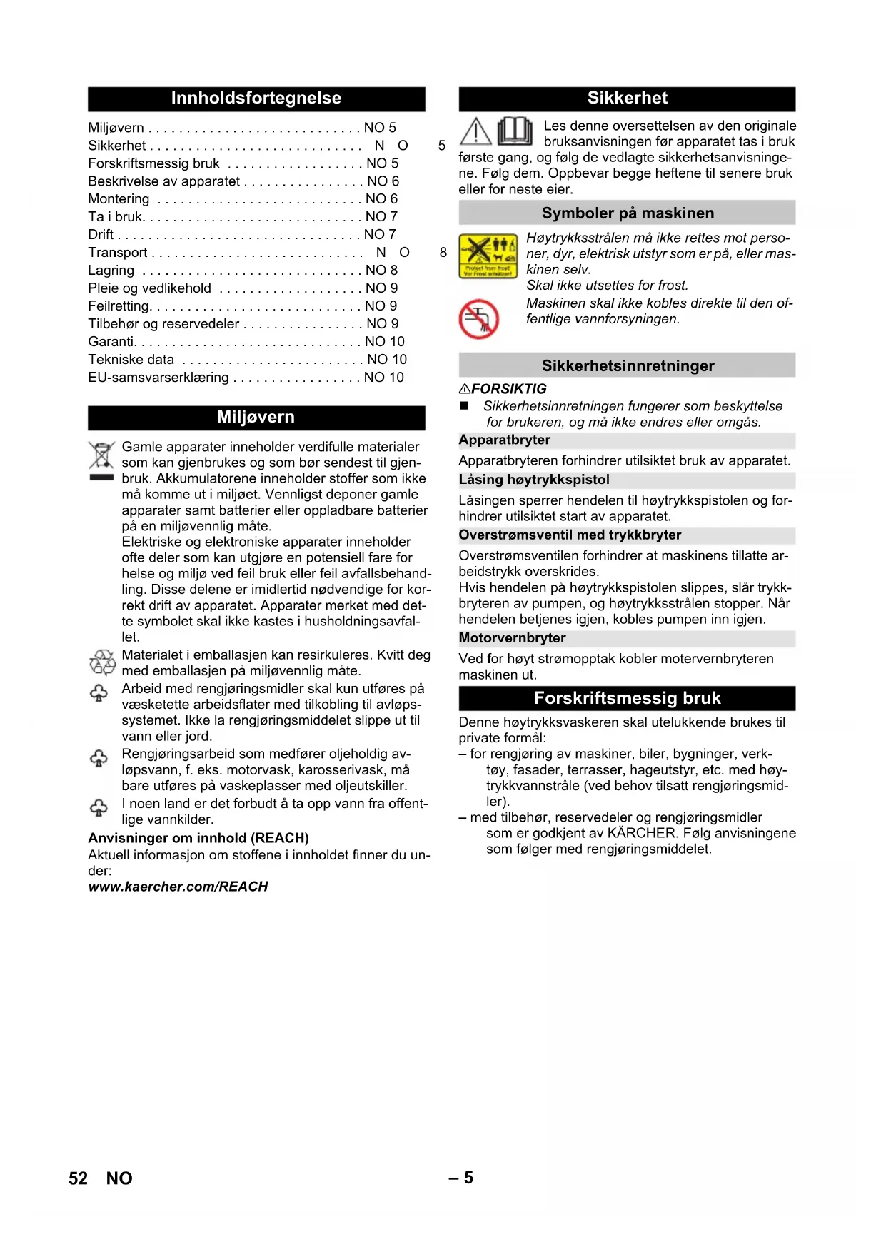 90 dB(A) Der tages forbehold for tekniske ændringer. EU-overensstemmelseserklæring Produkt: Højtryksrenser Type: 1.324-xxx Gældende EU-direktiver 2006/42/EF (+2009/127/EF) 2014/30/EU 2011/65/EU 2000/14/EF Anvendte harmoniserede standarder EN 50581 EN 55014–1: 2006+A1: 2009+A2: 2011 EN 55014–2: 2015 EN 60335–1 EN 60335–2–79 EN 61000–3–2: 2014 EN 61000–3–3: 2013 EN 62233: 2008 Anvendte overensstemmelsesvurderingsprocedurer 2000/14/EF: Bilag V Lydeffektniveau dB(A) Målt: 88 Garanteret: 90 Winnenden, 2018/10/01 Chairman of the Board of Management Director Regulatory Affairs & Certification 51DA– 5 Anvisninger om innhold (REACH) Aktuell informasjon om stoffene i innholdet finner du un- der: www.kaercher.com/REACH Les denne oversettelsen av den originale bruksanvisningen før apparatet tas i bruk første gang, og følg de vedlagte sikkerhetsanvisninge- ne. Følg dem. Oppbevar begge heftene til senere bruk eller for neste eier. 몇 FORSIKTIG Sikkerhetsinnretningen fungerer som beskyttelse for brukeren, og må ikke endres eller omgås. Apparatbryteren forhindrer utilsiktet bruk av apparatet. Låsingen sperrer hendelen til høytrykkspistolen og for- hindrer utilsiktet start av apparatet. Overstrømsventilen forhindrer at maskinens tillatte ar- beidstrykk overskrides. Hvis hendelen på høytrykkspistolen slippes, slår trykk- bryteren av pumpen, og høytrykksstrålen stopper. Når hendelen betjenes igjen, kobles pumpen inn igjen. Ved for høyt strømopptak kobler motervernbryteren maskinen ut. Denne høytrykksvaskeren skal utelukkende brukes til private formål: – for rengjøring av maskiner, biler, bygninger, verk- tøy, fasader, terrasser, hageutstyr, etc. med høy- trykkvannstråle (ved behov tilsatt rengjøringsmid- ler). – med tilbehør, reservedeler og rengjøringsmidler som er godkjent av KÄRCHER. Følg anvisningene som følger med rengjøringsmiddelet. Innholdsfortegnelse Miljøvern . . . . . . . . . . . . . . . . . . . . . . . . . . . . NO 5 Sikkerhet . . . . . . . . . . . . . . . . . . . . . . . . . . . .NO 5 Forskriftsmessig bruk . . . . . . . . . . . . . . . . . . NO 5 Beskrivelse av apparatet . . . . . . . . . . . . . . . . NO 6 Montering . . . . . . . . . . . . . . . . . . . . . . . . . . . NO 6 Ta i bruk. . . . . . . . . . . . . . . . . . . . . . . . . . . . . NO 7 Drift . . . . . . . . . . . . . . . . . . . . . . . . . . . . . . . . NO 7 Transport . . . . . . . . . . . . . . . . . . . . . . . . . . . .NO 8 Lagring . . . . . . . . . . . . . . . . . . . . . . . . . . . . . NO 8 Pleie og vedlikehold . . . . . . . . . . . . . . . . . . . NO 9 Feilretting. . . . . . . . . . . . . . . . . . . . . . . . . . . . NO 9 Tilbehør og reservedeler . . . . . . . . . . . . . . . . NO 9 Garanti. . . . . . . . . . . . . . . . . . . . . . . . . . . . . . NO 10 Tekniske data . . . . . . . . . . . . . . . . . . . . . . . . NO 10 EU-samsvarserklæring . . . . . . . . . . . . . . . . . NO 10 Miljøvern Gamle apparater inneholder verdifulle materialer som kan gjenbrukes og som bør sendest til gjen- bruk. Akkumulatorene inneholder stoffer som ikke må komme ut i miljøet. Vennligst deponer gamle apparater samt batterier eller oppladbare batterier på en miljøvennlig måte. Elektriske og elektroniske apparater inneholder ofte deler som kan utgjøre en potensiell fare for helse og miljø ved feil bruk eller feil avfallsbehand- ling. Disse delene er imidlertid nødvendige for kor- rekt drift av apparatet. Apparater merket med det- te symbolet skal ikke kastes i husholdningsavfal- let. Materialet i emballasjen kan resirkuleres. Kvitt deg med emballasjen på miljøvennlig måte. Arbeid med rengjøringsmidler skal kun utføres på væsketette arbeidsflater med tilkobling til avløps- systemet. Ikke la rengjøringsmiddelet slippe ut til vann eller jord. Rengjøringsarbeid som medfører oljeholdig av- løpsvann, f. eks. motorvask, karosserivask, må bare utføres på vaskeplasser med oljeutskiller. I noen land er det forbudt å ta opp vann fra offent- lige vannkilder. Sikkerhet Symboler på maskinen Høytrykksstrålen må ikke rettes mot perso- ner, dyr, elektrisk utstyr som er på, eller mas- kinen selv. Skal ikke utsettes for frost. Maskinen skal ikke kobles direkte til den of- fentlige vannforsyningen. Sikkerhetsinnretninger Apparatbryter Låsing høytrykkspistol Overstrømsventil med trykkbryter Motorvernbryter Forskriftsmessig bruk 52 NO– 6 Leveringsomfanget til apparatet (avhengig av modell) er vist på emballasjen. Denne bruksanvisningen beskriver alle mulige opsjoner. Ved manglende tilbehør eller ved transportskader, vennligst informer forhandleren. Illustrasjoner se utfoldingsside 3 1 Koblingsdel for vanntilkoblingen 2 Vanntilkobling med innebygget sil 3 Høytrykksslange 4 Slangeføring 5 Oppbevaring for strålerør 6 Oppbevaring/Parkeringsposisjon for høytrykkspis- tol 7 Tilkobling for Plug 'n' Clean rengjøringsmiddel 8 Bærehåndtak 9 Transportgrep, uttrekkbar 10 Slangeholder 11 Høytrykksforsyning 12 Apparatbryter "0/OFF" / "I/ON" 13 Strømledning med støpsel 14 Typeskilt 15 Tilbehørsrom 16 Krok for feste på nettet 17 Nett for tilbehørsrom 18 Transporthjul 19 Støttefot med bærehåndtak 20 Full Control høytrykkspistol 21 Batterirom 22 LED trykkindikator MIX / 1 - SOFT / 2 - MEDIUM / 3 - HARD 23 Låsing batterirom 24 Låsing høytrykkspistol 25 Tast for å skille høytrykkslangen fra høytrykkspis- tolen 26 Full Control strålerør Vario Power For enkle rengjøringsoppgaver Trykktrinn: HARD / MEDIUM / SOFT / MIX 27 Full Control strålerør smussfres For hardnakket smuss Trykktrinn: HARD Illustrasjoner se utfoldingsside 4 De løse delene som følger apparatet skal monteres før det tas i bruk. Du trenger de medleverte skruene og en skrutrekker med krysspor PH 2. Figur Sikre hjulene med de medfølgende proppene. Pass på innretting av proppene! Deksel settes på og skrus fast. Figur Sette inn støtteben. Sett inn de vedlagte dyblene (plugger) i hullene til ansla