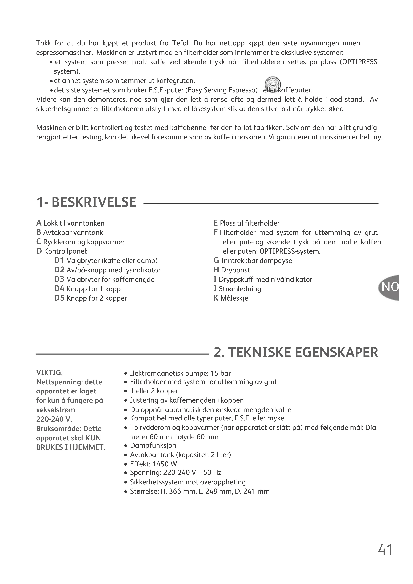 A Lokk til vanntanken B Avtakbar vanntank C Rydderom og koppvarmer D Kontrollpanel: D1 Valgbryter (kaffe eller damp) D2 Av/på-knapp med lysindikator D3 Valgbryter for kaffemengde D4 Knapp for 1 kopp D5 Knapp for 2 kopper E Plass til filterholder F Filterholder med system for uttømming av grut eller pute og økende trykk på den malte kaffen eller puten: OPTIPRESS-system. G Inntrekkbar dampdyse H Drypprist I Dryppskuff med nivåindikator J Strømledning K Måleskje Takk for at du har kjøpt et produkt fra Tefal. Du har nettopp kjøpt den siste nyvinningen innen espressomaskiner. Maskinen er utstyrt med en filterholder som innlemmer tre eksklusive systemer: