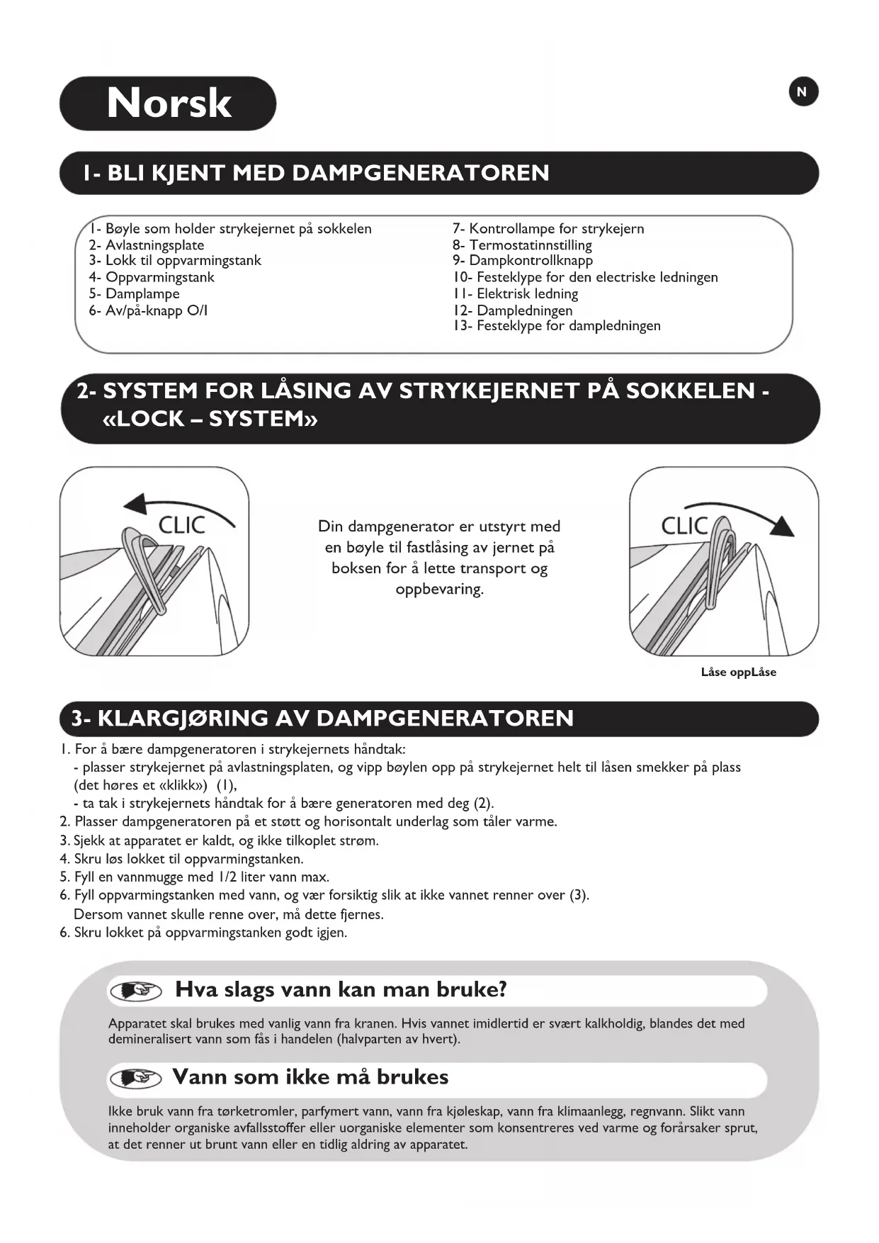 Din dampgenerator er utstyrt med en bøyle til fastlåsing av jernet på boksen for å lette transport og oppbevaring. Låse oppLåse4- IGANGSETTING AV DAMPGENERATOREN
