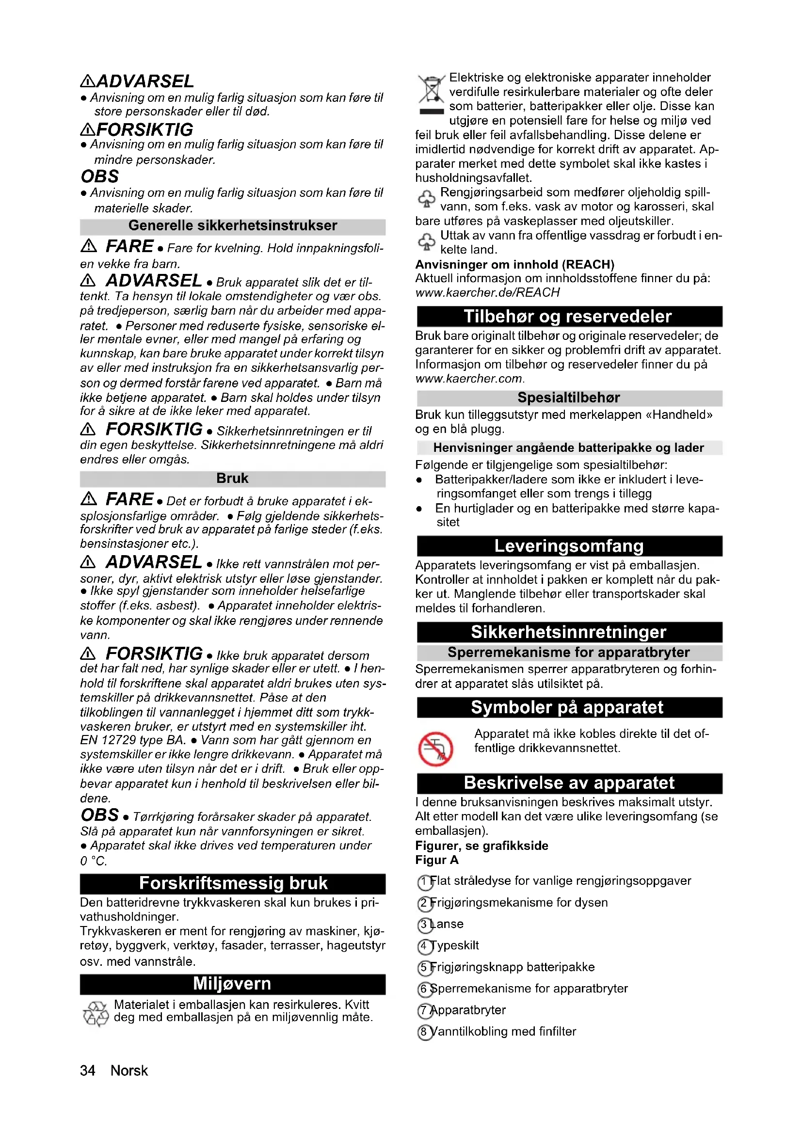 - EU-samsvarserklæring Chairman of the Board of Management Director Regulatory Affairs & Certification H. Jenner S. Reiser34 Norsk 몇 ADVARSEL ● Anvisning om en mulig farlig situasjon som kan føre til store personskader eller til død. 몇 FORSIKTIG ● Anvisning om en mulig farlig situasjon som kan føre til mindre personskader. OBS ● Anvisning om en mulig farlig situasjon som kan føre til materielle skader. Generelle sikkerhetsinstrukser FARE ● Fare for kvelning. Hold innpakningsfoli- en vekke fra barn. 몇 ADVARSEL ● Bruk apparatet slik det er til- tenkt. Ta hensyn til lokale omstendigheter og vær obs. på tredjeperson, særlig barn når du arbeider med appa- ratet. ● Personer med reduserte fysiske, sensoriske el- ler mentale evner, eller med mangel på erfaring og kunnskap, kan bare bruke apparatet under korrekt tilsyn av eller med instruksjon fra en sikkerhetsansvarlig per- son og dermed forstår farene ved apparatet. ● Barn må ikke betjene apparatet. ● Barn skal holdes under tilsyn for å sikre at de ikke leker med apparatet. 몇 FORSIKTIG ● Sikkerhetsinnretningen er til din egen beskyttelse. Sikkerhetsinnretningene må aldri endres eller omgås. Bruk FARE ● Det er forbudt å bruke apparatet i ek- splosjonsfarlige områder. ● Følg gjeldende sikkerhets- forskrifter ved bruk av apparatet på farlige steder (f.eks. bensinstasjoner etc.). 몇 ADVARSEL ● Ikke rett vannstrålen mot per- soner, dyr, aktivt elektrisk utstyr eller løse gjenstander. ● Ikke spyl gjenstander som inneholder helsefarlige stoffer (f.eks. asbest). ● Apparatet inneholder elektris- ke komponenter og skal ikke rengjøres under rennende vann. 몇 FORSIKTIG ● Ikke bruk apparatet dersom det har falt ned, har synlige skader eller er utett. ● I hen- hold til forskriftene skal apparatet aldri brukes uten sys- temskiller på drikkevannsnettet. Påse at den tilkoblingen til vannanlegget i hjemmet ditt som trykk- vaskeren bruker, er utstyrt med en systemskiller iht. EN 12729 type BA. ● Vann som har gått gjennom en systemskiller er ikke lengre drikkevann. ● Apparatet må ikke være uten tilsyn når det er i drift. ● Bruk eller opp- bevar apparatet kun i henhold til beskrivelsen eller bil- dene. OBS ● Tørrkjøring forårsaker skader på apparatet. Slå på apparatet kun når vannforsyningen er sikret. ● Apparatet skal ikke drives ved temperaturen under 0 °C. Forskriftsmessig bruk Den batteridrevne trykkvaskeren skal kun brukes i pri- vathusholdninger. Trykkvaskeren er ment for rengjøring av maskiner, kjø- retøy, byggverk, verktøy, fasader, terrasser, hageutstyr osv. med vannstråle. Miljøvern Materialet i emballasjen kan resirkuleres. Kvitt deg med emballasjen på en miljøvennlig måte. Elektriske og elektroniske apparater inneholder verdifulle resirkulerbare materialer og ofte deler som batterier, batteripakker eller olje. Disse kan utgjøre en potensiell fare for helse og miljø ved feil bruk eller feil avfallsbehandling. Disse delene er imidlertid nødvendige for korrekt drift av apparatet. Ap- parater merket med dette symbolet skal ikke kastes i husholdningsavfallet. Rengjøringsarbeid som medfører oljeholdig spill- vann, som f.eks. vask av motor og karosseri, skal bare utføres på vaskeplasser med oljeutskiller. Uttak av vann fra offentlige vassdrag er forbudt i en- kelte land. Anvisninger om innhold (REACH) Aktuell informasjon om innholdsstoffene finner du på: www.kaercher.de/REACH Tilbehør og reservedeler Bruk bare originalt tilbehør og originale reservedeler; de garanterer for en sikker og problemfri drift av apparatet. Informasjon om tilbehør og reservedeler finner du på www.kaercher.com. Spesialtilbehør Bruk kun tilleggsutstyr med merkelappen «Handheld» og en blå plugg. Henvisninger angående batteripakke og lader Følgende er tilgjengelige som spesialtilbehør: ● Batteripakker/ladere som ikke er inkludert i leve- ringsomfanget eller som trengs i tillegg ● En hurtiglader og en batteripakke med større kapa- sitet Leveringsomfang Apparatets leveringsomfang er vist på emballasjen. Kontroller at innholdet i pakken er komplett når du pak- ker ut. Manglende tilbehør eller transportskader skal meldes til forhandleren. Sikkerhetsinnretninger Sperremekanisme for apparatbryter Sperremekanismen sperrer apparatbryteren og forhin- drer at apparatet slås utilsiktet på. Symboler på apparatet Beskrivelse av apparatet I denne bruksanvisningen beskrives maksimalt utstyr. Alt etter modell kan det være ulike leveringsomfang (se emballasjen). Figurer, se grafikkside Figur A 1 Flat stråledyse for vanlige rengjøringsoppgaver 2 Frigjøringsmekanisme for dysen 3 Lanse 4 Typeskilt 5 Frigjøringsknapp batteripakke 6 Sperremekanisme for apparatbryter 7 Apparatbryter 8 Vanntilkobling med finfilter Apparatet må ikke kobles direkte til det of- fentlige drikkevannsnettet.Norsk 35 9 Batteridrevet trykkvasker 10 Kobling for vanntilkoblingen 11 ** Hageslange (stofforsterket, diameter minst 1/2 tomme (13 mm), lengde minst 7,5 m, med vanlig hurtigkobling) 12 *Sugeslange med koblingsstykke 13 *Batteri Battery Power 18/25 14 *Standardlader Battery Power 18 V 15 *Sammenleggbar tank p. 36