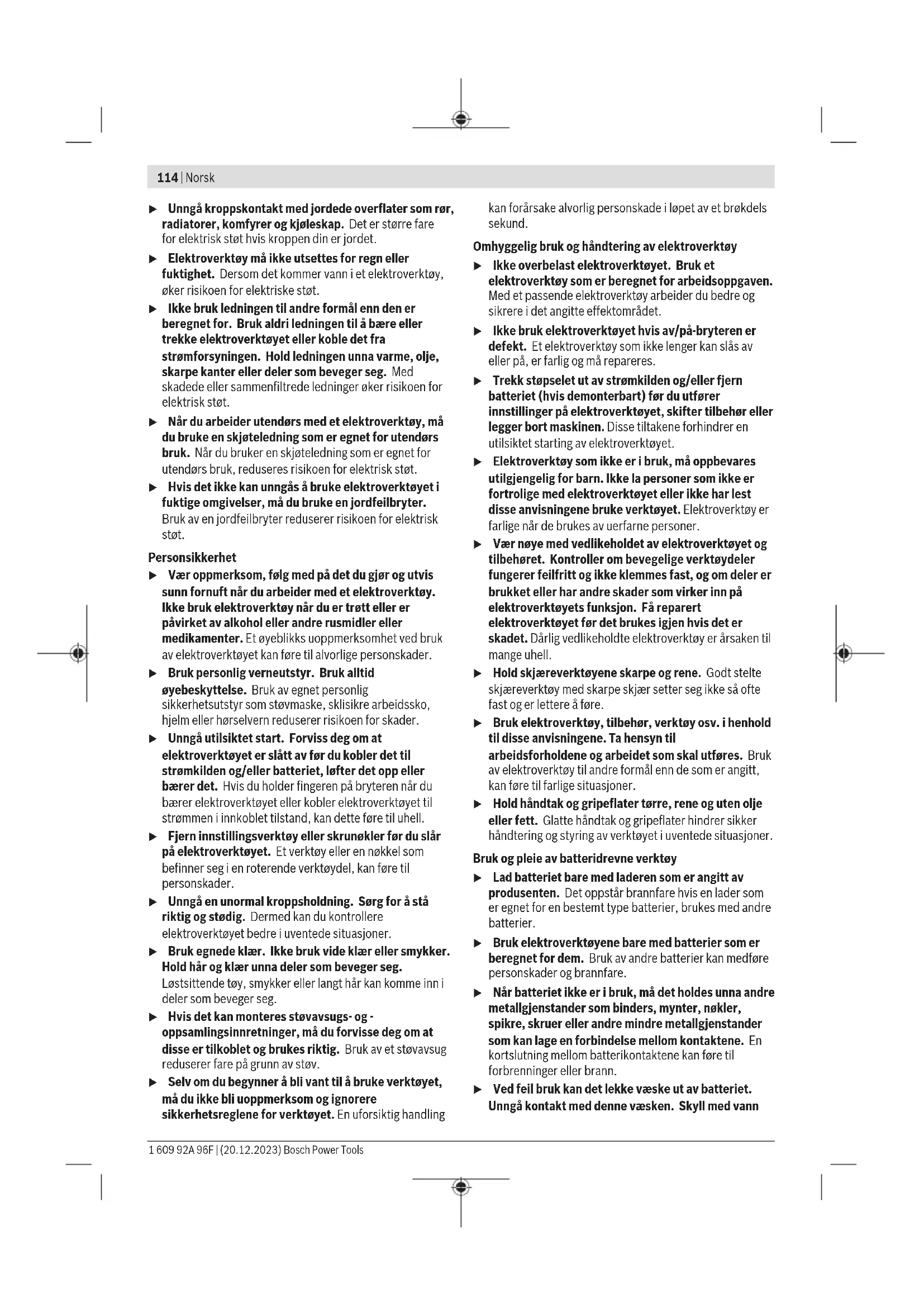 1,5 1,5 Bosch Power Tools 1 609 92A 96F | (20.12.2023)118 | Norsk Vibrasjonsnivået og støyemisjonen som er angitt i disse anvisningene er målt i samsvar med en standardisert målemetode og kan brukes til sammenligning av elektroverktøy. Verdiene egner seg også til en foreløpig estimering av vibrasjonsnivået og støyutslippet. Angitt vibrasjonsnivå og støyutslipp representerer de hovedsakelige bruksområdene til elektroverktøyet. Men hvis elektroverktøyet brukes til andre formål, med andre innsatsverktøy eller utilstrekkelig vedlikehold, kan vibrasjonsnivået og støyutslippet avvike fra det som er angitt. Dette kan føre til en betydelig økning av vibrasjonsnivået og støyutslippet for hele arbeidstidsrommet. For en nøyaktig vurdering av vibrasjonsnivået og støyutslippet skal det også tas hensyn til de tidene verktøyet er slått av, eller går, men ikke faktisk er i bruk. Dette kan redusere vibrasjonsnivået og støyutslippet for hele arbeidstidsrommet betraktelig. Bestem ekstra sikkerhetstiltak til beskyttelse av brukeren mot vibrasjonenes virkning, som for eksempel: Vedlikehold av elektroverktøy og innsatsverktøy, holde hendene varme, organisere arbeidsforløpene. Informasjon om støvutslipp medGDE18V-16 Verdier for støvutslipp fastsatt i henhold tilEN50632-2-6: Alveolært støv: <0,5mg/m