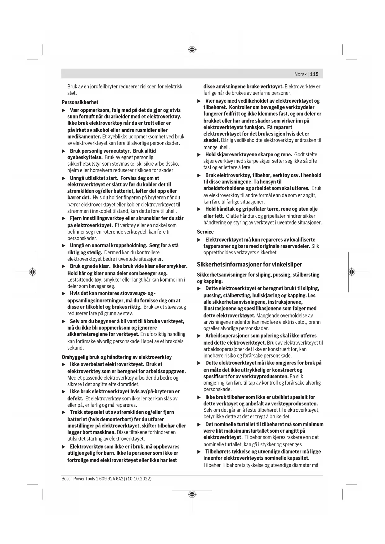 De angitte verdiene for turtallstrinnene er veiledende. Montering Montere verneinnretning u Før alle arbeider på elektroverktøyet utføres må støpselet trekkes ut av stikkontakten. Merknad: Etter brudd på slipeskiven under drift eller skader på festeinnretningene på vernedekselet/elektroverktøyet må elektroverktøyet omgående sendes inn til kundeservice. Adresser se avsnittet "Kundeservice og kundeveiledning". Vernedeksel for sliping Legg vernedekselet (11) på festet på elektroverktøyet. Kodetappene på vernedekselet skal stemme overens med festet. Mens du gjør dette, trykker du på utløserspaken (1) og holder den inne. Trykk vernedekselet (11) på spindelhalsen helt til kragen på vernedekselet sitter på flensen til elektroverktøyet, og drei vernedekselet til det høres at det festes. Tilpass plasseringen av vernedekselet (11) etter arbeidsoperasjonen. Dette gjør du ved å trykke utløserspaken (1) opp og dreie vernedekselet (11) til ønsket stilling. u Still alltid inn vernedekselet (11) slik at begge tappene på utløserspaken (1) griper inn i de tilsvarende utsparingene til vernedekselet (11). u Still inn vernedekselet (11) slik at gnistregn i retning brukeren unngås. u Vernedekselet (11) skal bare kunne dreies ved aktivering av utløserspaken (1) ! Ellers må 1 609 92A 6A2 | (10.10.2022) Bosch Power ToolsNorsk | 121 elektroverktøyet ikke brukes videre og må leveres til kundeservice. Merknad: Kodetappene på vernedekselet (11) sikrer at bare et vernedeksel som passer til elektroverktøyet, kan monteres. Vernedeksel for kapping u Ved kapping må du alltid bruke vernedekselet for kapping(13) eller vernedekselet for sliping (11) sammen med beskyttelsen for kapping (15). u Sørg for tilstrekkelig støvavsug ved kapping i stein. Vernedekselet for kapping(13) monteres som vernedekselet for sliping(11). Deksel for kapping av metall Montere beskyttelsen for kapping(15) av metall på vernedekselet for sliping(11) (se bildeA): Sving festebøylen tilbake (➊). Sett beskyttelsen(15) på vernedekselet for sliping(11) (➋). Trykk festebøylen fast på vernedekselet(11) (➌). For å demontere (se bildeB) trykker du på knappen på festebøylen (➊) og svinger den tilbake (➋). Trekk beskyttelsen(15) fra vernedekselet (11) (➌). Deksel for kapping av plast Sett beskyttelsen for kapping(15) av plast på vernedekselet for sliping(11) (se bildeC). Beskyttelsen(15) festes hørbart på vernedekselet(11). For å demontere (se bildeD) løsner du beskyttelsen(15) på vernedekselet(11) (➊) til venstre eller høyre og trekker beskyttelsen av (➋). Støvavsugsdeksel for kapping med styreskinner Avsugshetten for kapping med styreskinne(27) monteres som vernedekselet for sliping. Ekstrahåndtaket(9)/(10) festes av bøylen på vernedekselet, helt til girkassehuset, slik at elektroverktøyet blir fast forbundet med vernedekselet. En egnet støvsuger fra Bosch kan kobles til støvavsugsdekselet med styreskinne(27). Du setter da støvsugerslangen med støvsugeradapteren i den beregnede festestussen på støvavsugsdekselet. Merknad: Friksjonen som oppstår av støvet i sugeslangen og tilbehøret under arbeidet forårsaker en elektrostatisk oppladning som brukeren kan oppleve som statisk utladning (avhengig av omgivelsesfaktorer og brukerens fysiologiske tilstand). Bosch anbefaler generelt å bruke en antistatisk sugeslange (tilbehør) til fjerning av fint støv og tørre materialer. Håndbeskyttelse u Monter alltid håndbeskyttelsen når du skal arbeide med gummislipeskiven (20) eller koppbørsten / skivebørsten / den koniske børsten / diamantborekronen (19). Fest håndbeskyttelsen (19) med ekstrahåndtaket (9). Standard ekstrahåndtak / vibrasjonsdempende ekstrahåndtak Skru fast ekstrahåndtaket(9)/(10) til høyre eller venstre på girhodet, avhengig av hvordan du arbeider. u Bruk ikke elektroverktøyet uten ekstrahåndtaket (9)/ (10). u Du må ikke fortsette å bruke elektroverktøyet hvis ekstrahåndtaket (9)/(10) er skadet. Du må ikke foreta noen endringer på ekstrahåndtaket(9)/(10). Det vibrasjonsdempende ekstrahåndtaket(10) gir mulighet til sikrere og mer komfortabelt arbeid med lite vibrasjoner. Montere og demontere slipeverktøy Vær oppmerksom på de spesielle monteringsanvisningene i forbindelse med X-LOCK-innsatsverktøy. u Før alle arbeider på elektroverktøyet utføres må støpselet trekkes ut av stikkontakten. u Ikke berør slipe- og kappeskiver før de er avkjølt. Skivene blir svært varme under arbeidet. u Bruk bare originale X-LOCK-innsatsverktøy som er merket med X-LOCK-logoen. Bare originale X-LOCK- innsatsverktøy sikrer at fastspenningstykkelsen på maks. 1,6mm overholdes. En høyere fastspenningstykkelse kan føre til usikker fastspenning, slik at spennverktøyet kan løsne. u X-LOCK-innsatsverktøy trenger ingen ekstra spenn- og støtteflenser. u Det må ikke finnes smuss og partikler på innsatsverktøyet og festet, og de må ikke være deformert. Vær oppmerksom på målene til slipeverktøyet. Kontroller at begge X-LOCK-låsene er åpnet (se bildet under) før du monterer X-LOCK-innsatsverktøyet. Rengjør eventuelt området mellom de to X-LOCK-låsene. Montere slipeverktøy ➊ Legg slipe-/kappe-/lamellslipeskiven sentrert og parallelt med anleggsflaten og med riktig side opp på X- LOCK-holderen. ➋ Trykk skiven i retning holderen. ➌ Det høres at skiven låses. Du må ikke aktivere håndtaket (3). Bosch Power Tools 1 609 92A 6A2 | (10.10.2022)122 | Norsk (3) u Kontroller etter monteringen at kanten på slipeverktøyet (