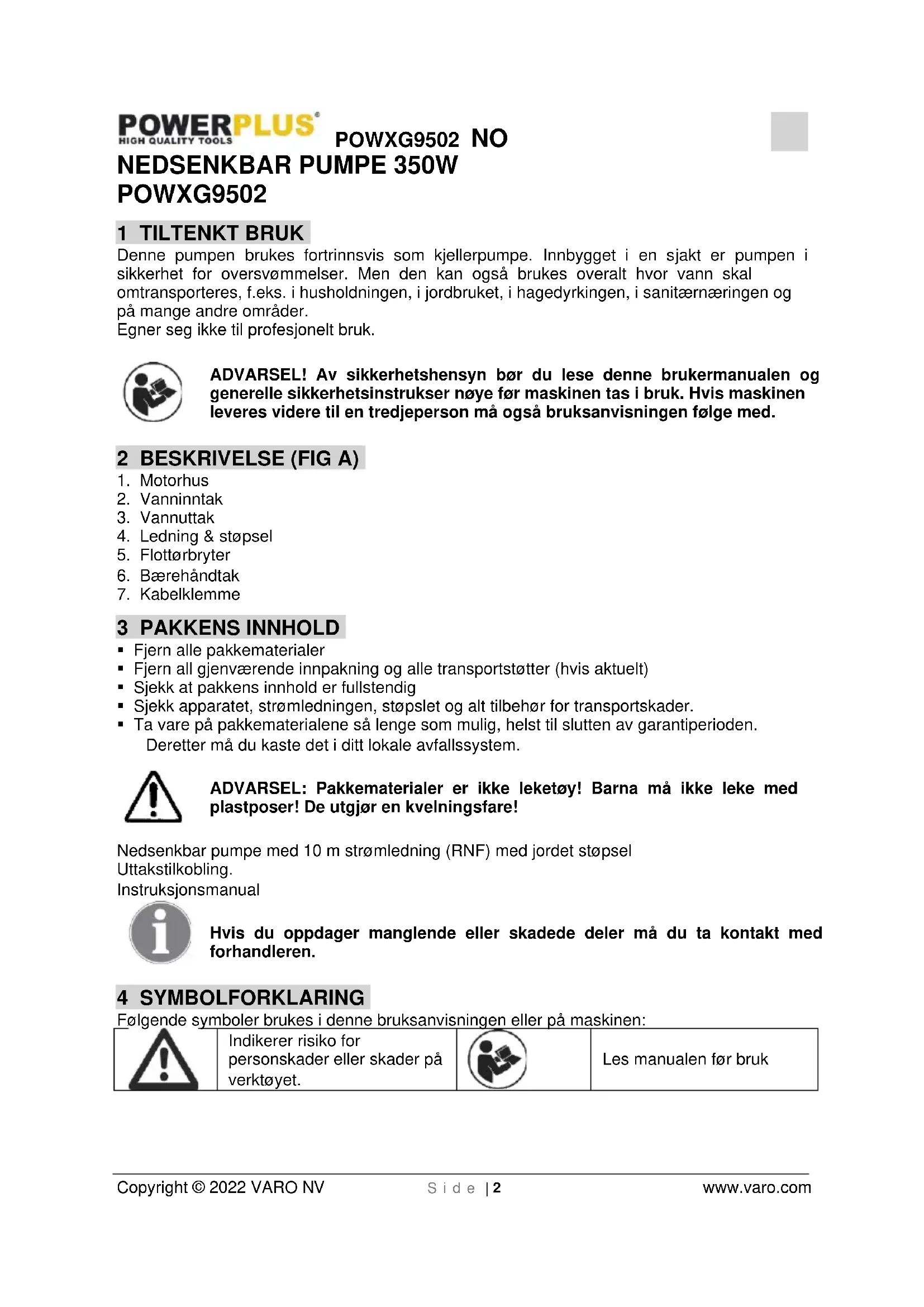 POWXG9502 1 TILTENKT BRUK Denne pumpen brukes fortrinnsvis som kjellerpumpe. Innbygget i en sjakt er pumpen i sikkerhet for oversvømmelser. Men den kan også brukes overalt hvor vann skal omtransporteres, f.eks. i husholdningen, i jordbruket, i hagedyrkingen, i sanitærnæringen og på mange andre områder. Egner seg ikke til profesjonelt bruk. ADVARSEL! Av sikkerhetshensyn bør du lese denne brukermanualen og generelle sikkerhetsinstrukser nøye før maskinen tas i bruk. Hvis maskinen leveres videre til en tredjeperson må også bruksanvisningen følge med. 2 BESKRIVELSE (FIG A)